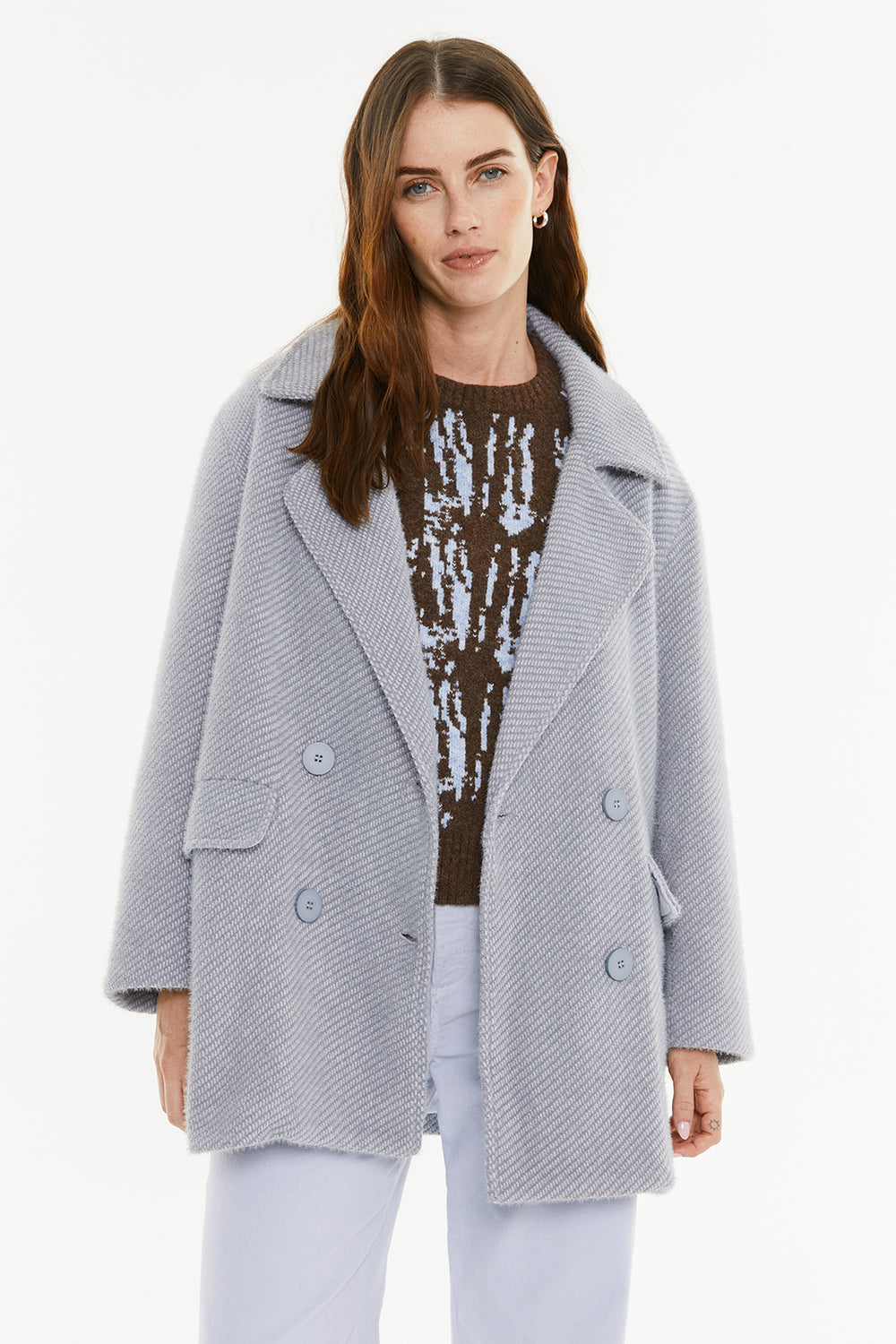 Abrigo de mujer de bouclé, escote con solapa, con cuatro botones en la parte delantera y bolsillo con tapeta. Prenda sostenible.