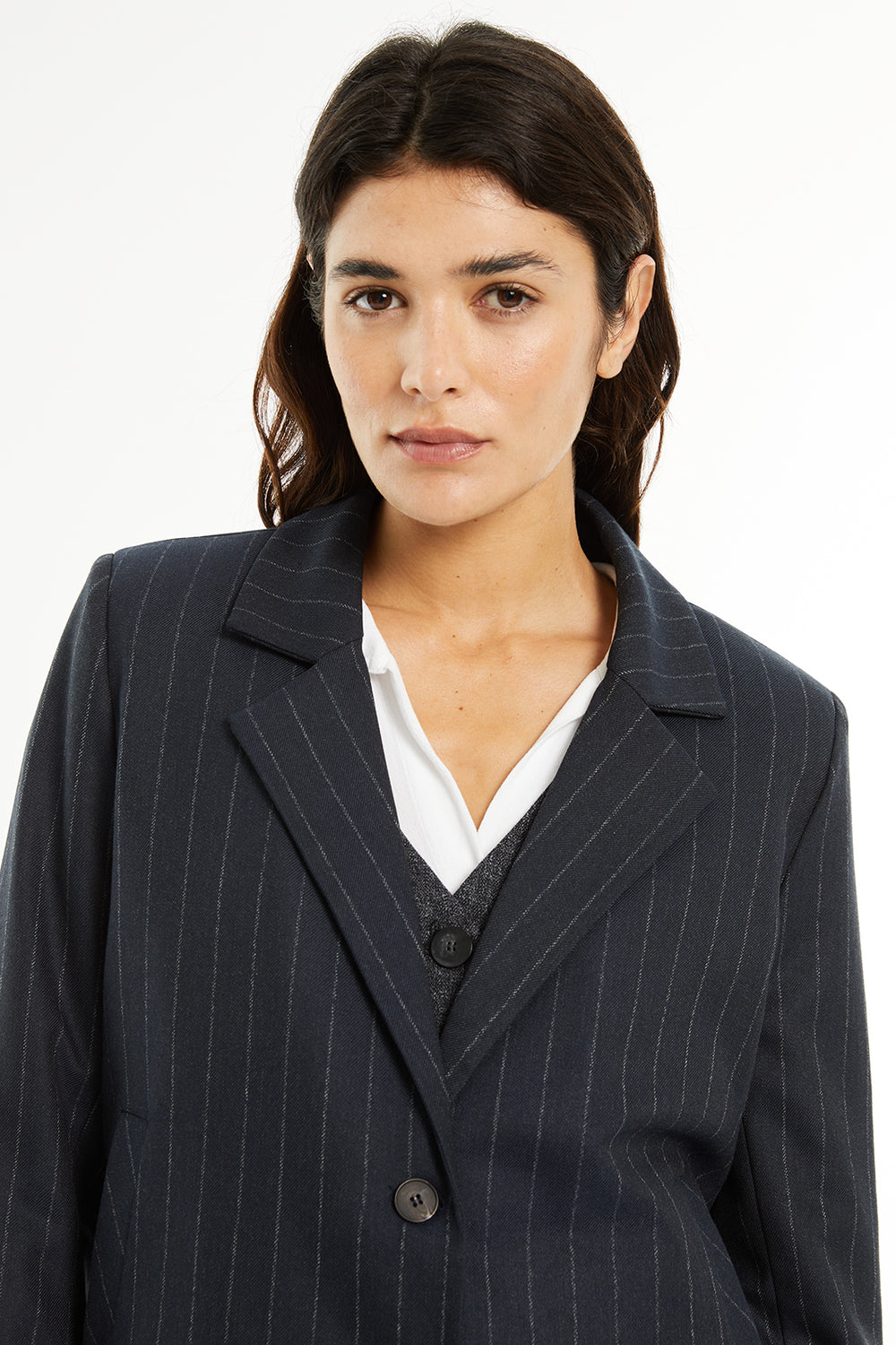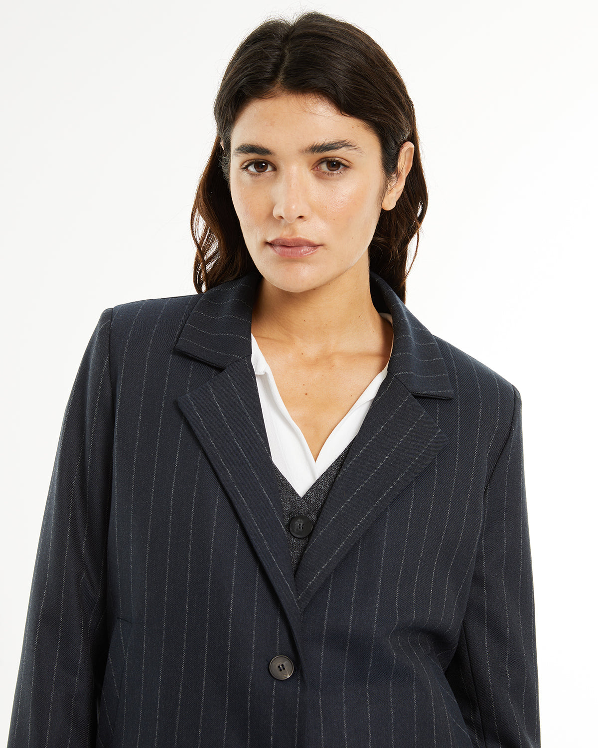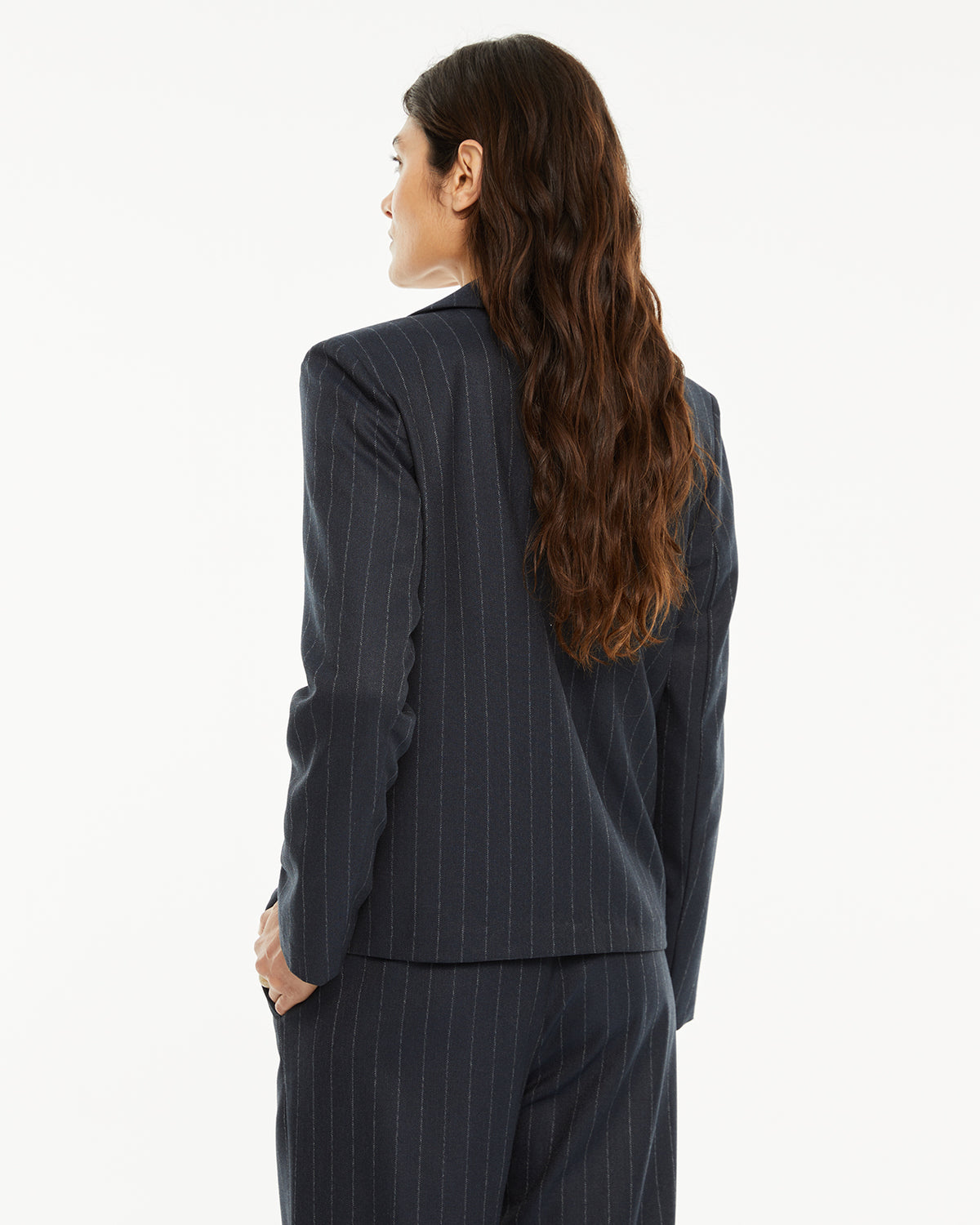 Americana de mujer con raya diplomática, escote con solapa y cierre con botones.