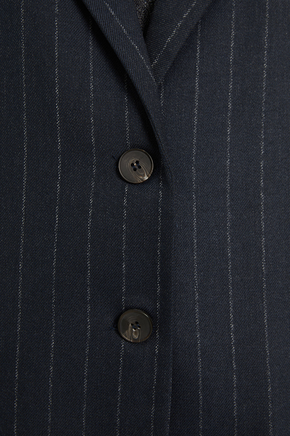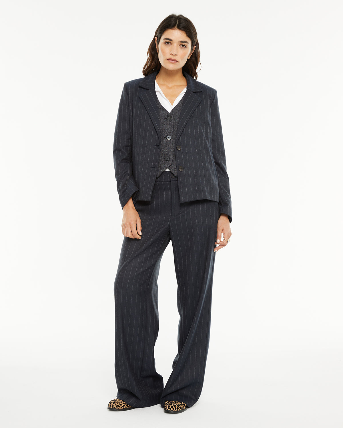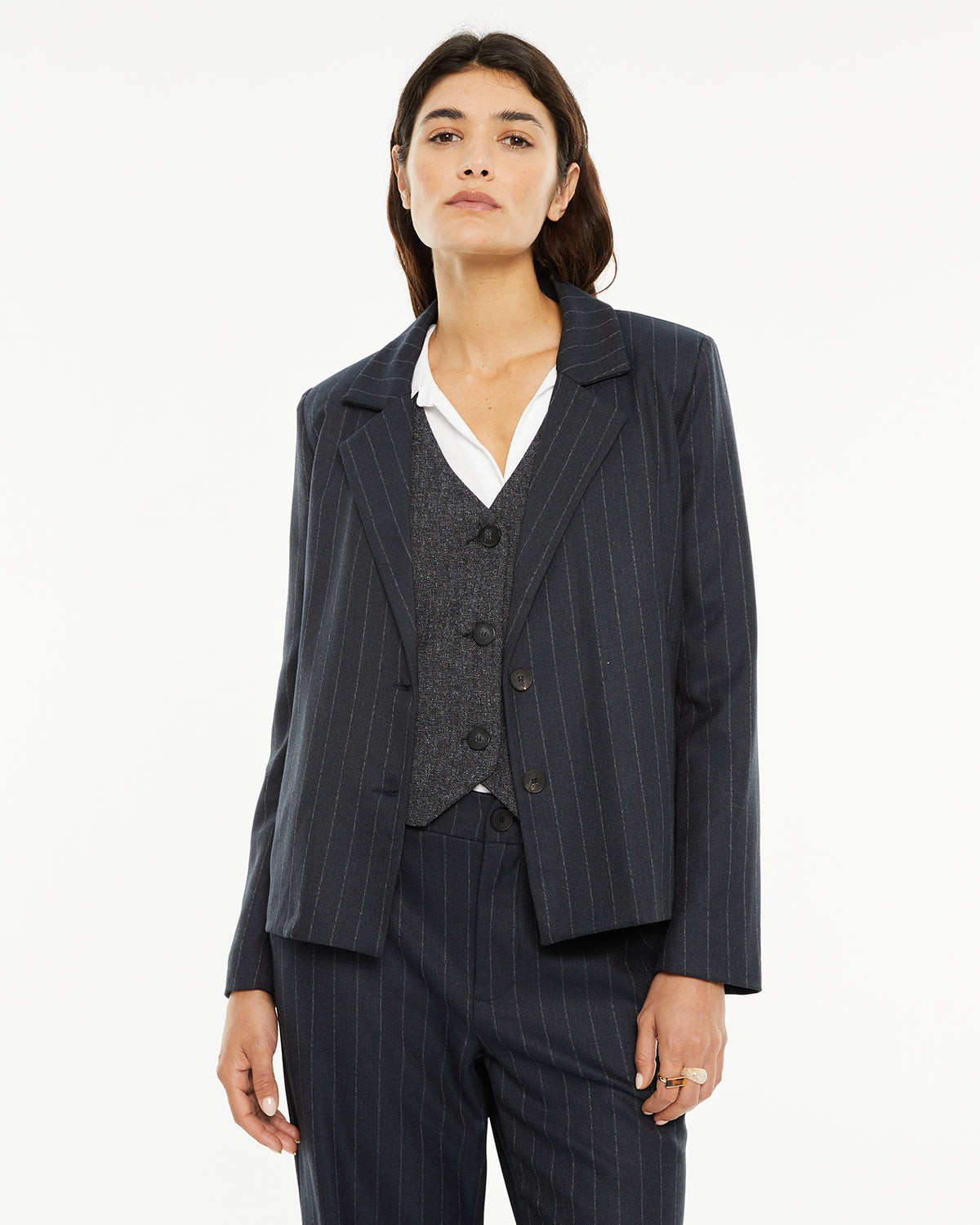 Americana de mujer con raya diplomática, escote con solapa y cierre con botones.