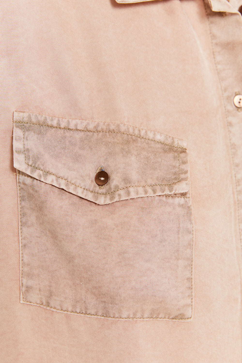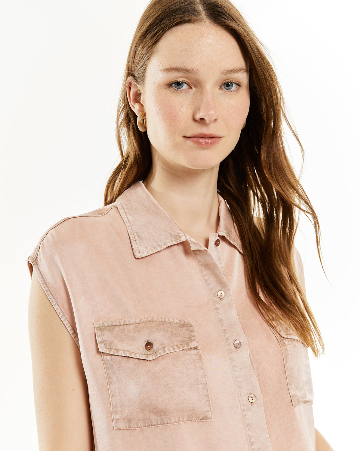 Camisa de mujer sin mangas, con cuello camisero, bolsillos plastrón en el delantero, cierre con botones y tintura en corrosivos. Prenda sostenible.