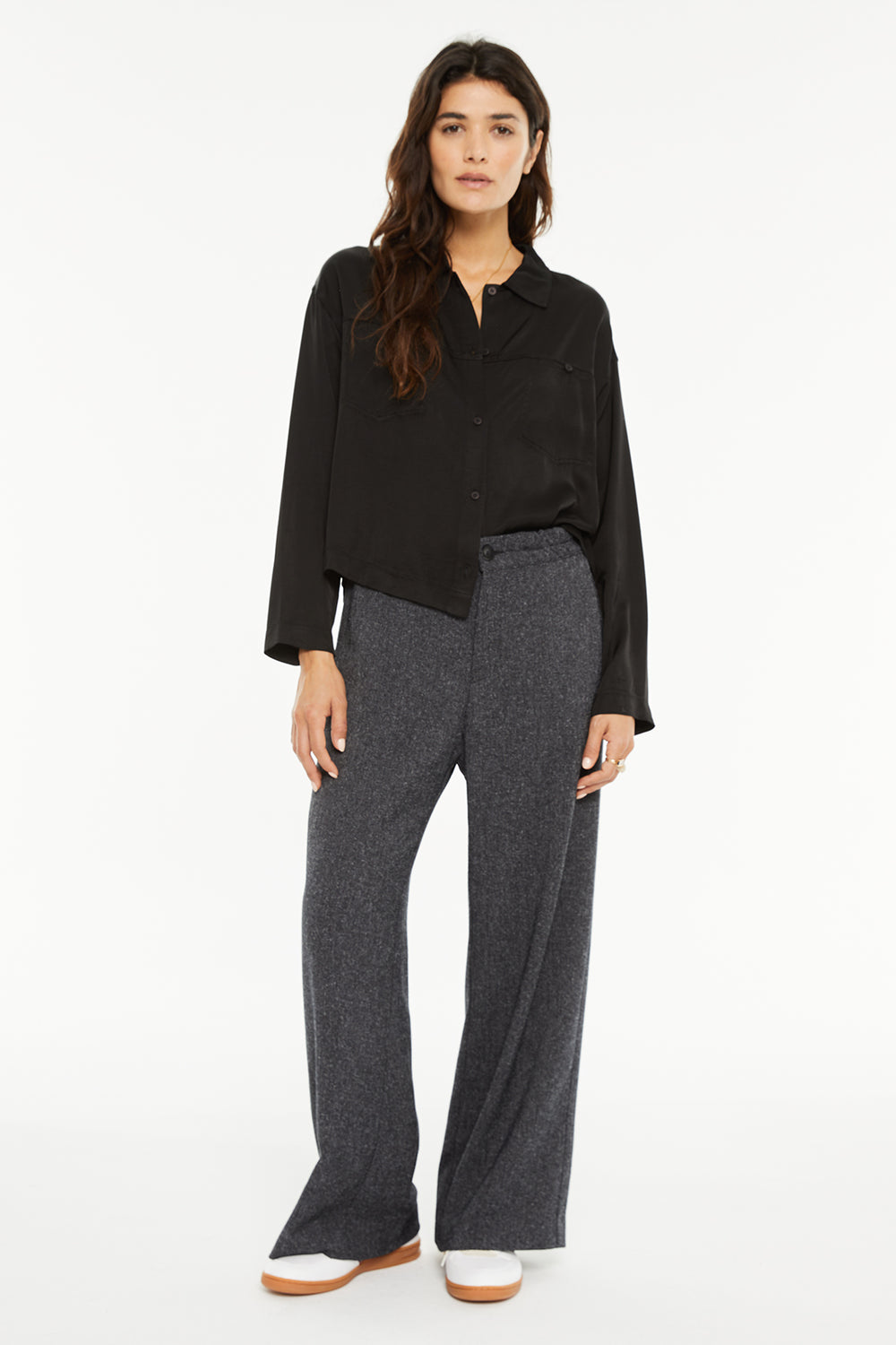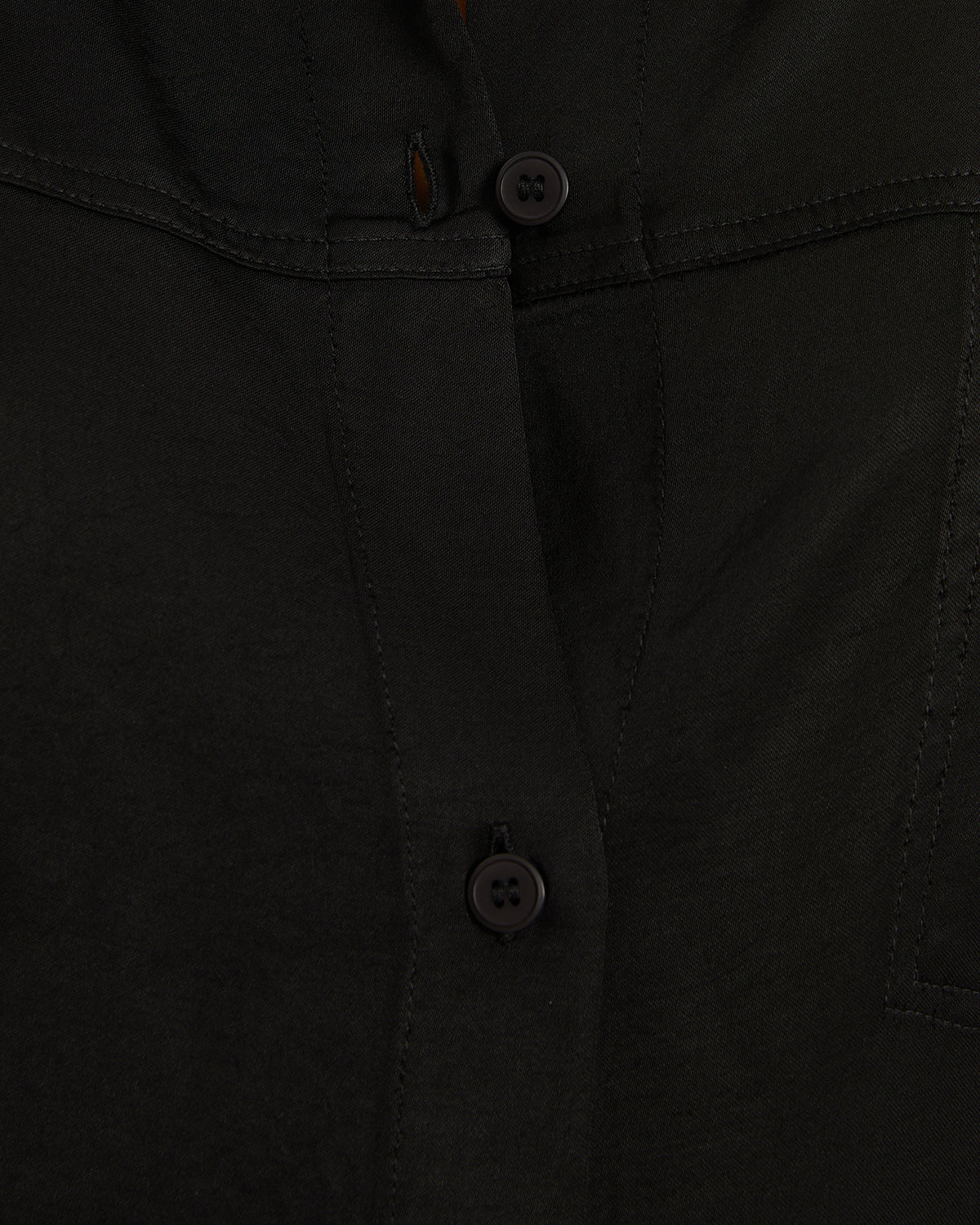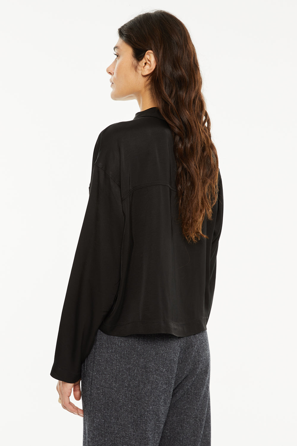 Camisa fluida de mujer, con escote camisero, detalles de bolsillos en la parte delantera y cierre con botones. Prenda sostenible.