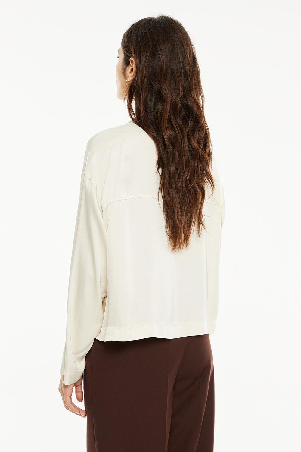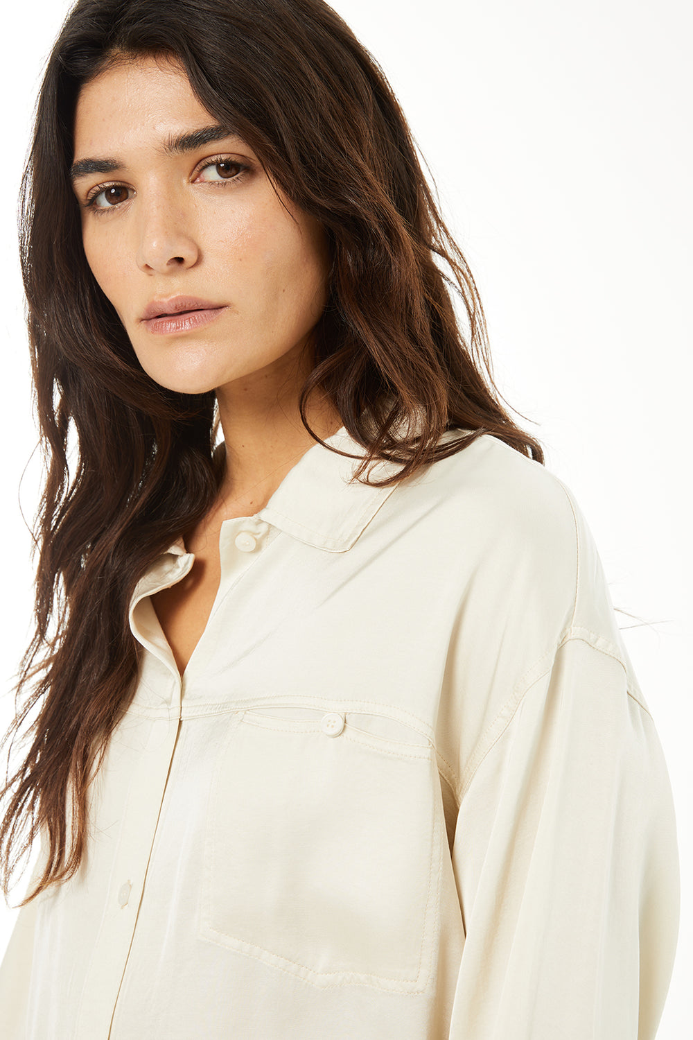 Camisa fluida de mujer, con escote camisero, detalles de bolsillos en la parte delantera y cierre con botones. Prenda sostenible.