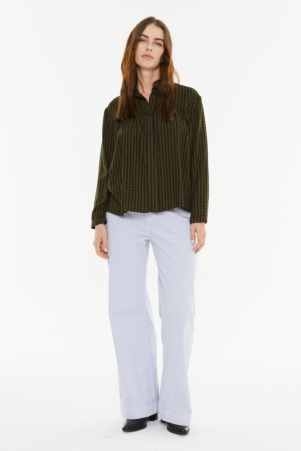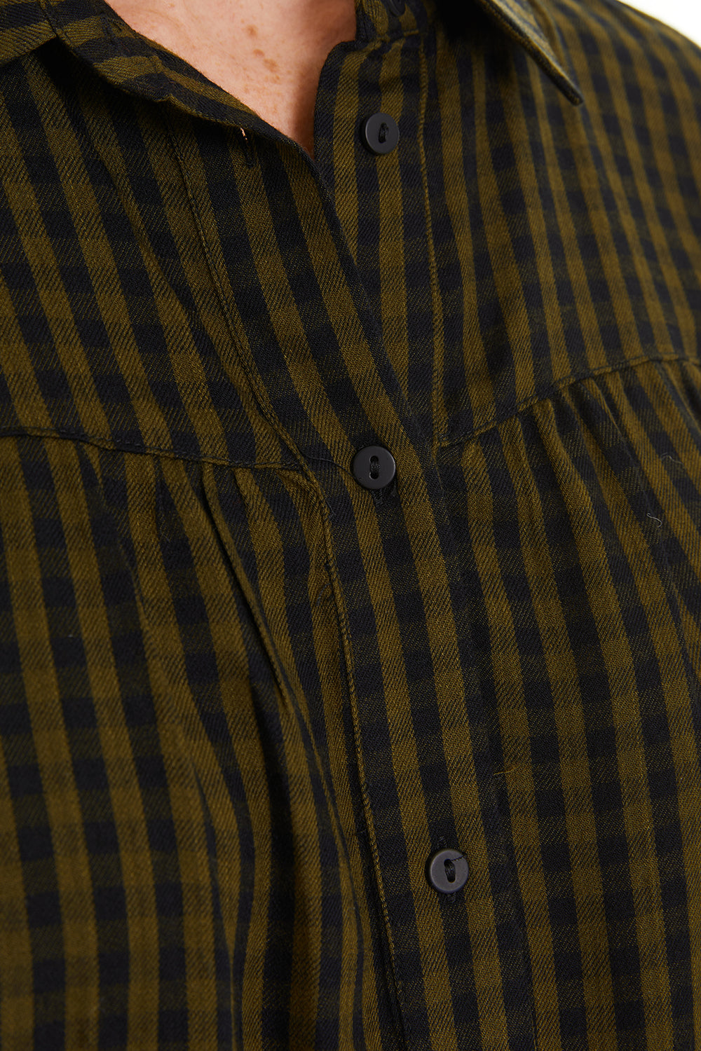 Camisa de mujer con tejido de cuadros, escote camisero y cierre con botones. Prenda sostenible.