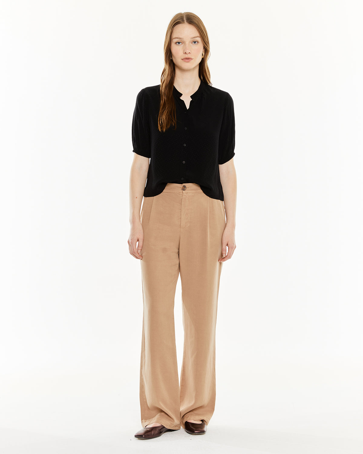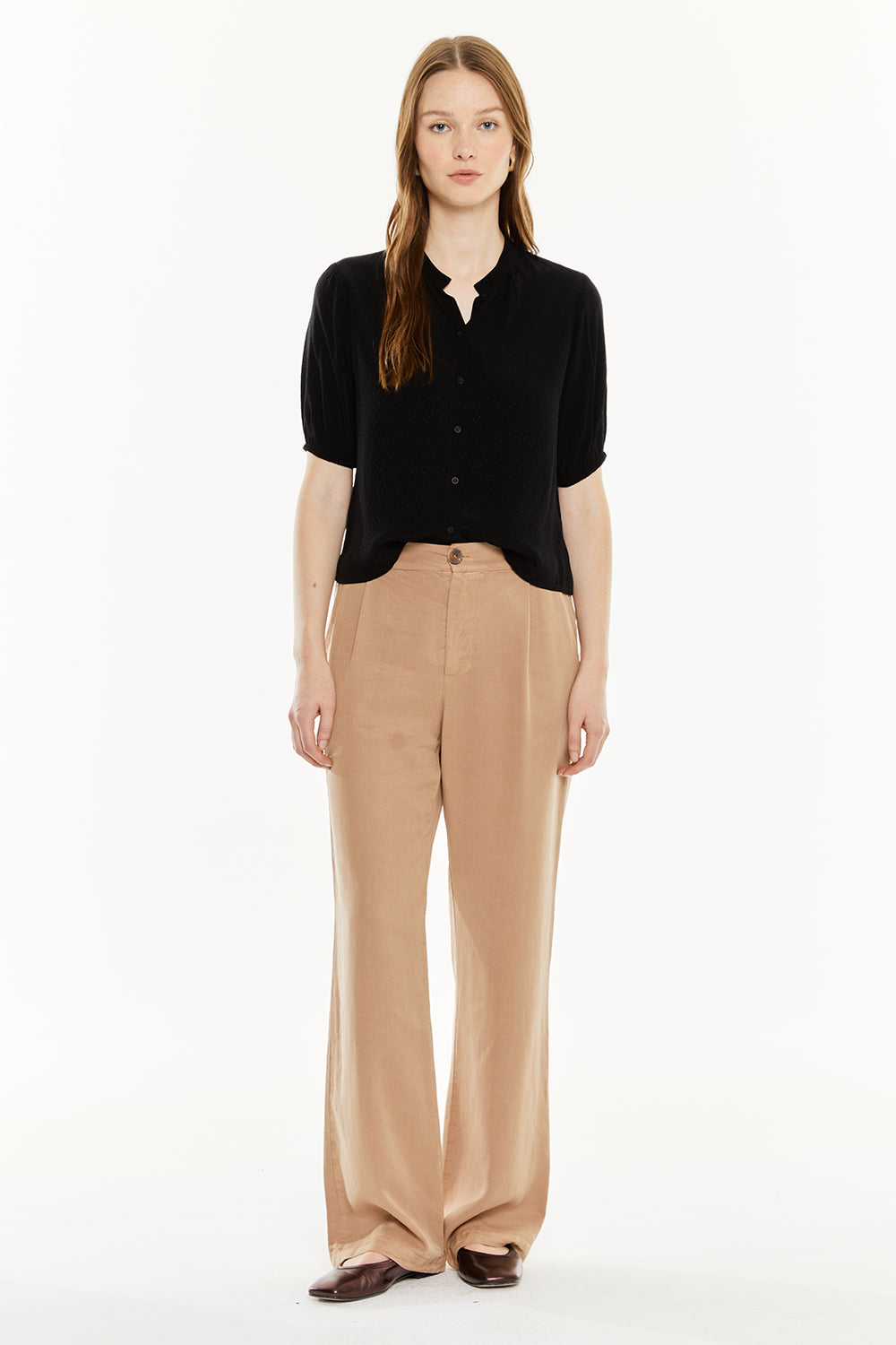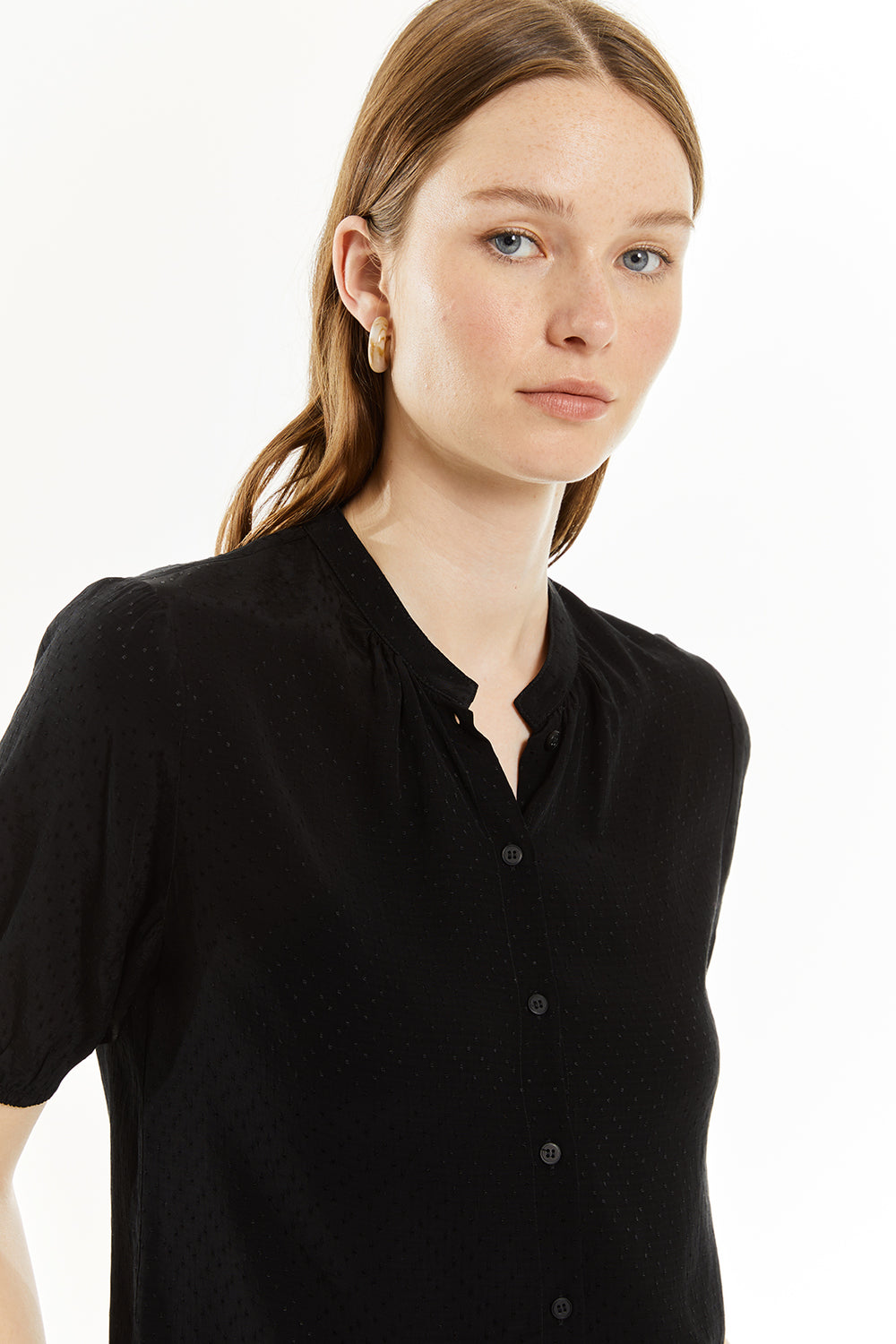 Camisa de mujer con escote redondo, mangas abullonadas con goma y cierre frontal con botones. Prenda sostenible.