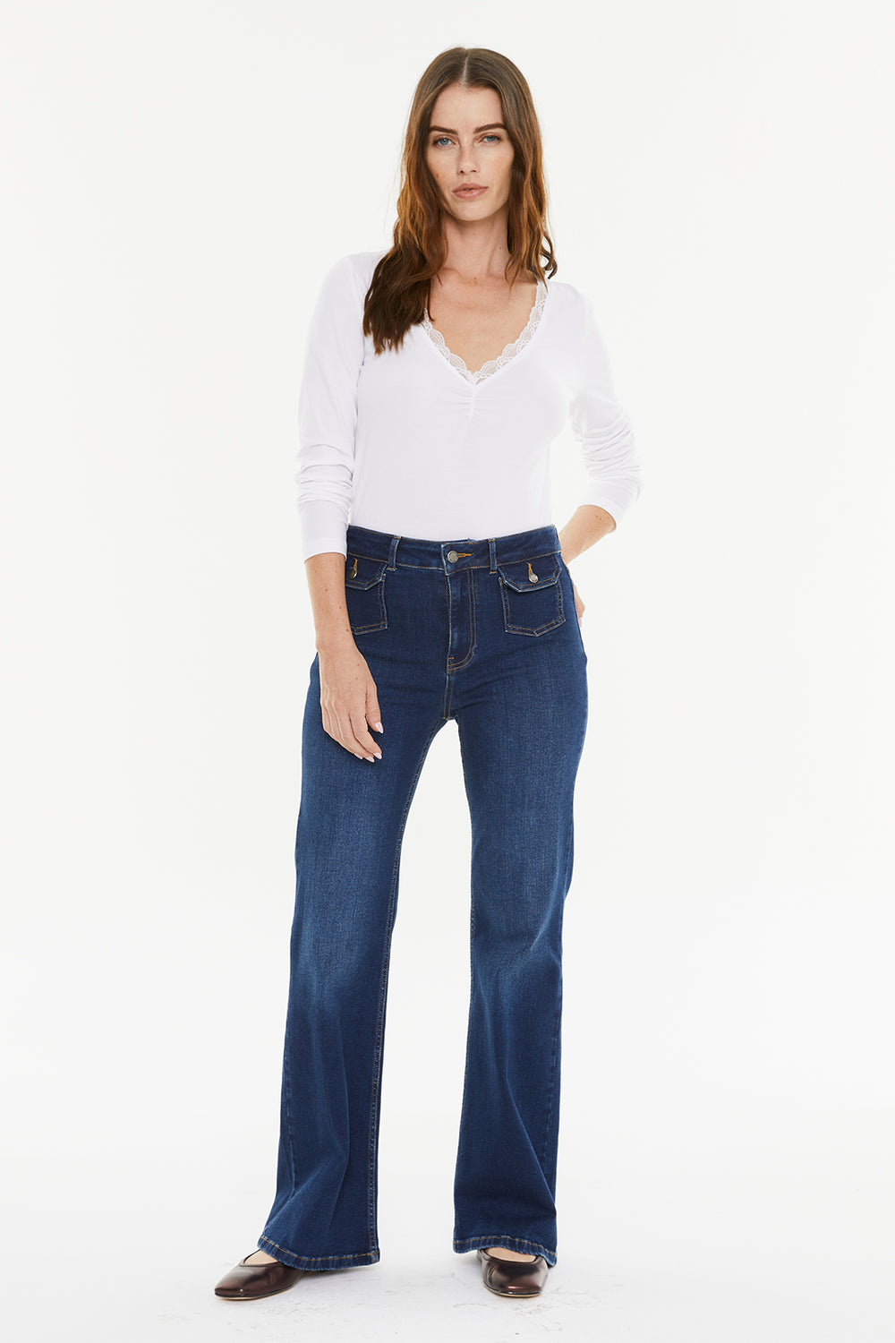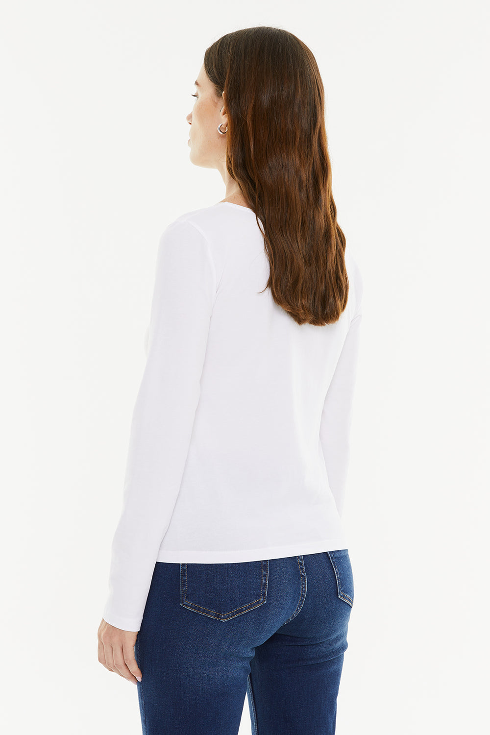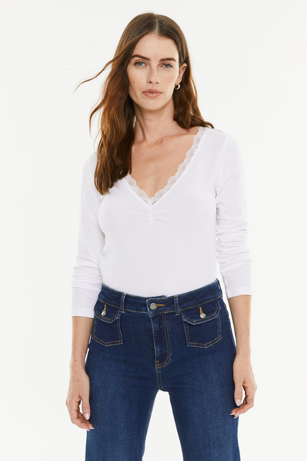 Camiseta básica de mujer, con puntilla en el escote y manga larga. Prenda sostenible.