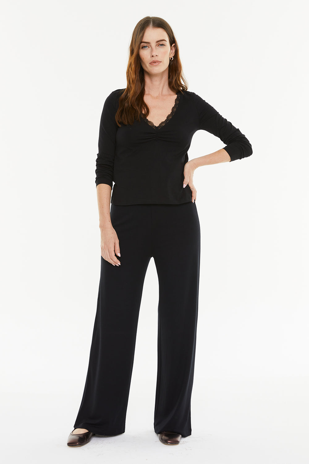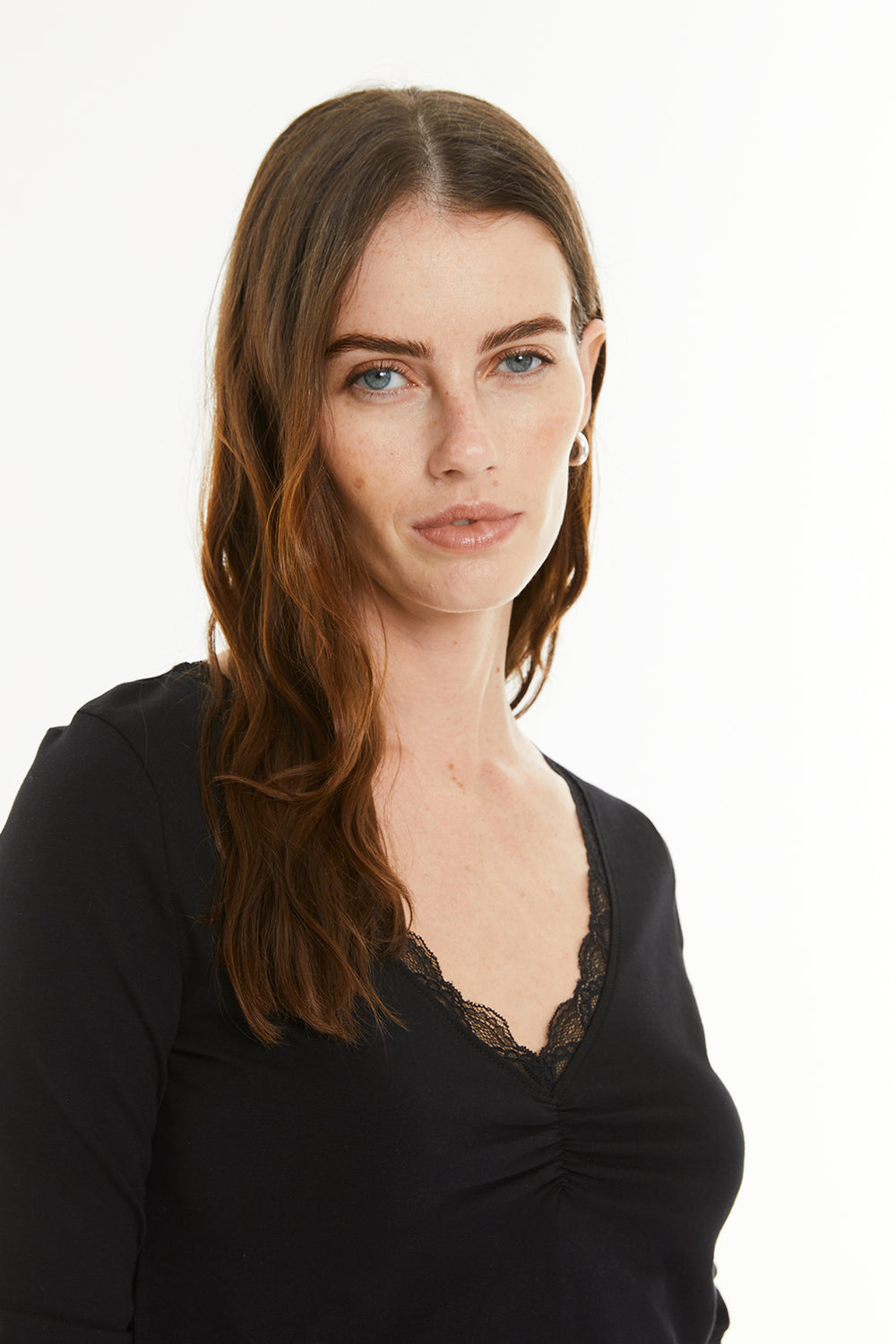 Camiseta básica de mujer, con puntilla en el escote y manga larga. Prenda sostenible.
