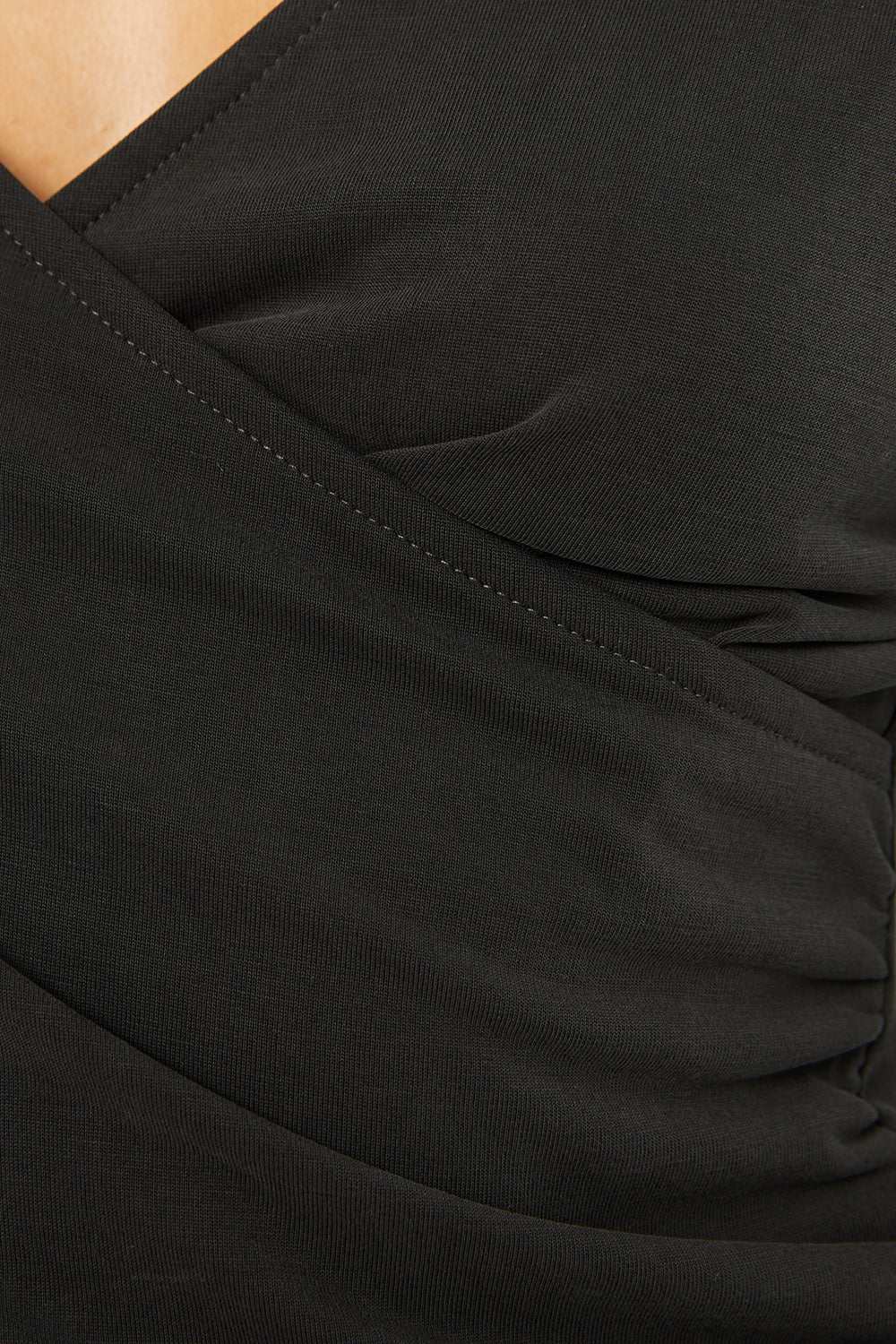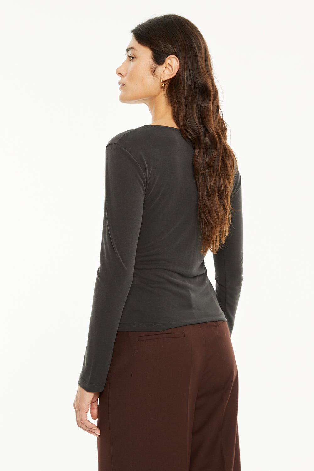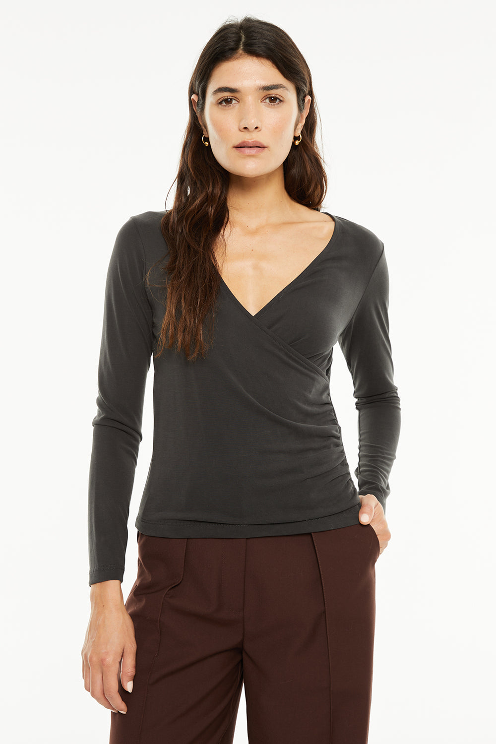 Camiseta cruzada de mujer, con frunce lateral, escote pico y manga larga. Prenda sostenible.