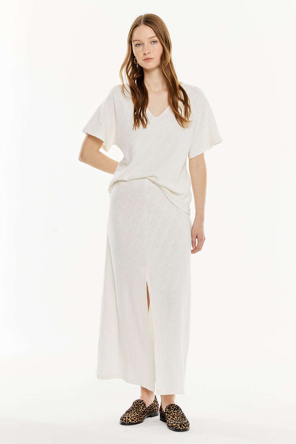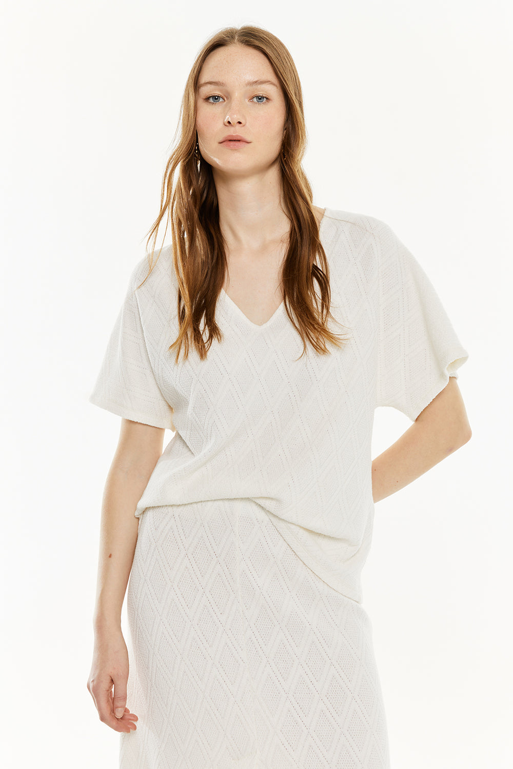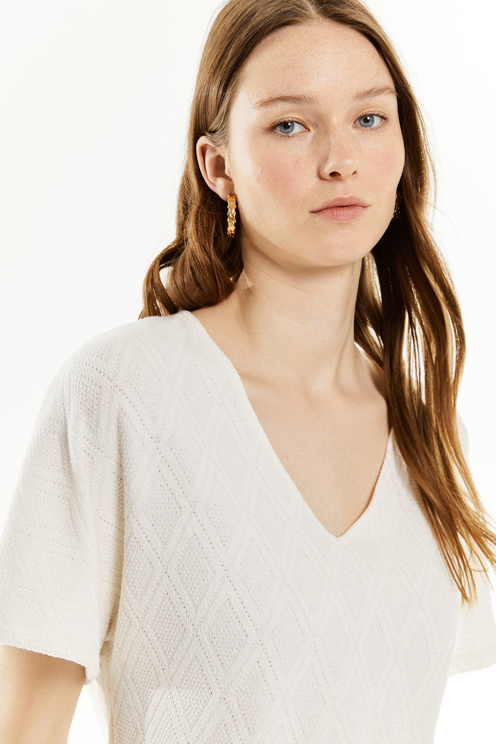 Camiseta de mujer de manga corta, escote en pico y tejido de fantasía. Prenda sostenible.
