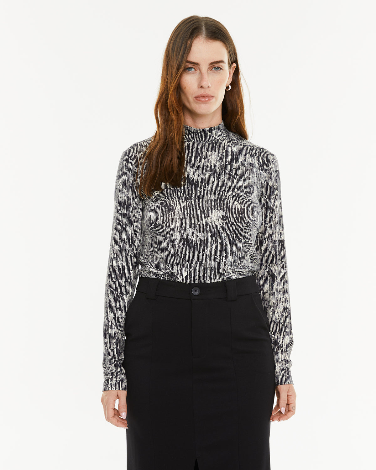 Camiseta de mujer con estampado bicolor y escote Perkins. Prenda sostenible.