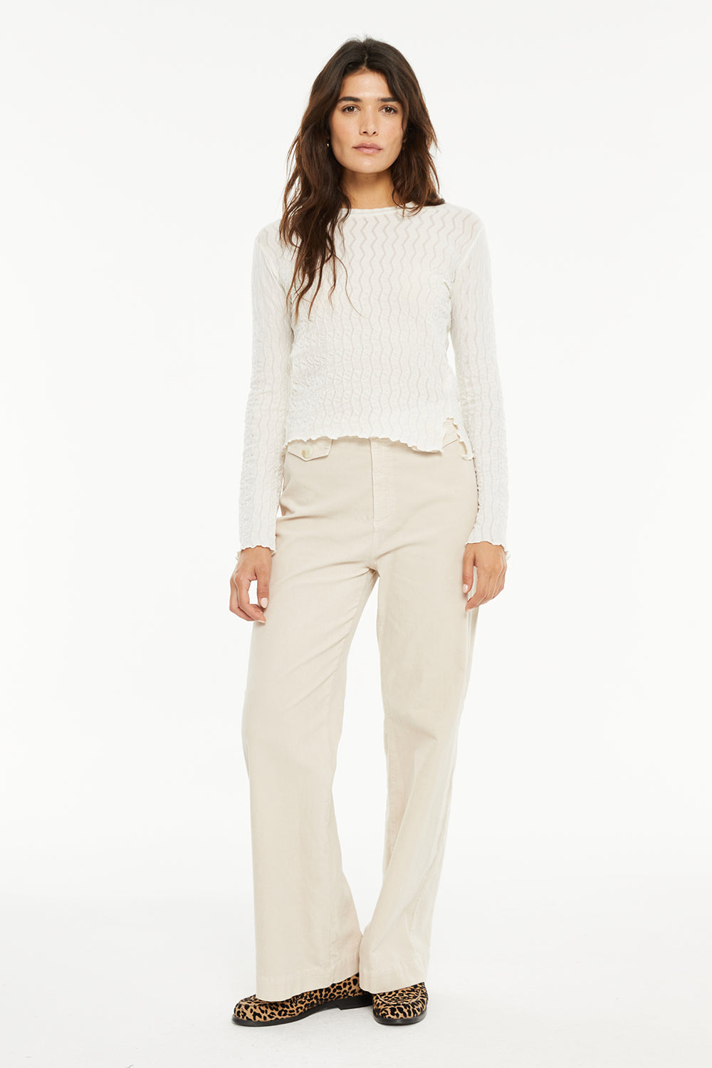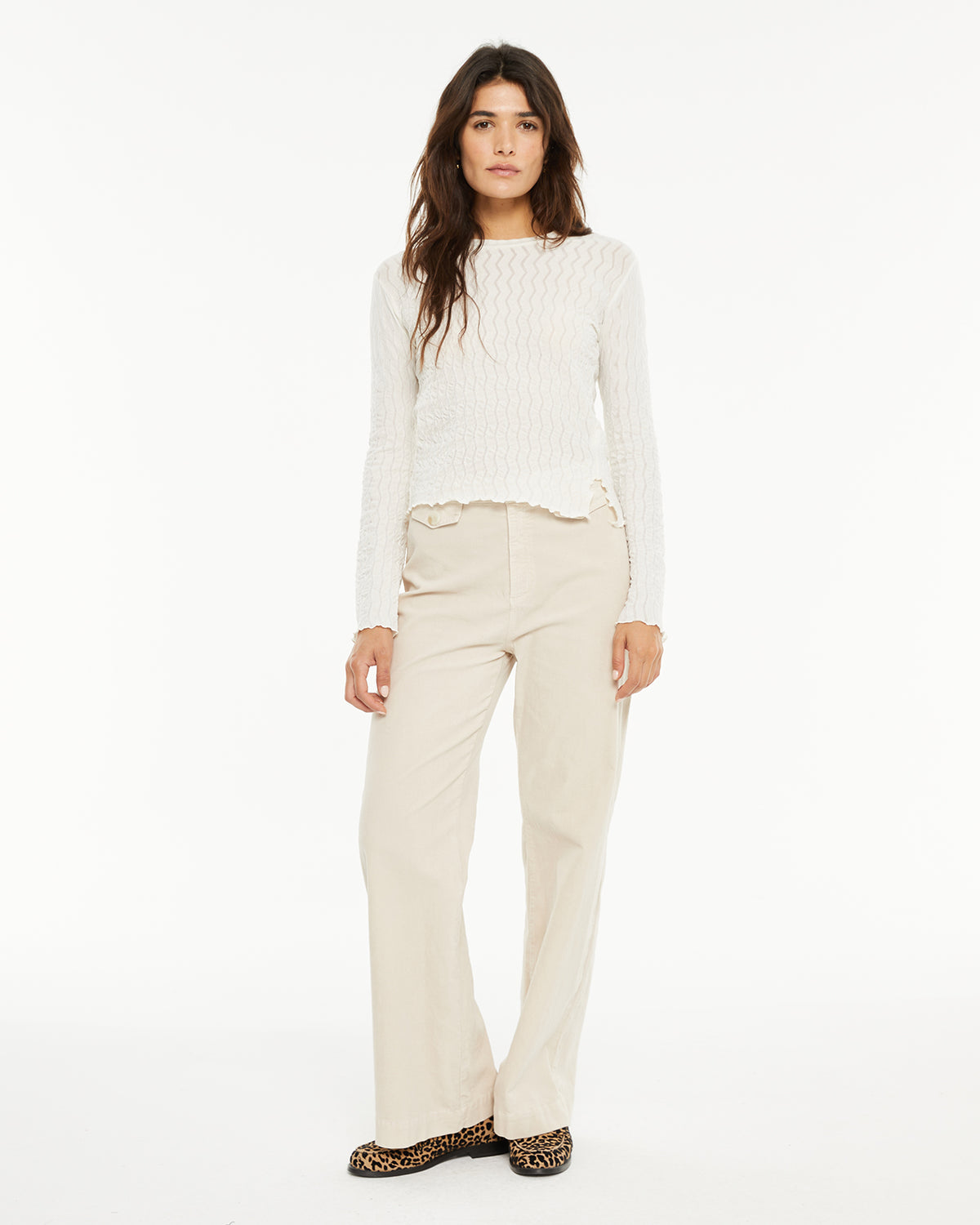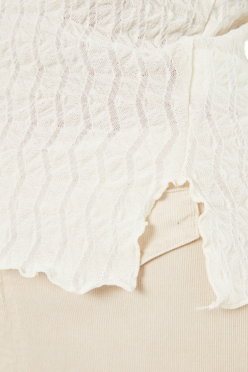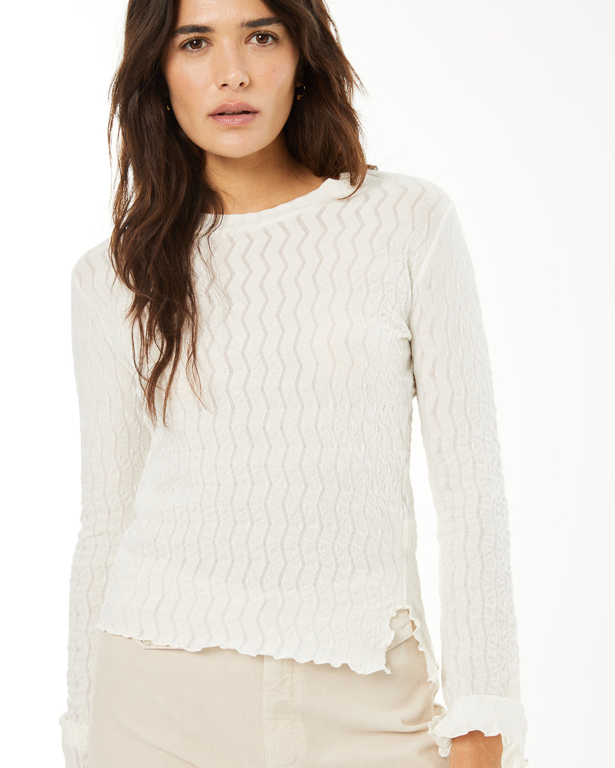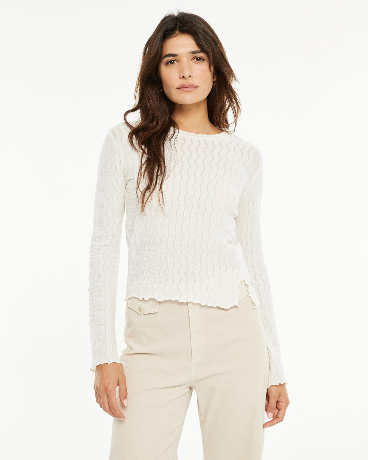 Camiseta de mujer de manga larga, con tejido de estructura, escote redondo y detalle de abertura.