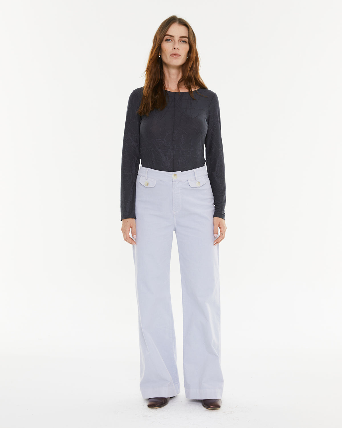 Camiseta de mujer con tejido de jacquard, escote redondo, manga larga y detalle de mini repulgo en los acabados.