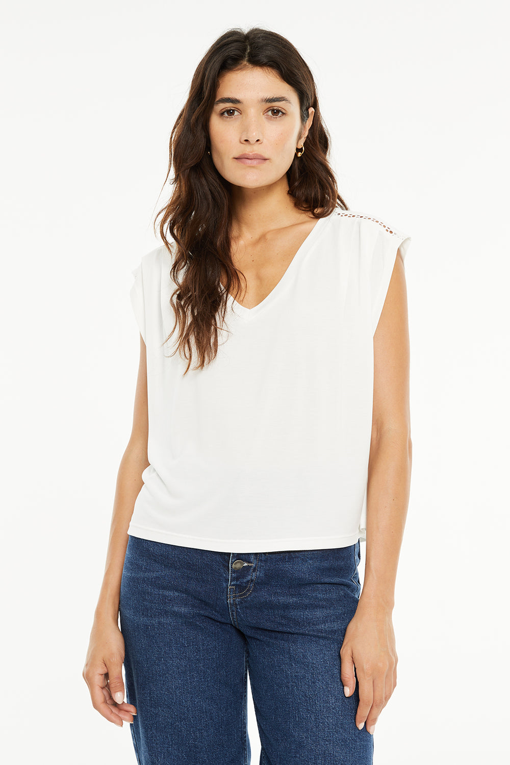 Camiseta fluida de mujer, con cuello pico y detalle de entredós en los hombros. Prenda sostenible.