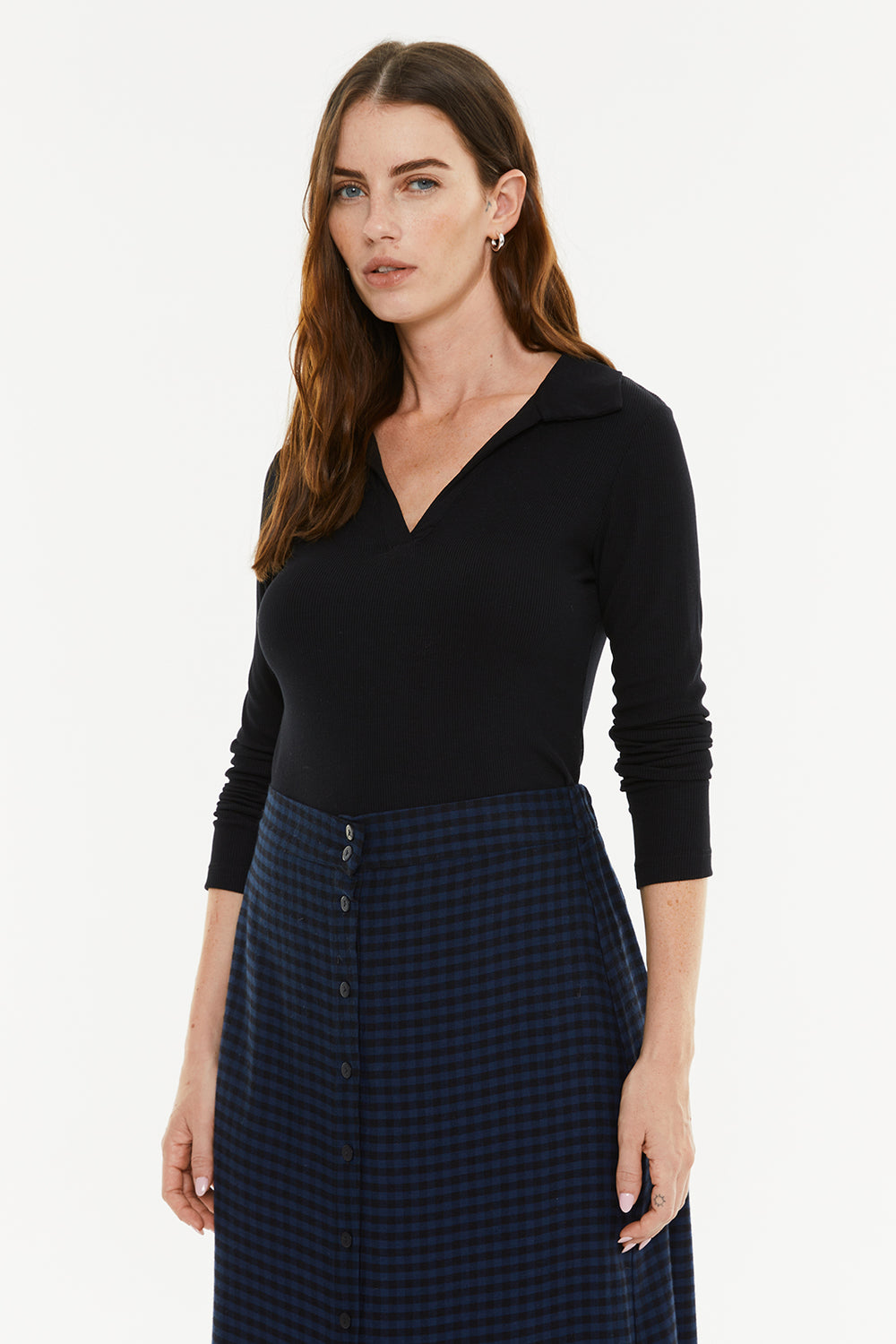Camiseta de mujer con escote polo y tejido de canalé. Prenda sostenible.