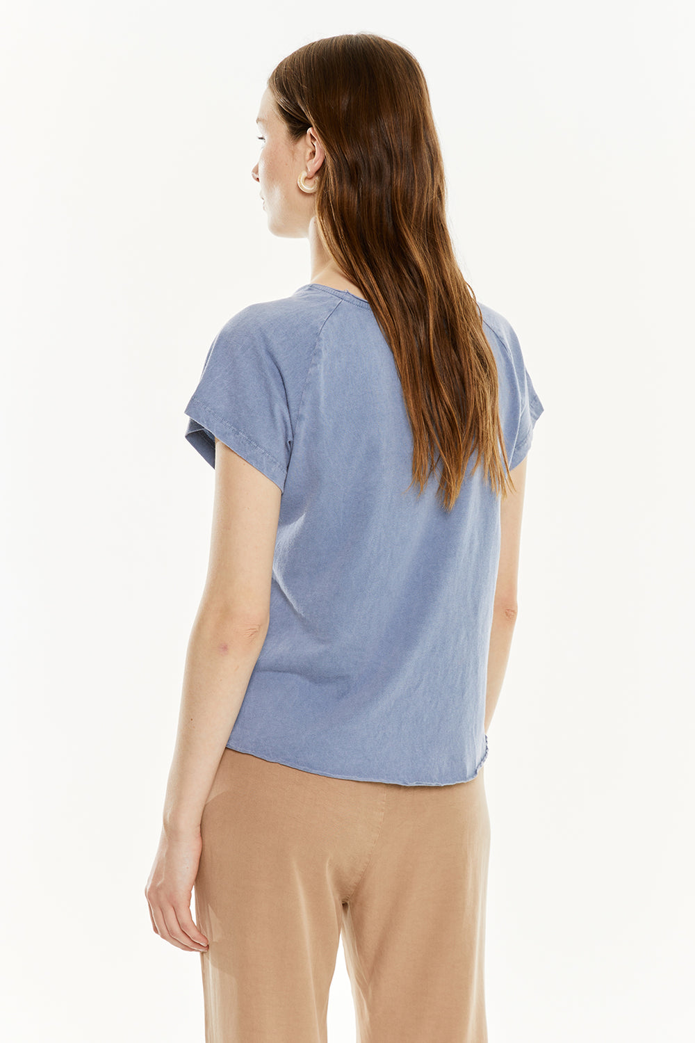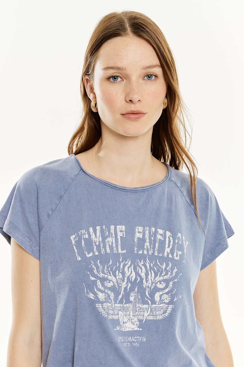 Camiseta de mujer de manga corta, con tintura efecto desgastado y estampado de una mujer. Prenda sostenible.