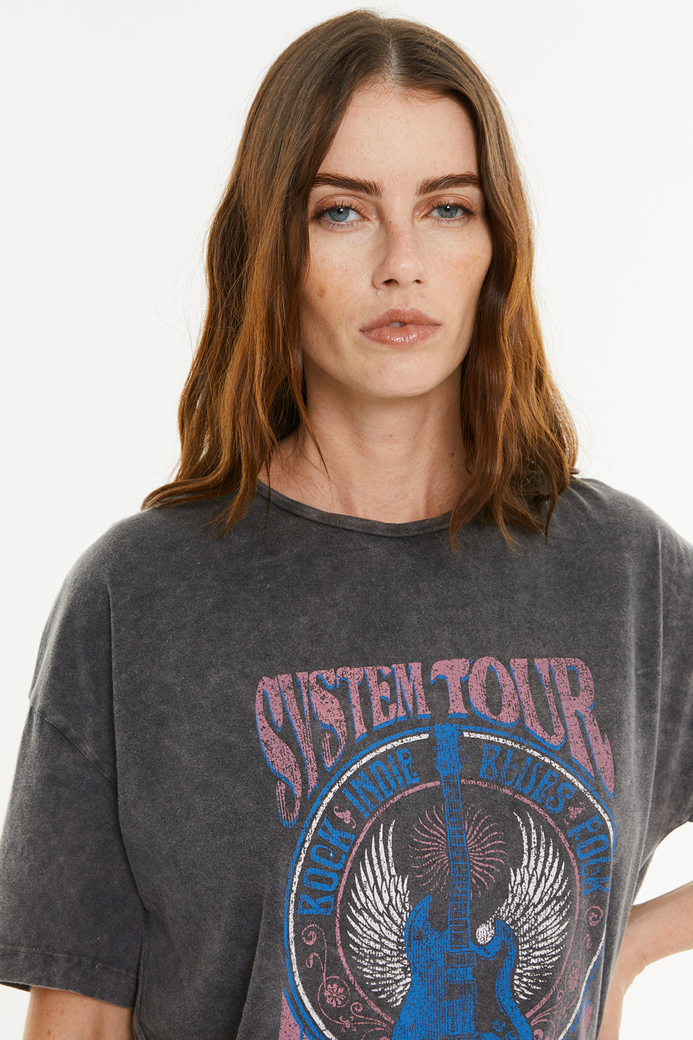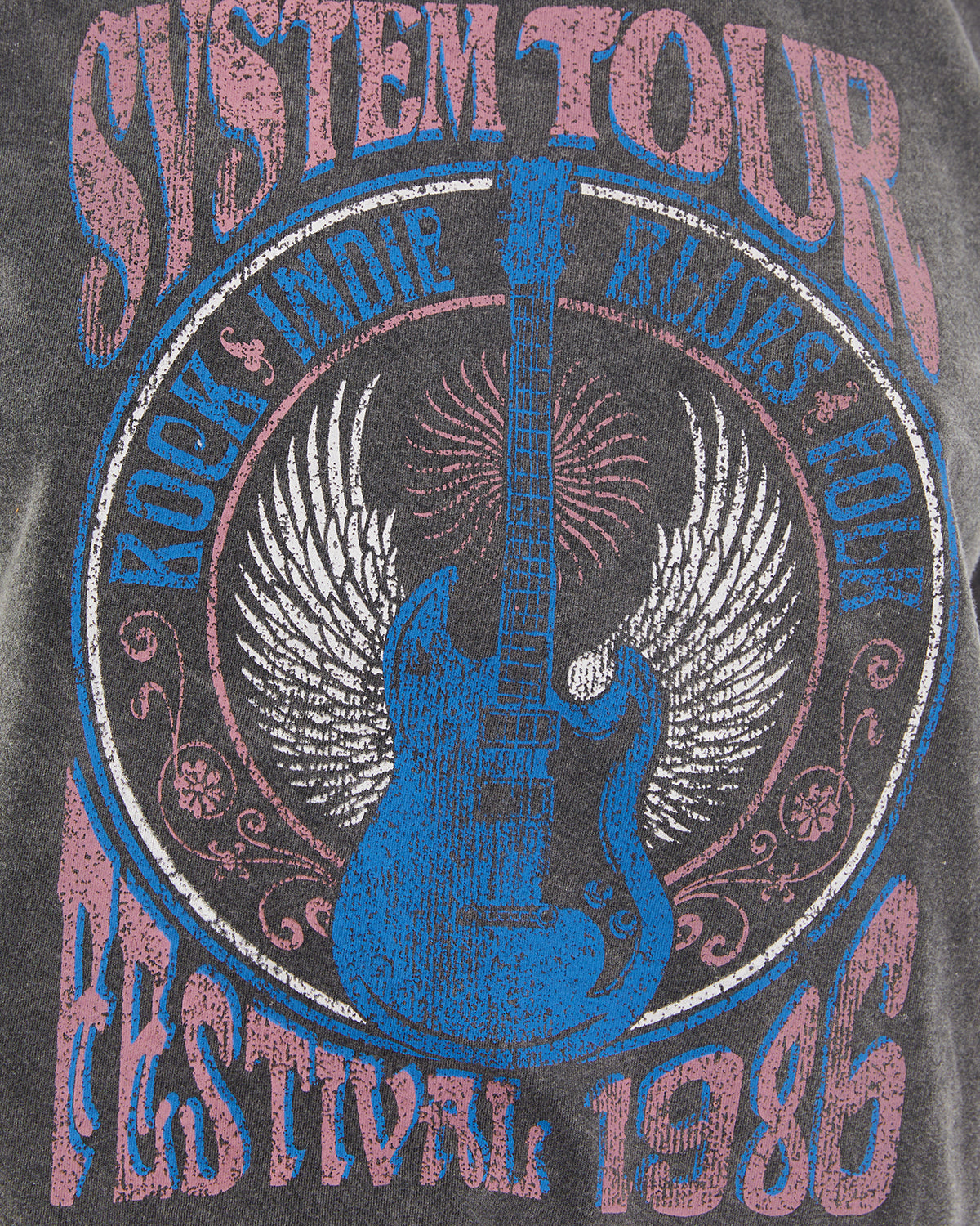 Camiseta oversize de mujer, de manga corta, con tintura efecto desgastado y estampado de una guitarra. Prenda sostenible.
