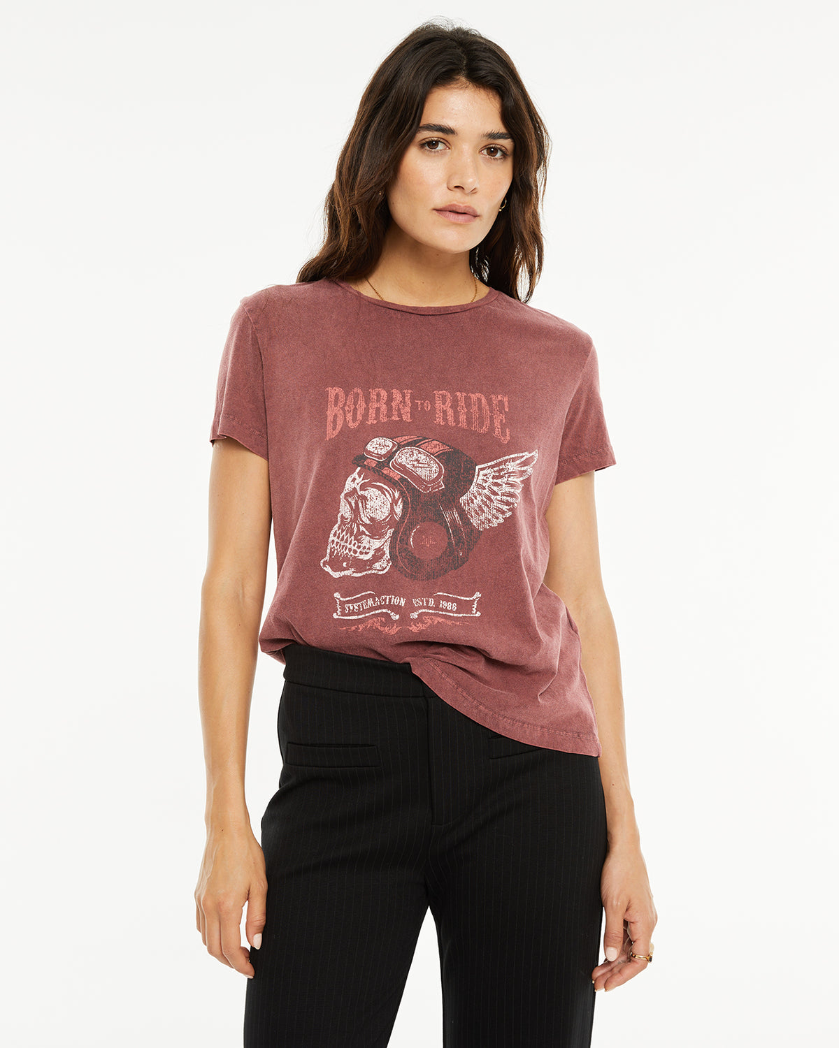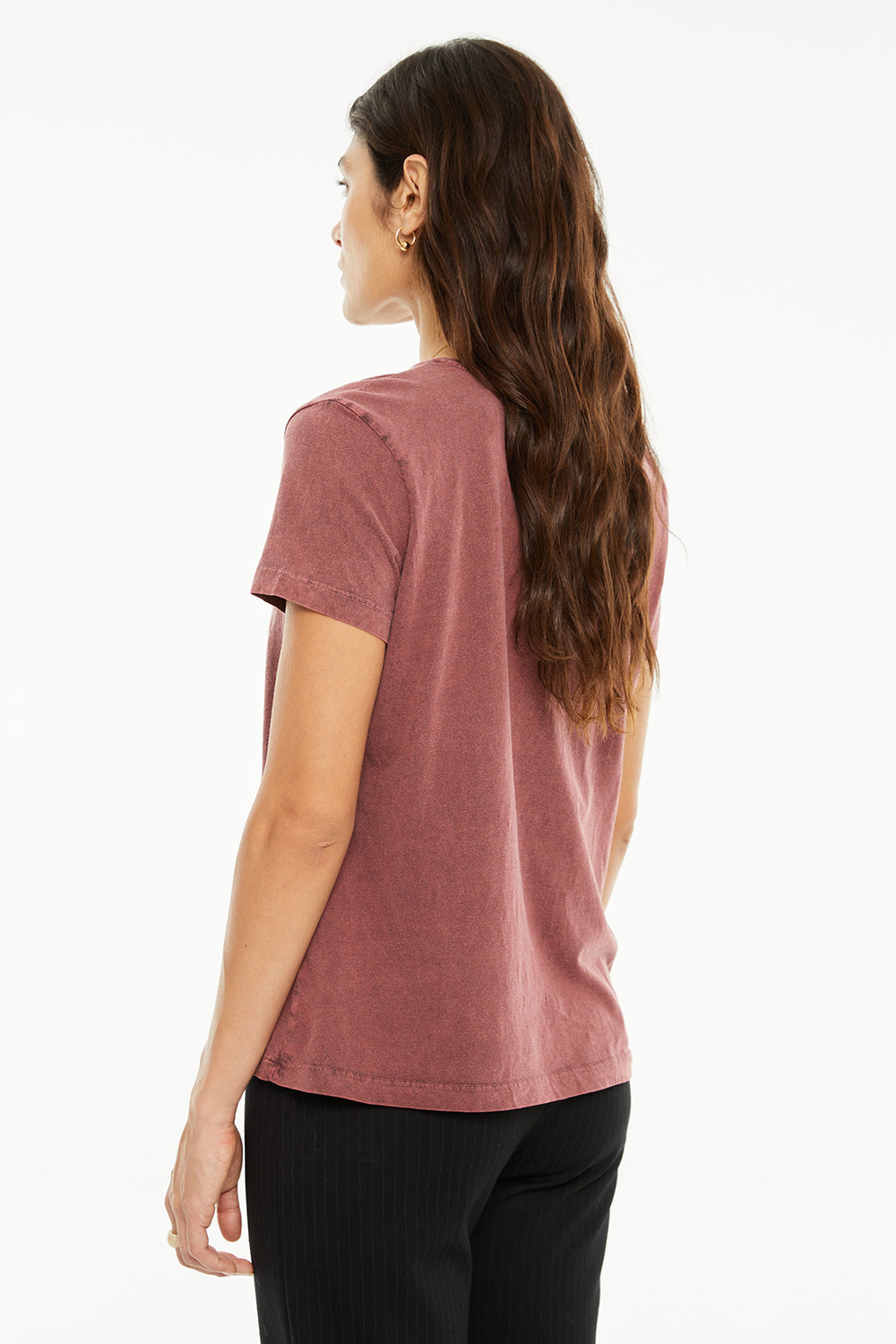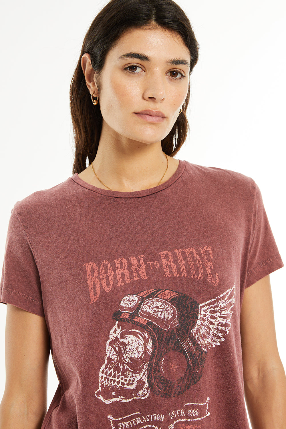 Camiseta de mujer de manga corta, con tintura efecto desgastado y estampado. Prenda sostenible.
