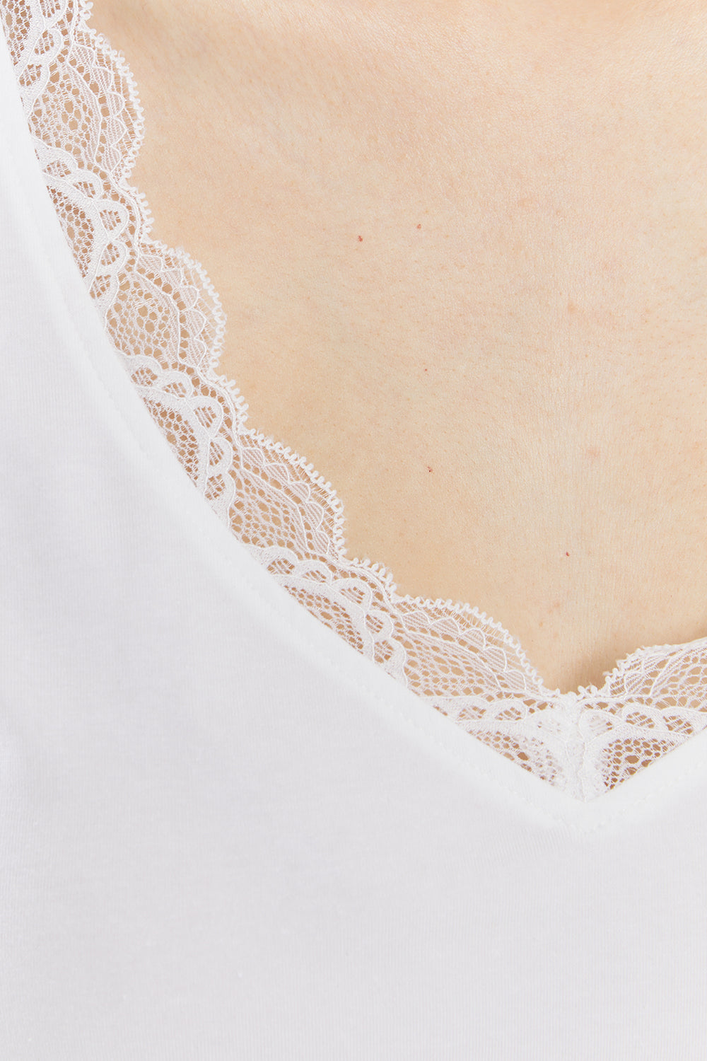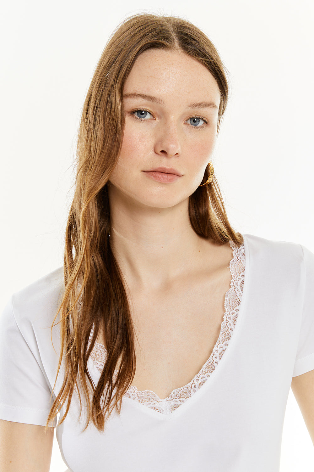 Camiseta de mujer de manga corta, escote en pico y detalle de puntilla. Prenda sostenible.