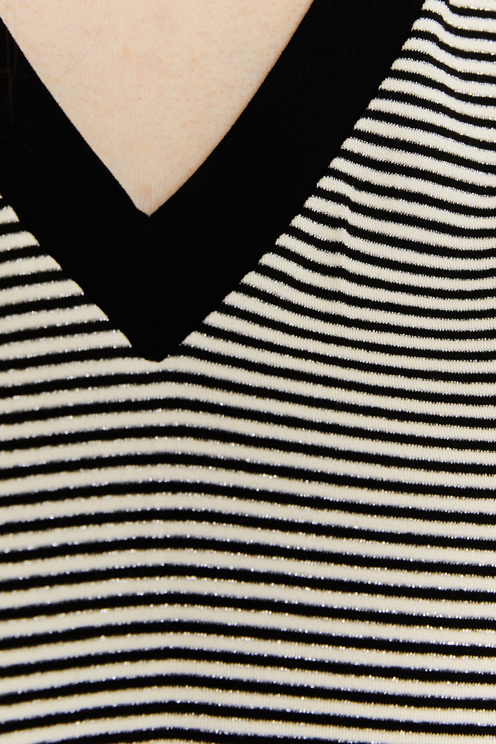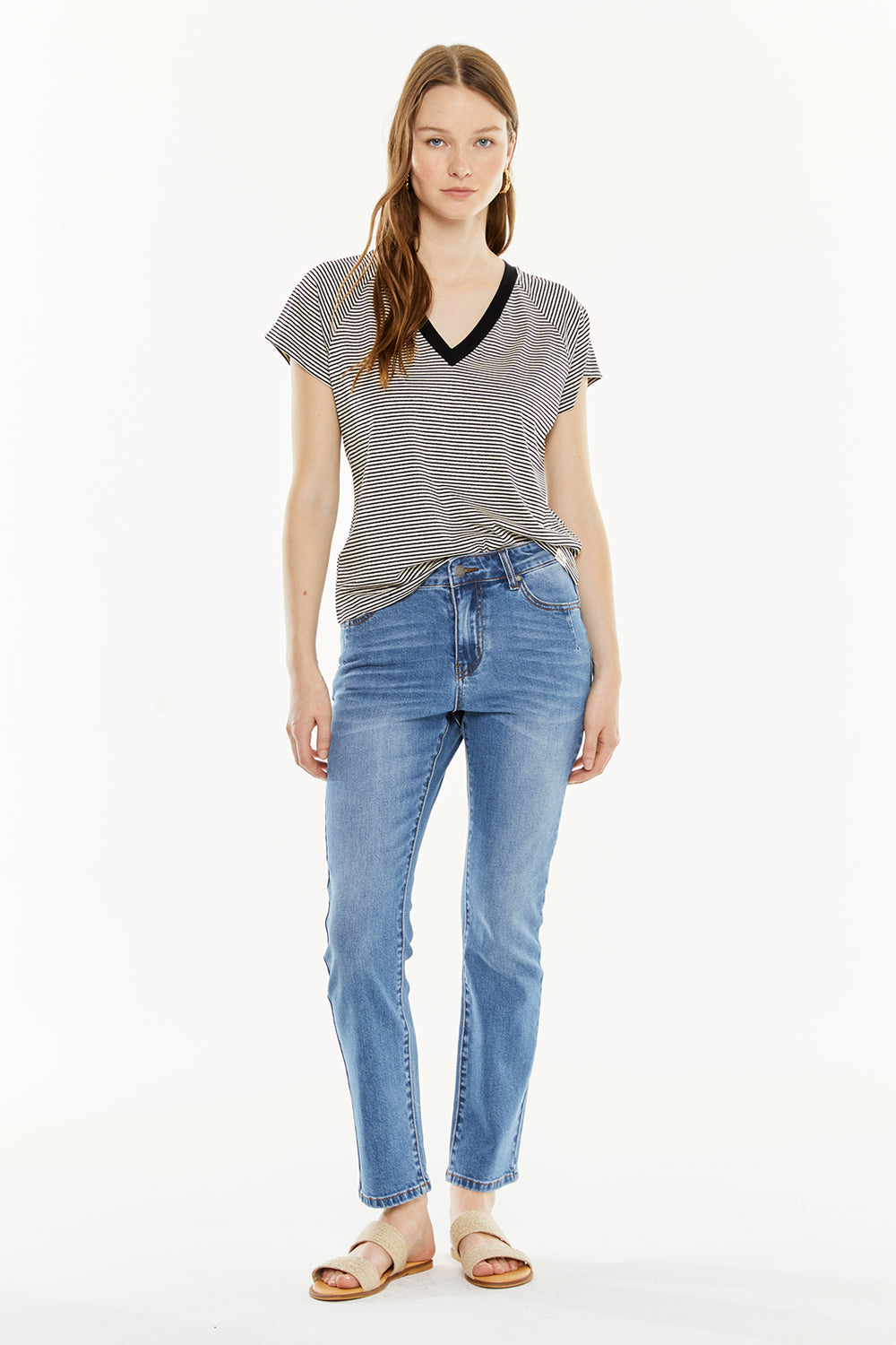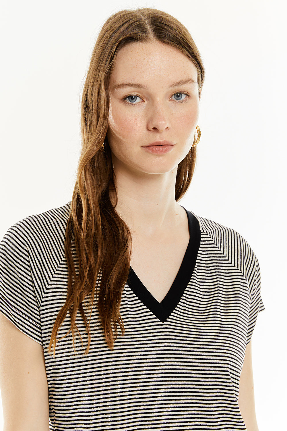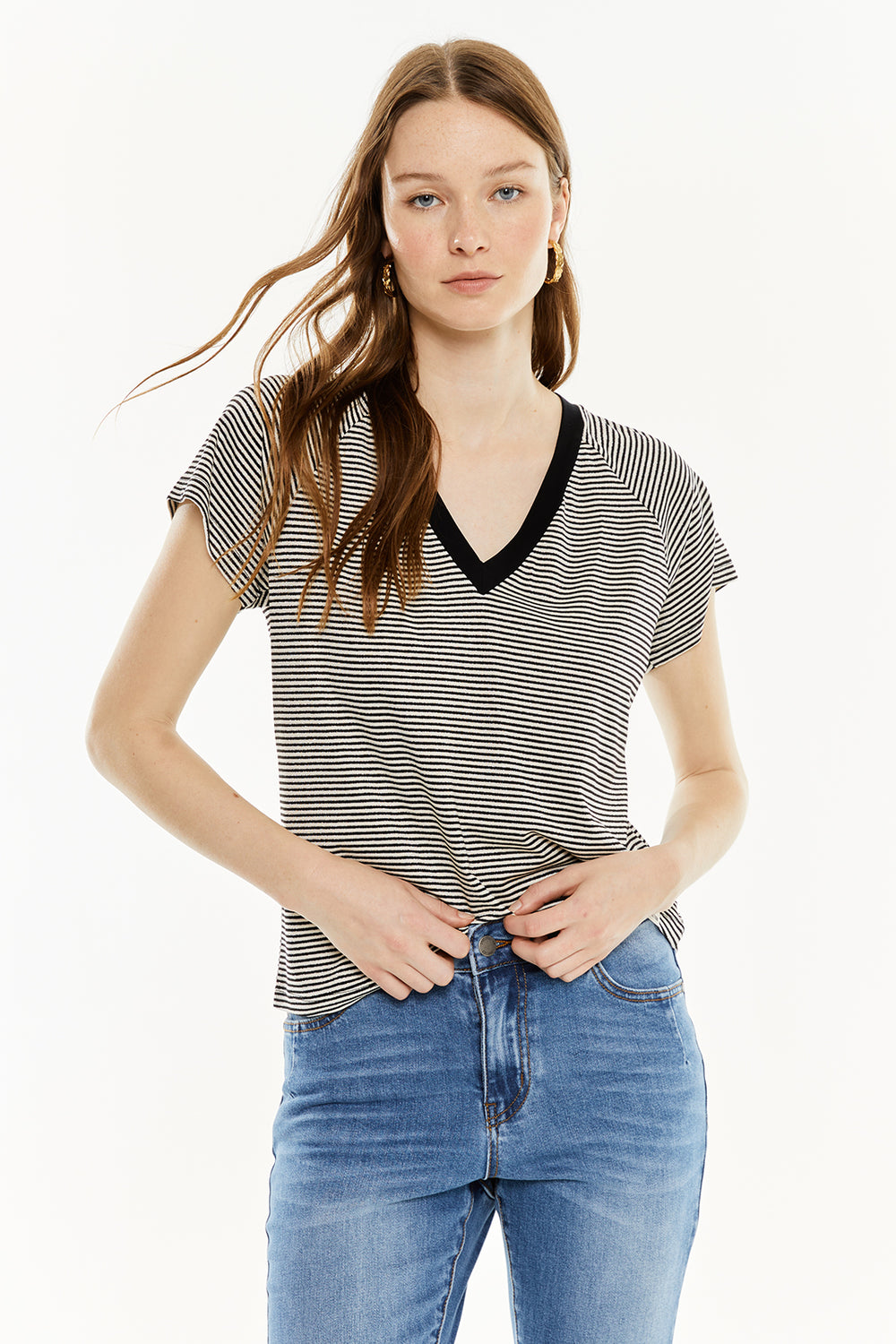 Camiseta de mujer de rayas, escote en pico y manga ranglán. Prenda sostenible.