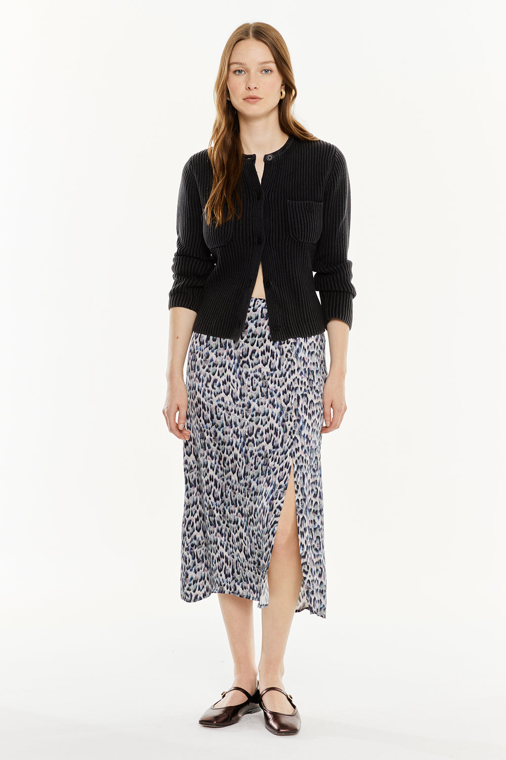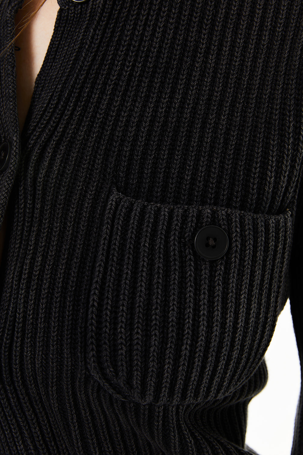 Rebeca de punto con cuello redondo, cierre frontal con botones y detalle de bolsillos plastrón con botón.