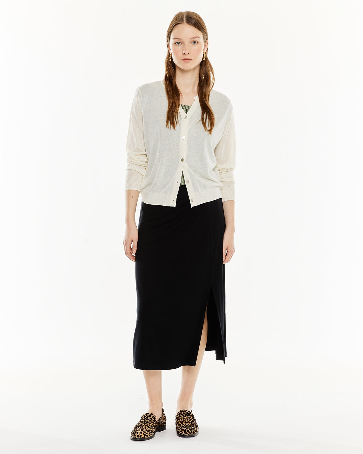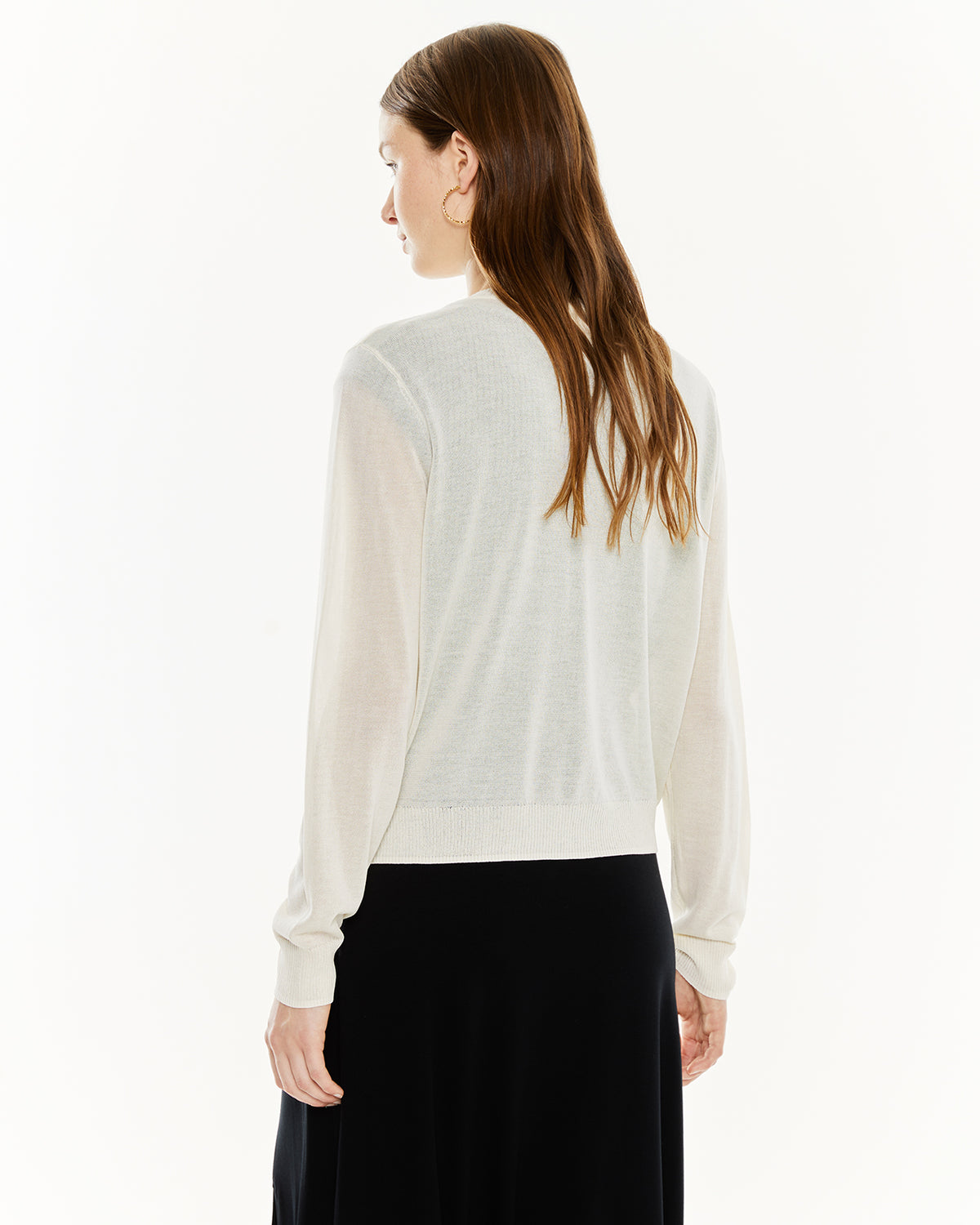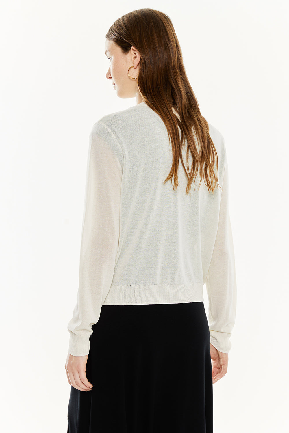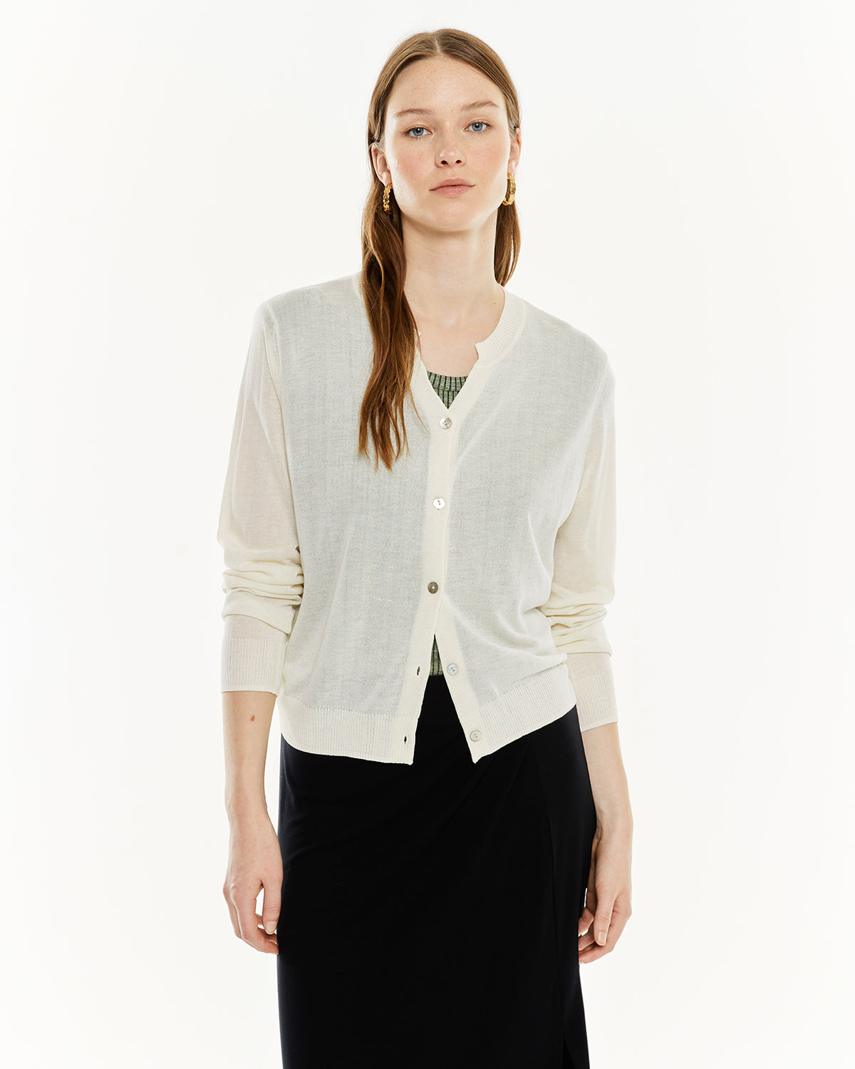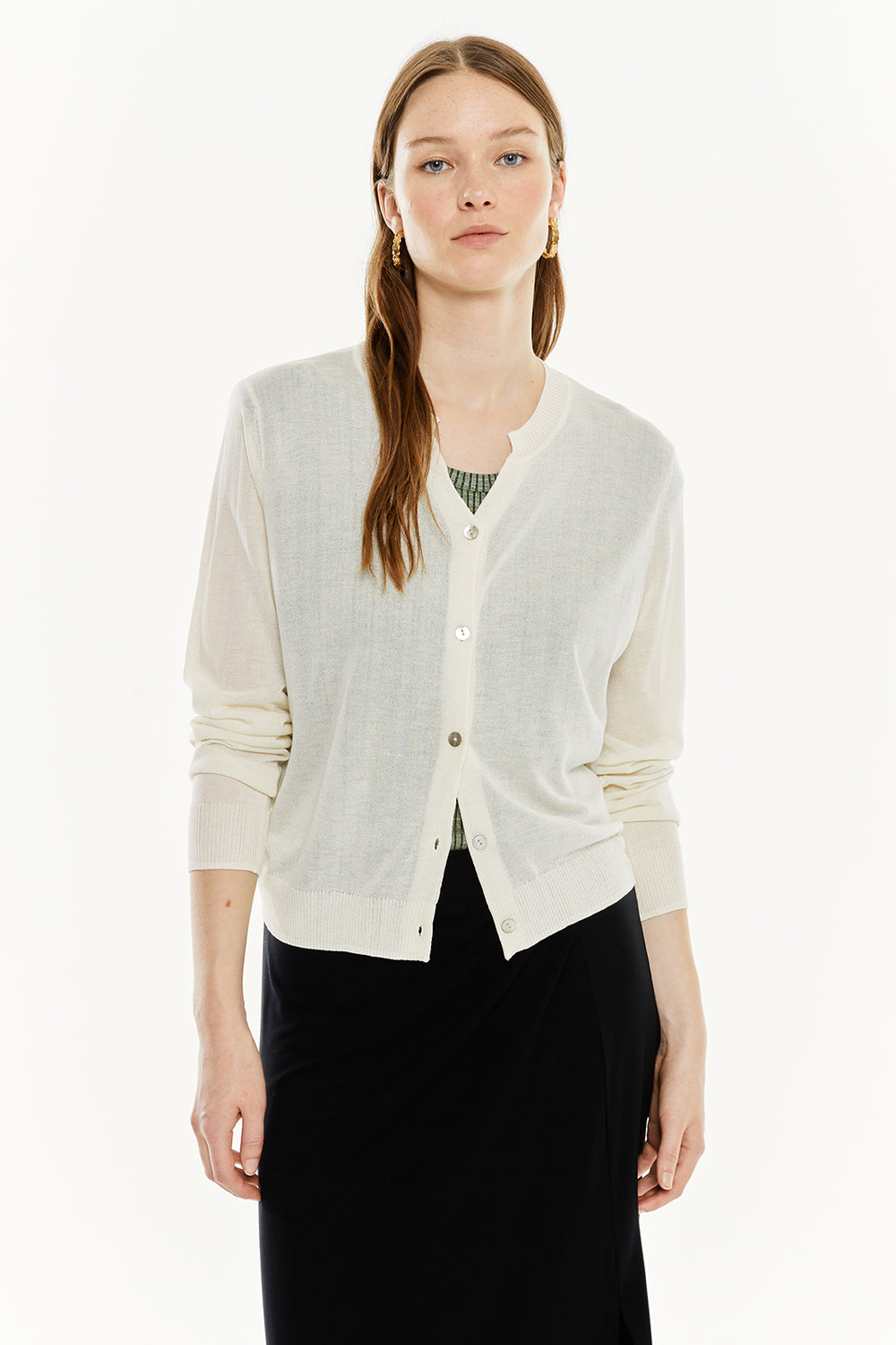 Jersey de mujer de manga larga, escote redondo y cierre abotonado en la parte delantera. Acabados en rib.