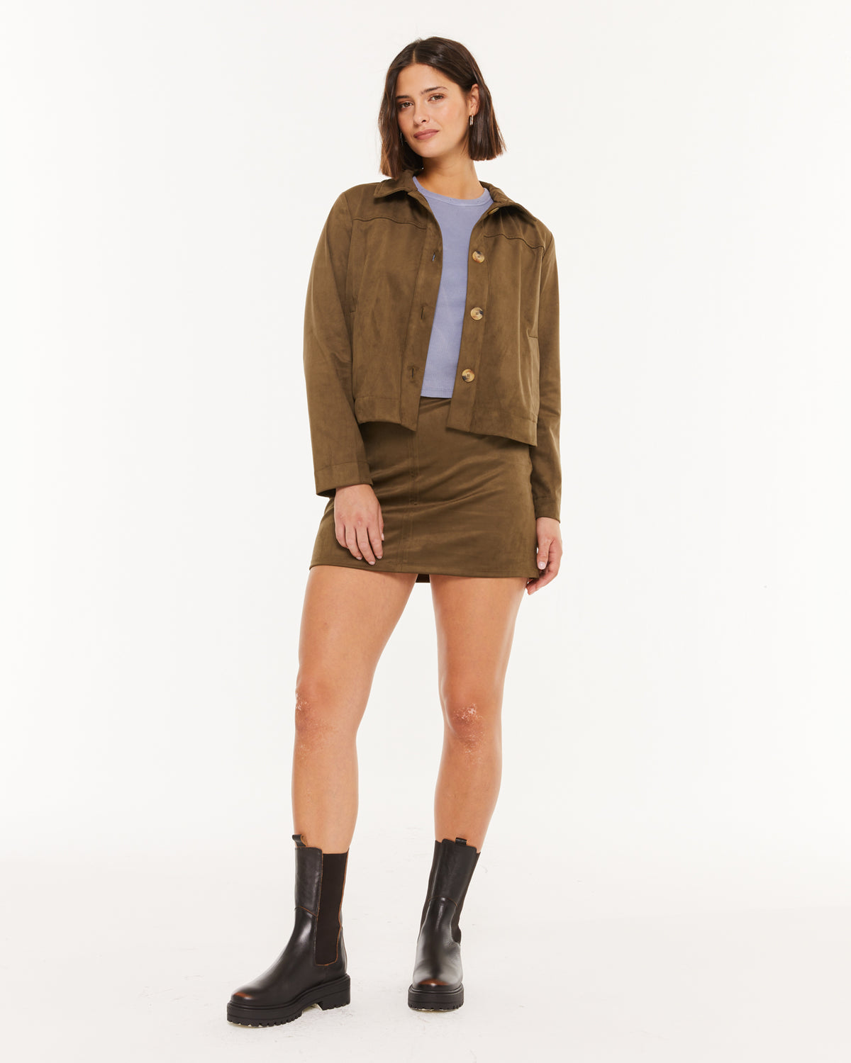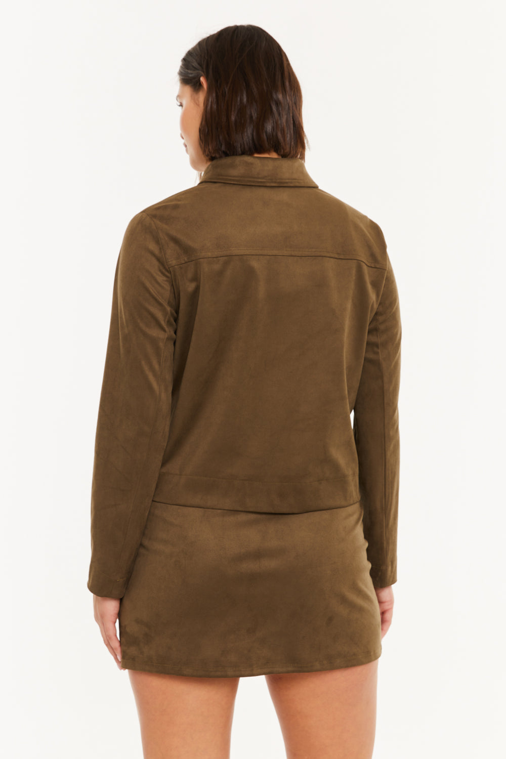 Chaqueta de mujer de antelina, con cuello camisero y cierre con botones.