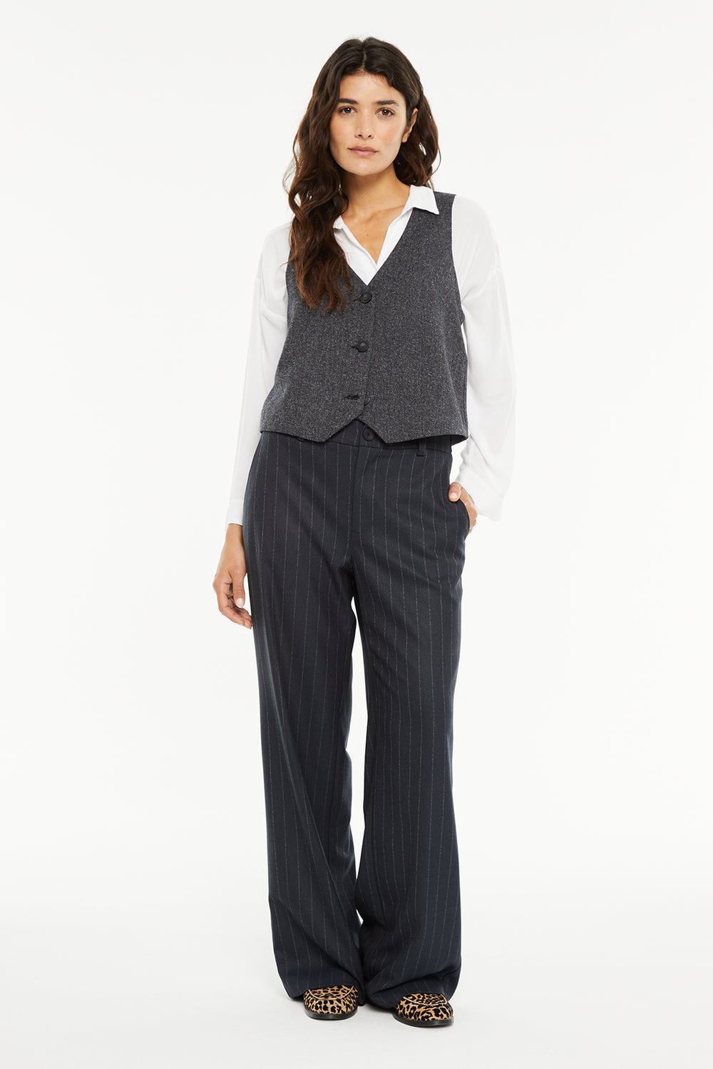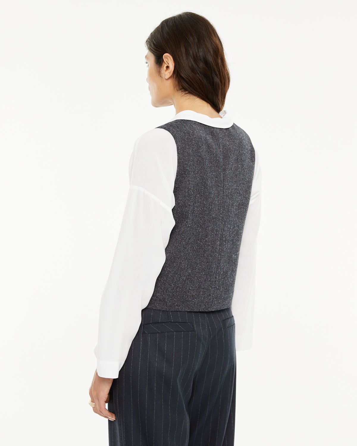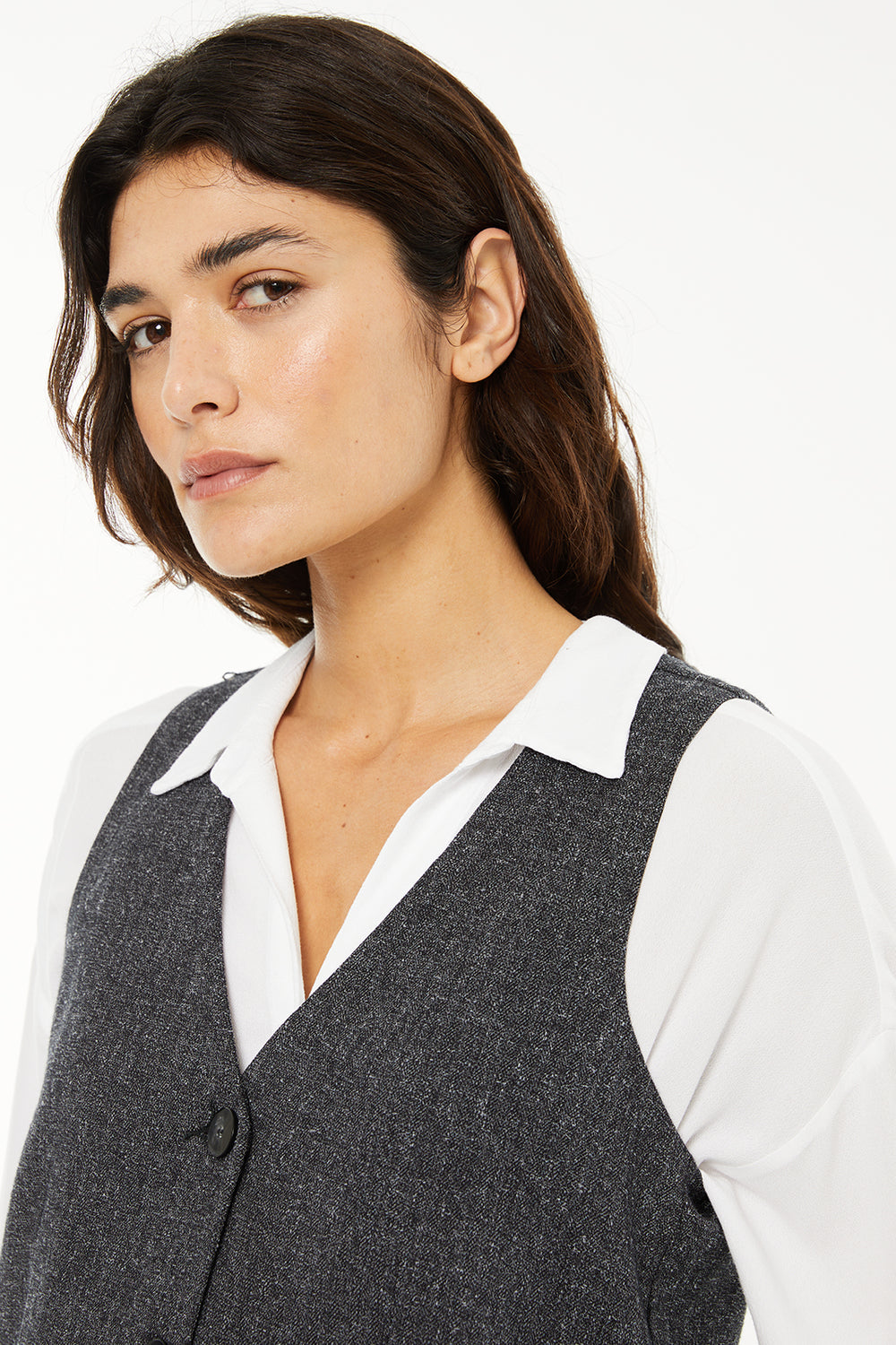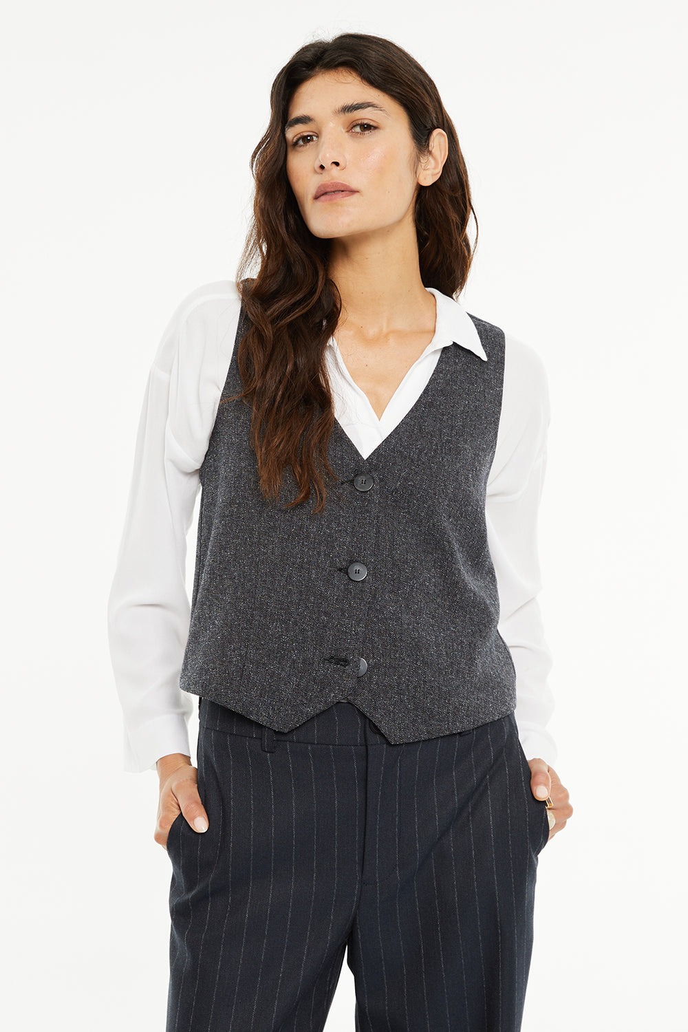 Chaleco de mujer, escote pico, pinzas en el delantero y cierre con botones.