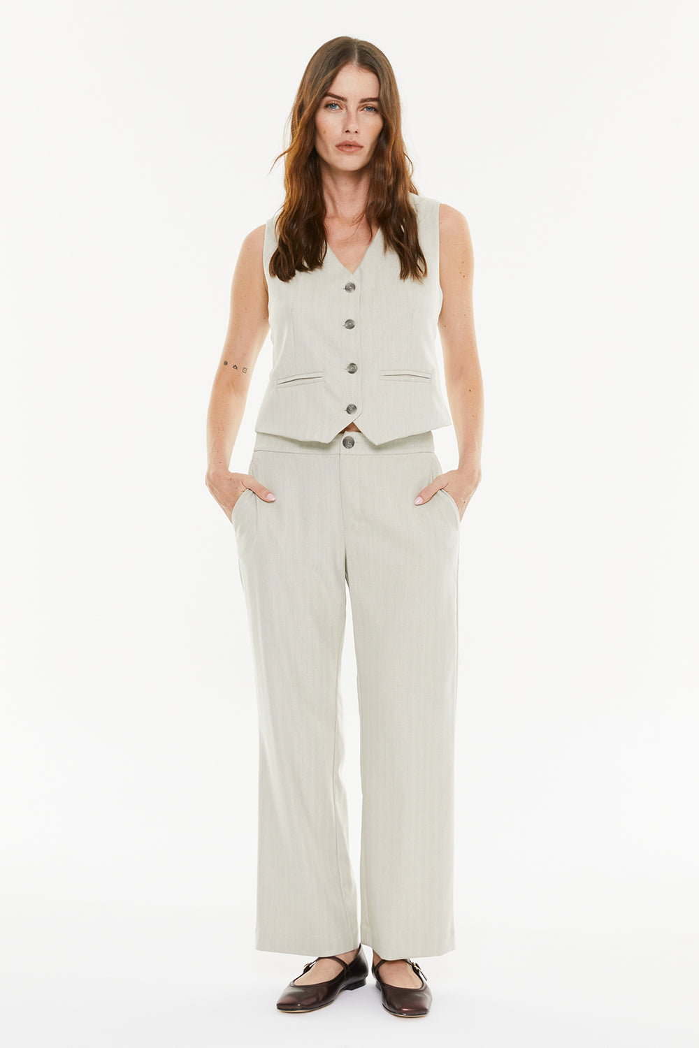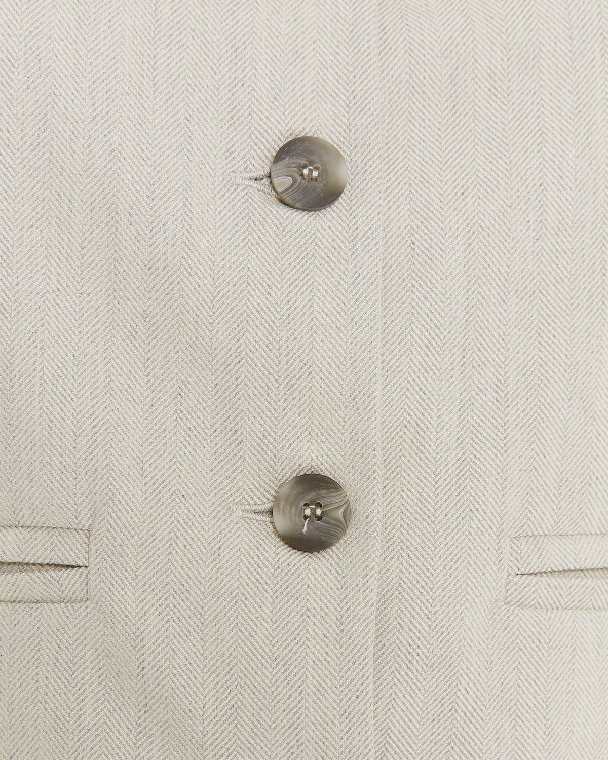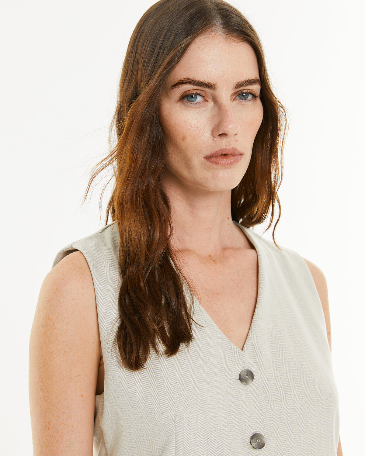 Chaleco entallado de mujer, con tejido de espiga, escote en pico, bolsillos de vivo y cierre frontal con botones. Prenda sostenible.