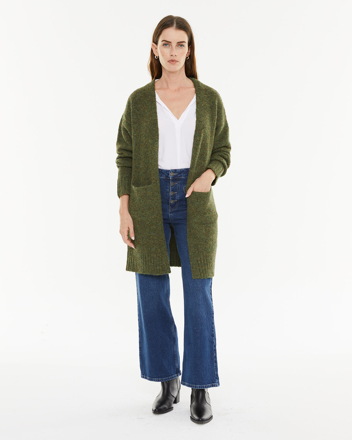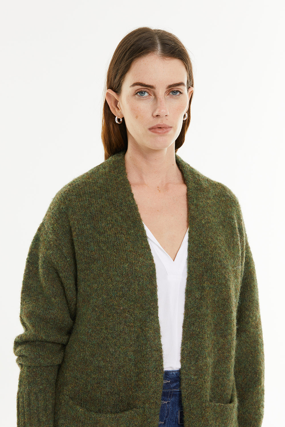 Chaqueta de punto de mujer, de talle largo, con bolsillos en el delantero. Prenda sostenible.