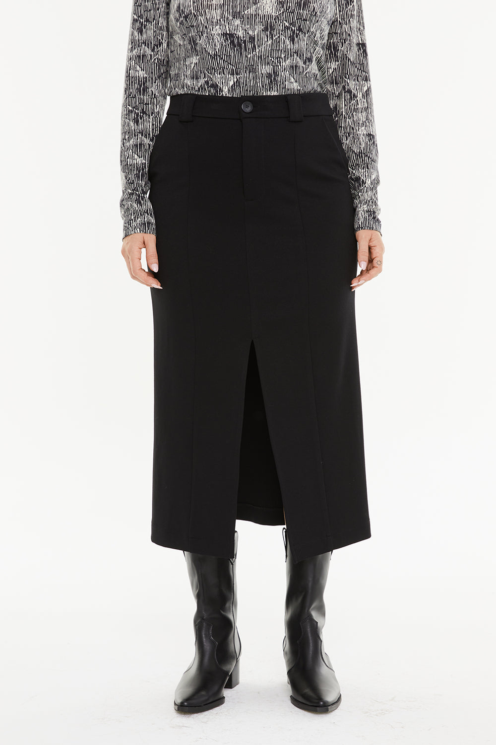 Falda lápiz midi de mujer con bolsillos laterales, abertura central en el delantero y cierre con botón.