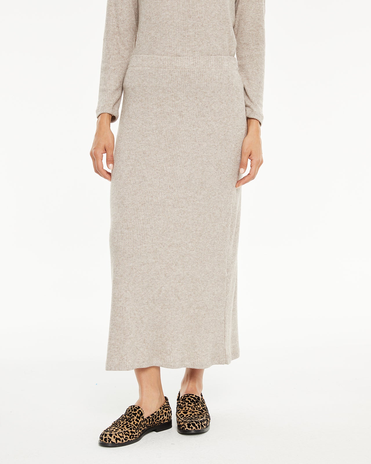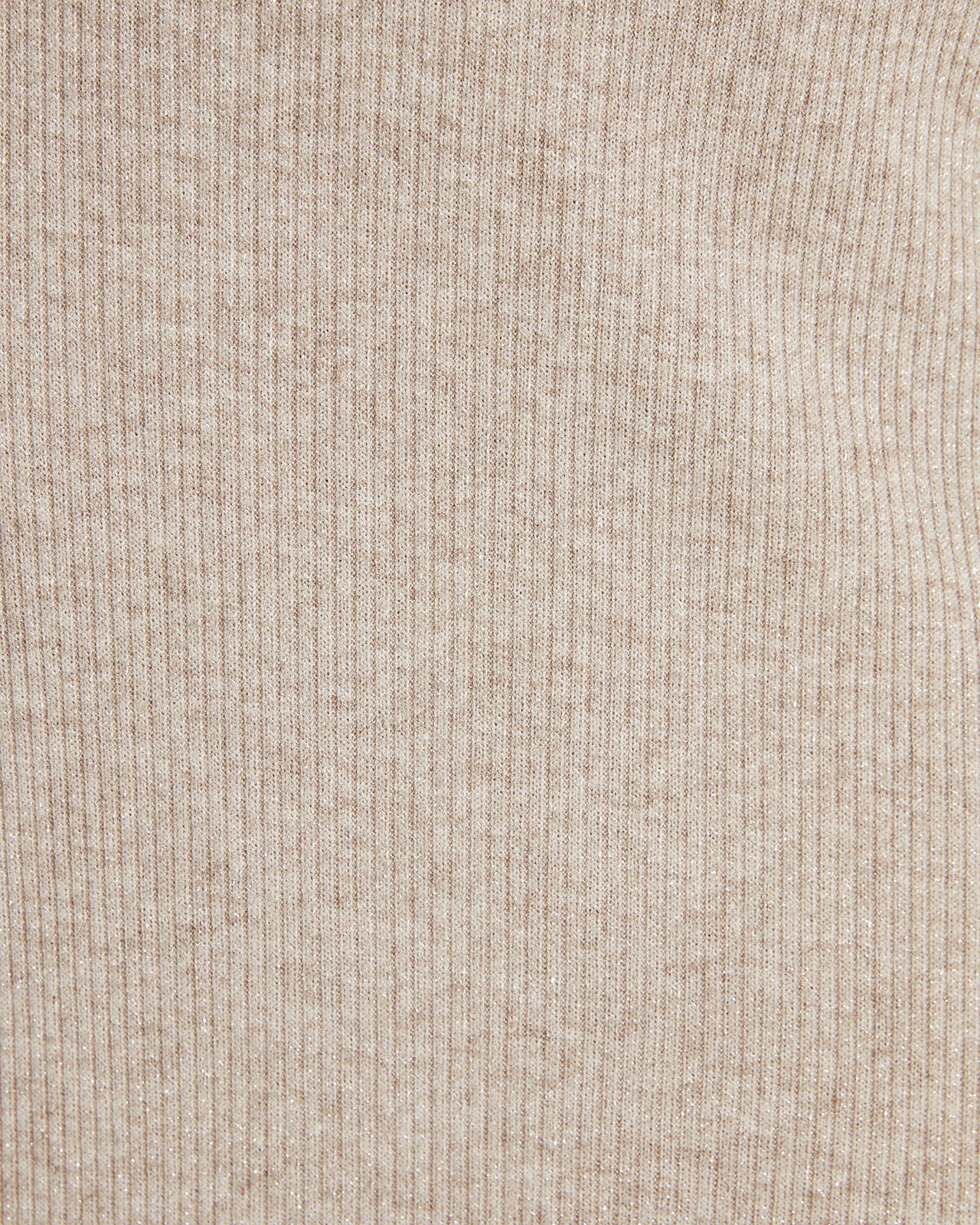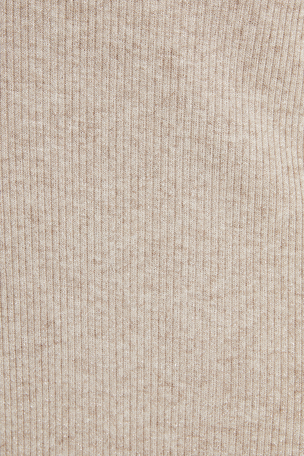 Falda midi de mujer, con goma en la cintura y tejido de canalé con lúrex.