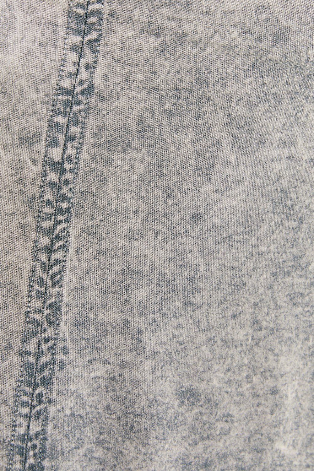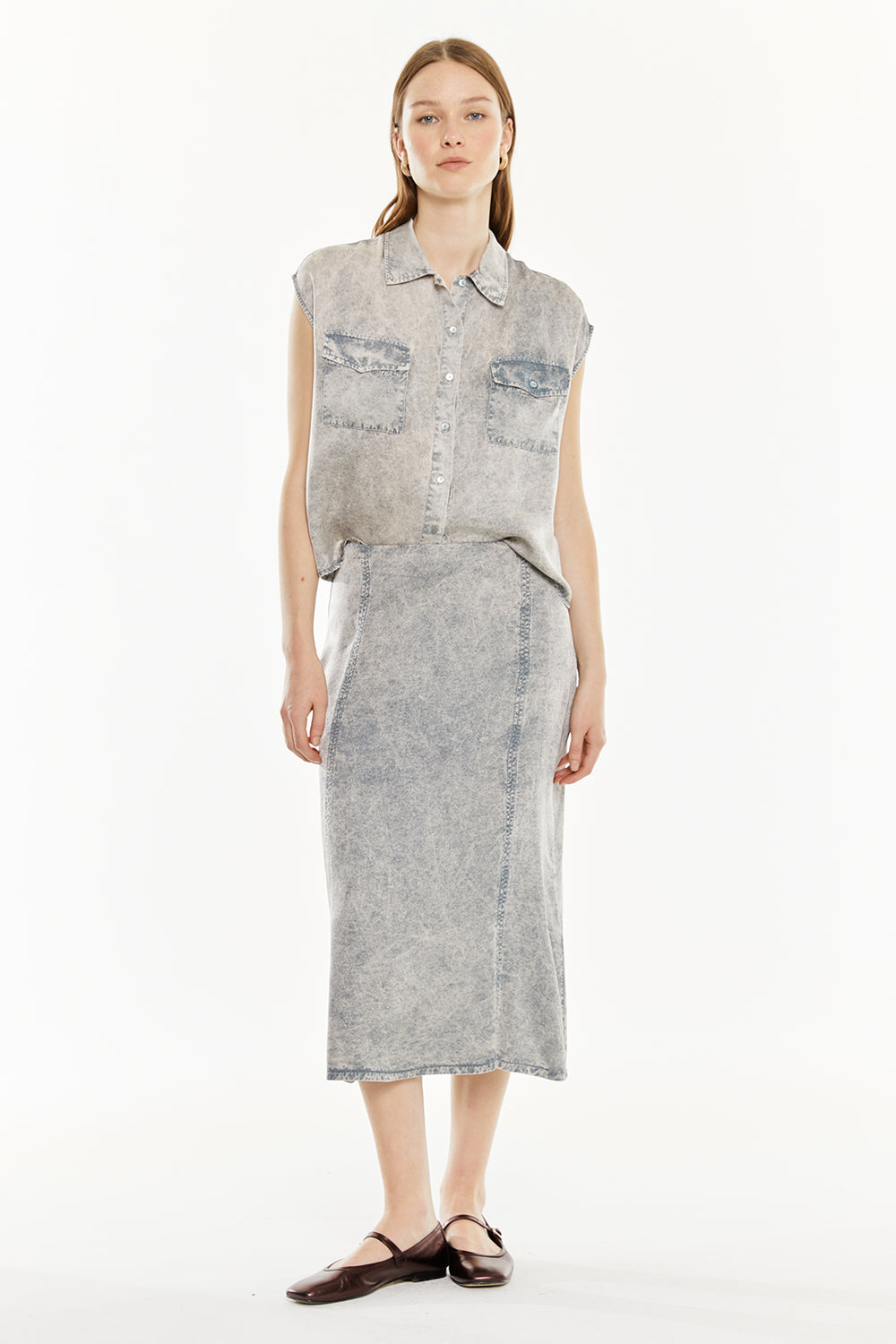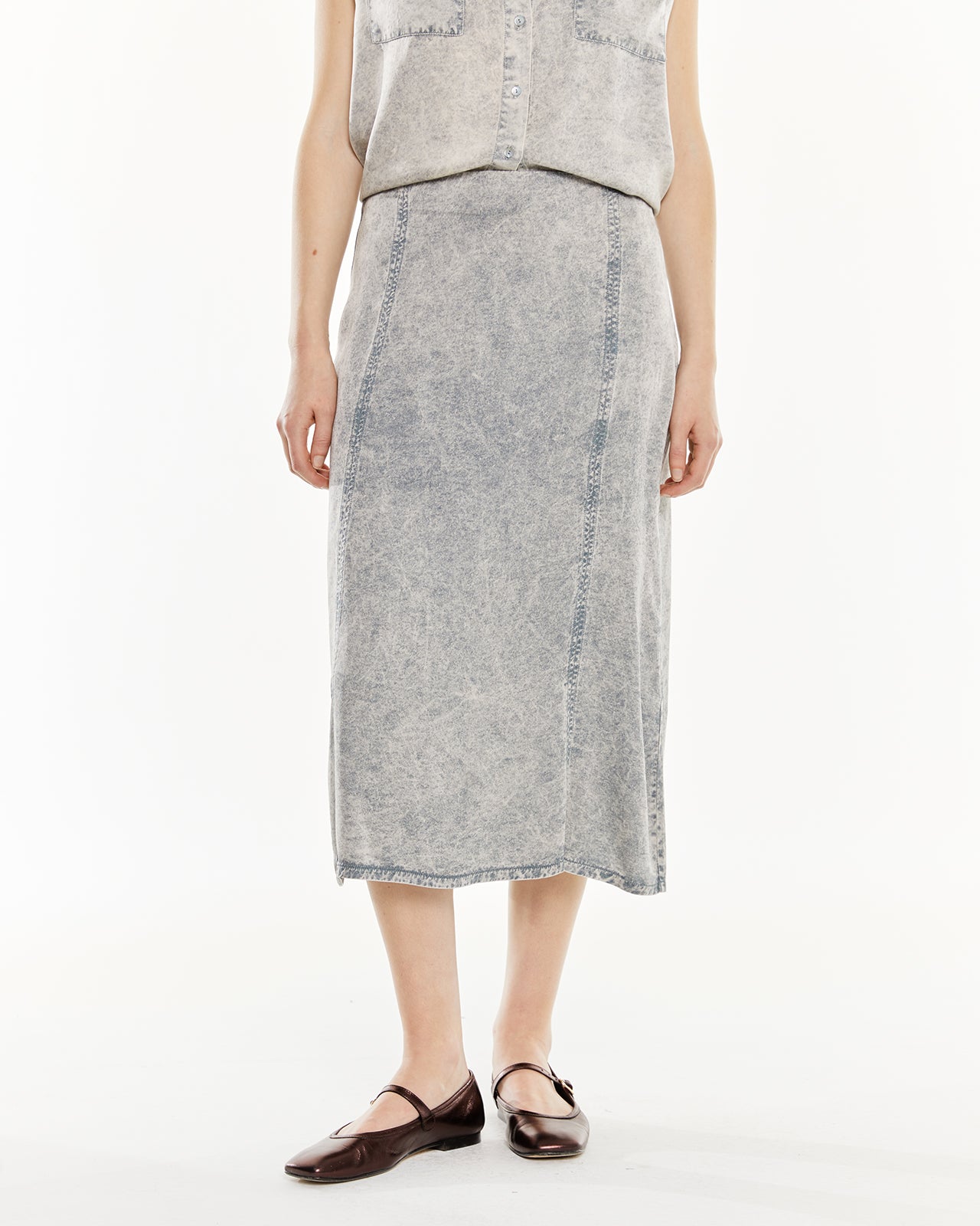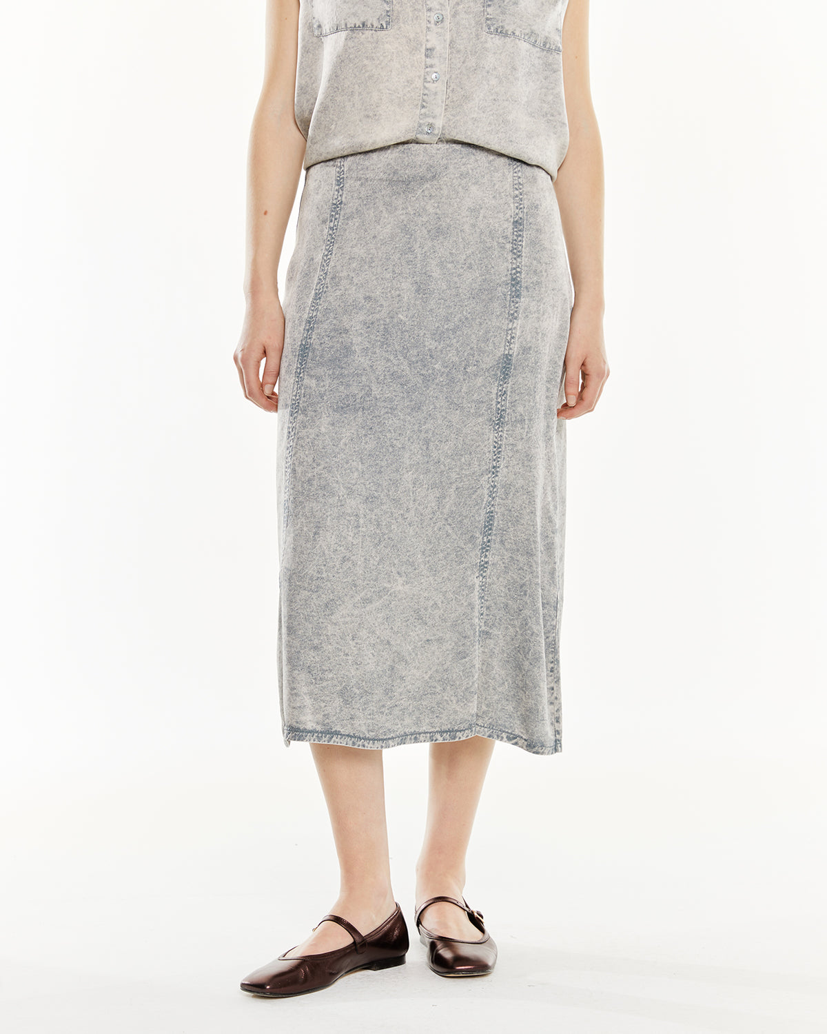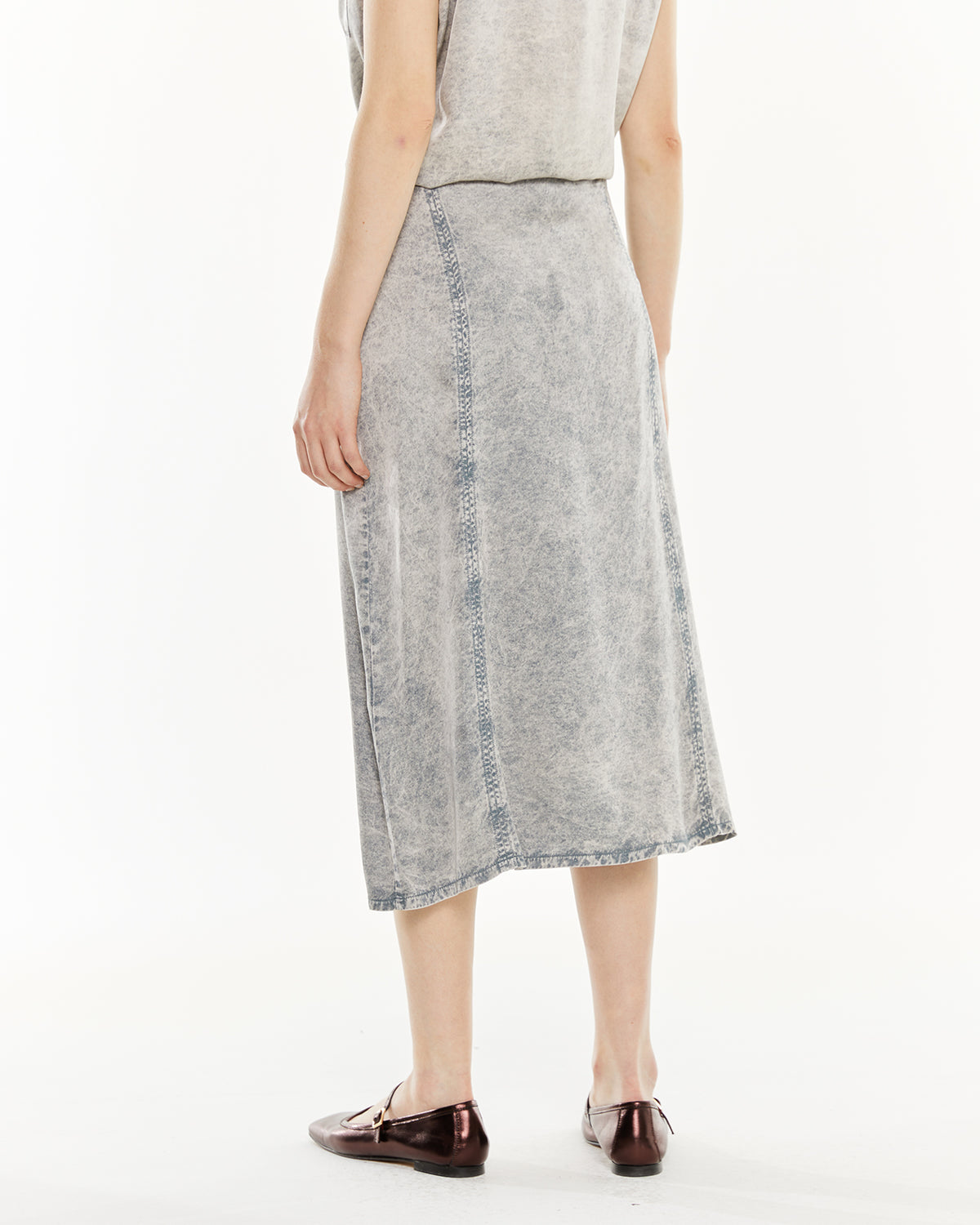 Falda de mujer con cremallera lateral, detalle de costuras en el delantero y tintura en corrosivos. Prenda sostenible.