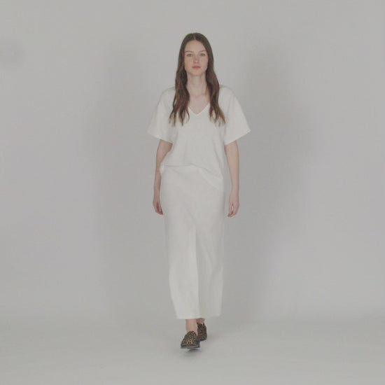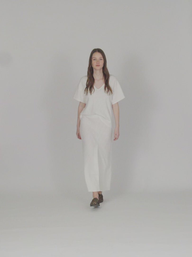 Falda larga de mujer con goma en la cintura, abertura delantera y tejido de fantasía. Prenda sostenible.