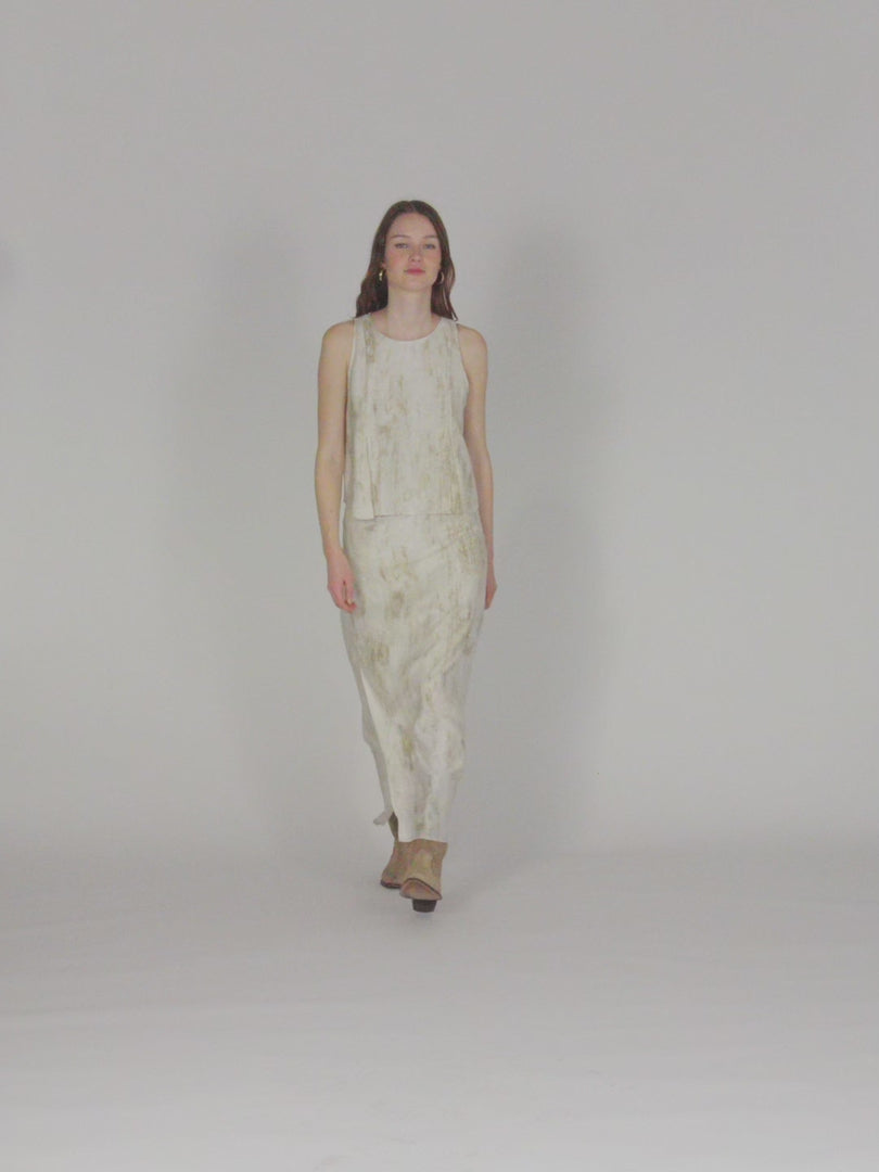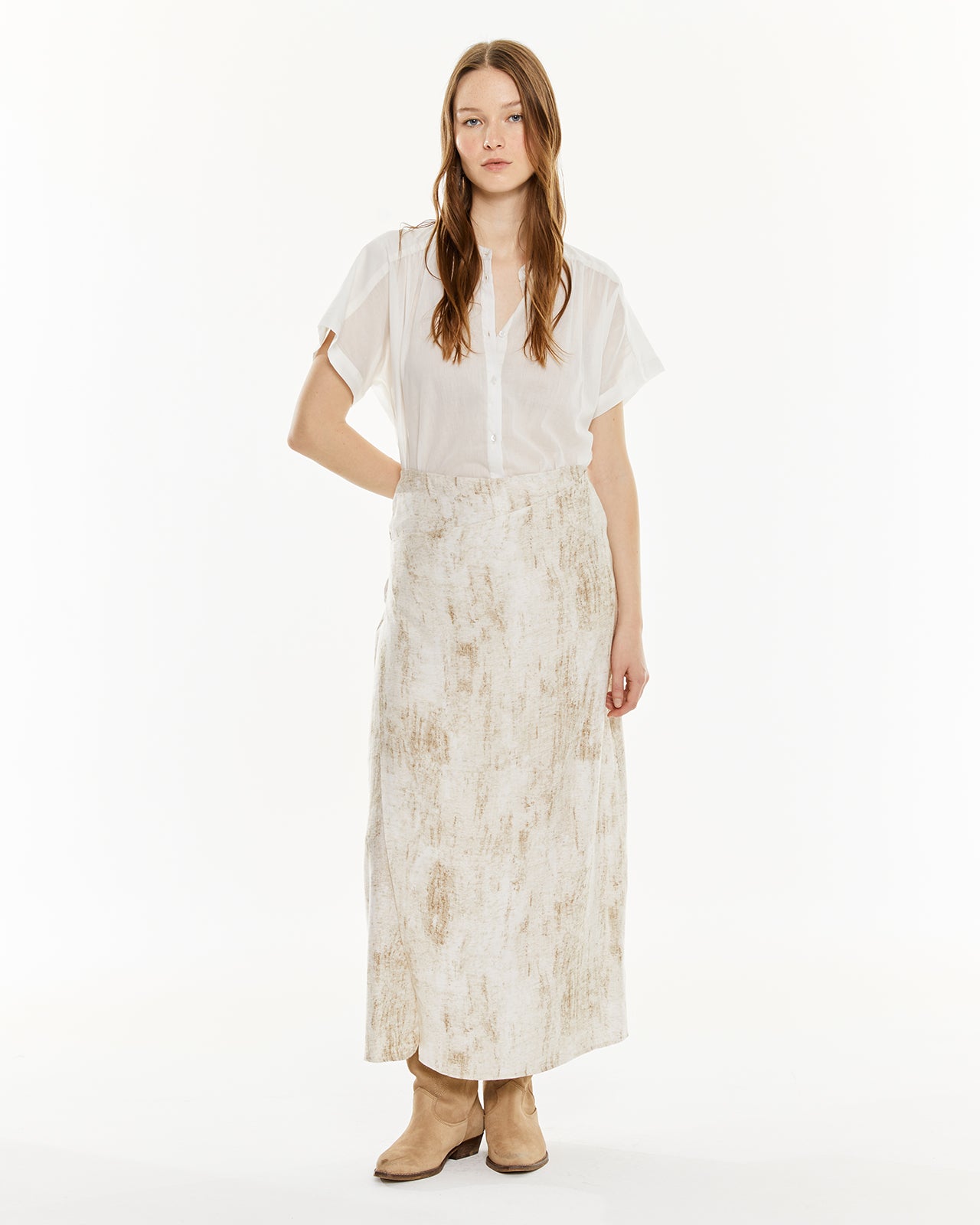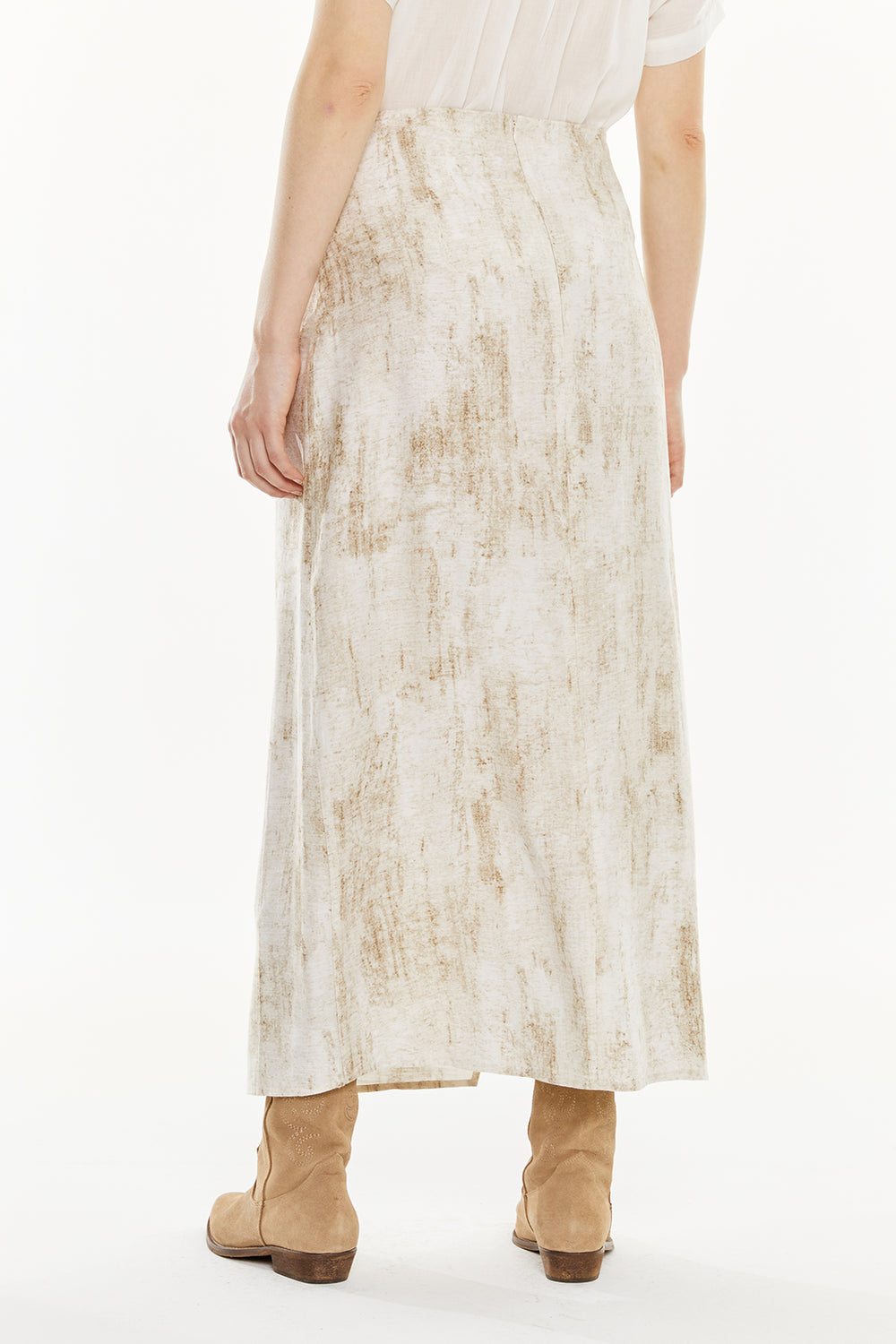 Falda midi tipo pareo de mujer con estampado tie-dye y cierre con cremallera lateral. Prenda sostenible.
