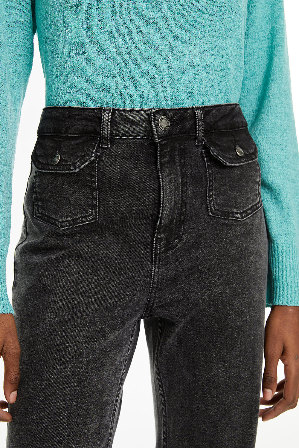 Jeans fit flare tiro medio detalle bolsillos delanteros
