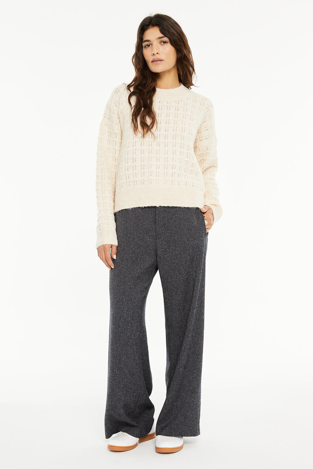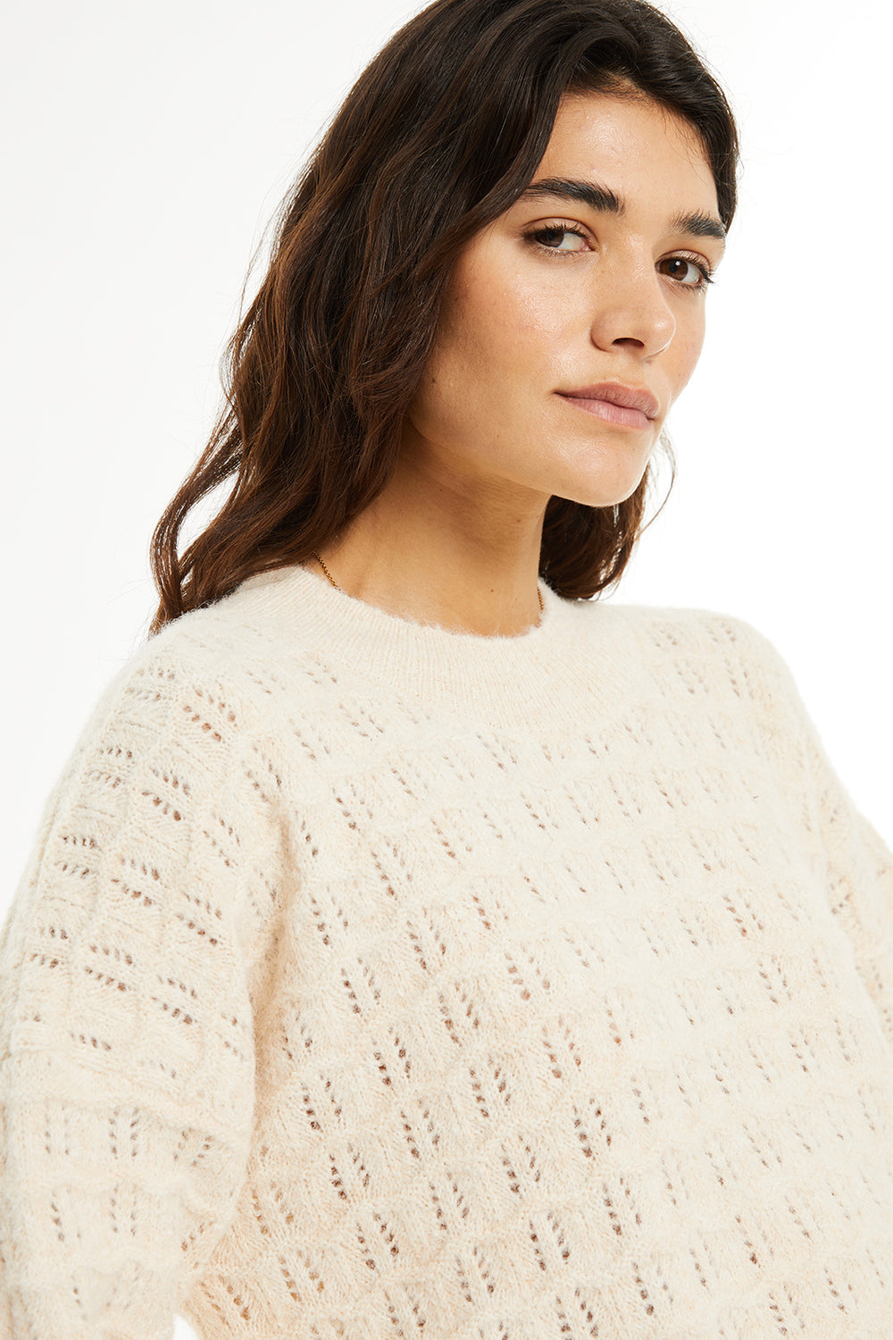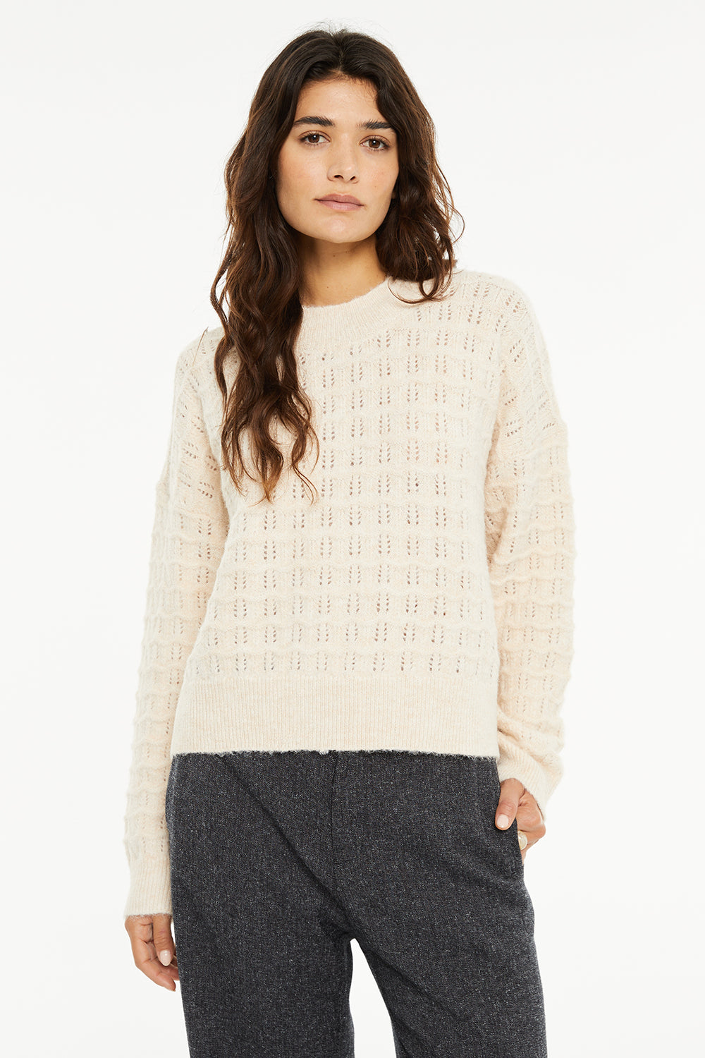 Jersey de mujer, escote redondo y punto con estructura. Prenda sostenible.