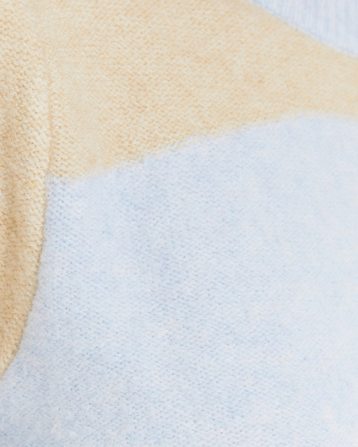Jersey de mujer con jacquard tricolor, escote redondo y acabados en rib. Prenda sostenible.