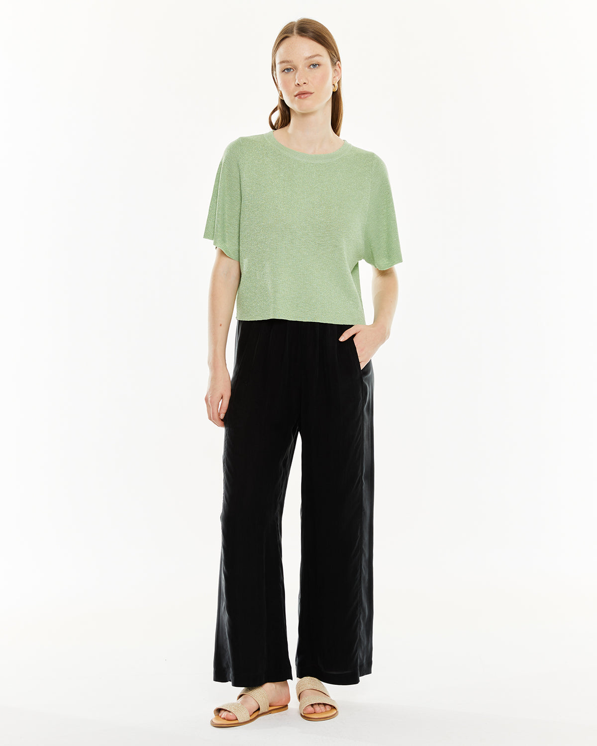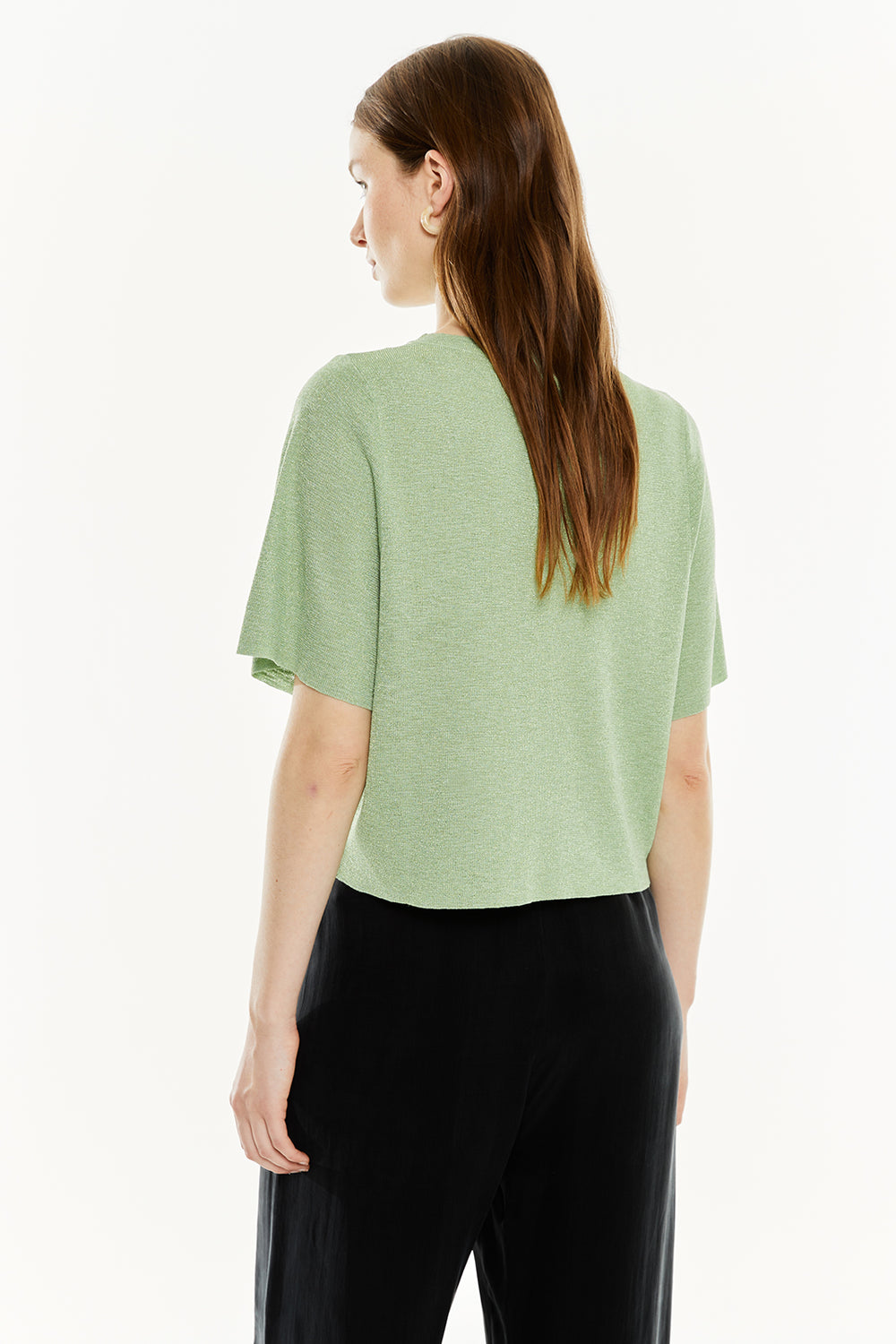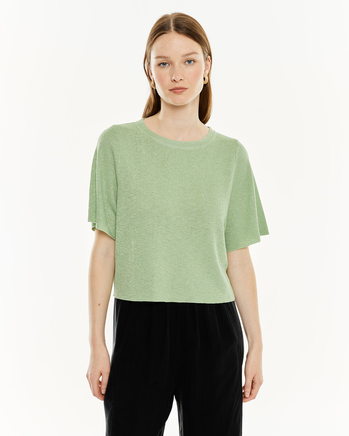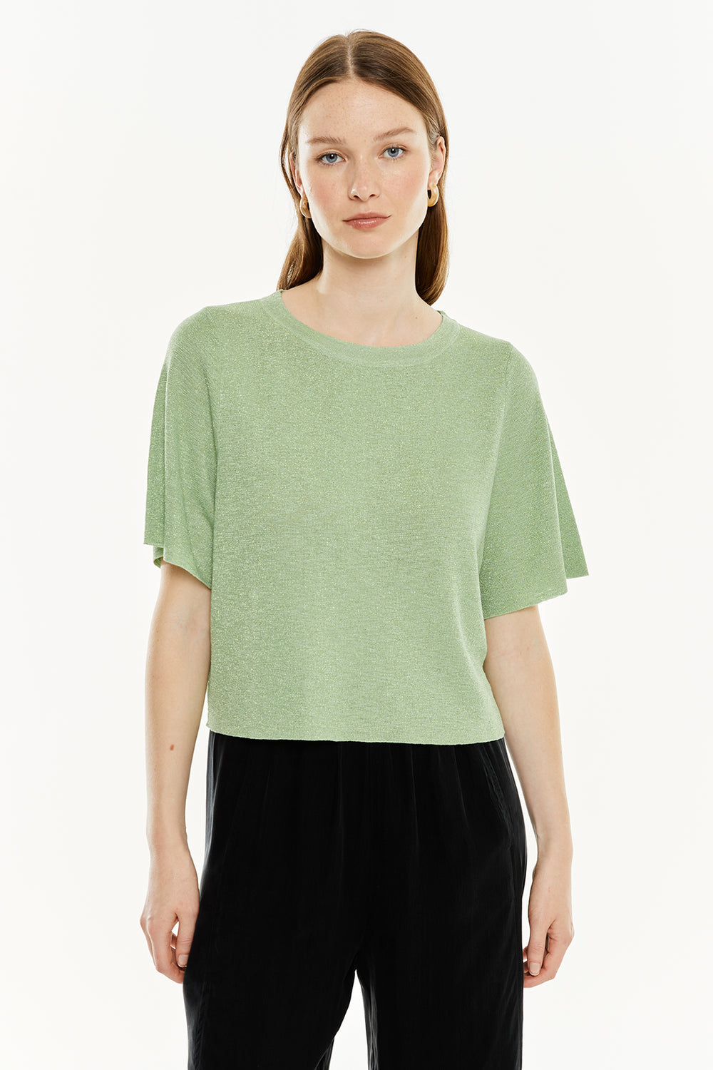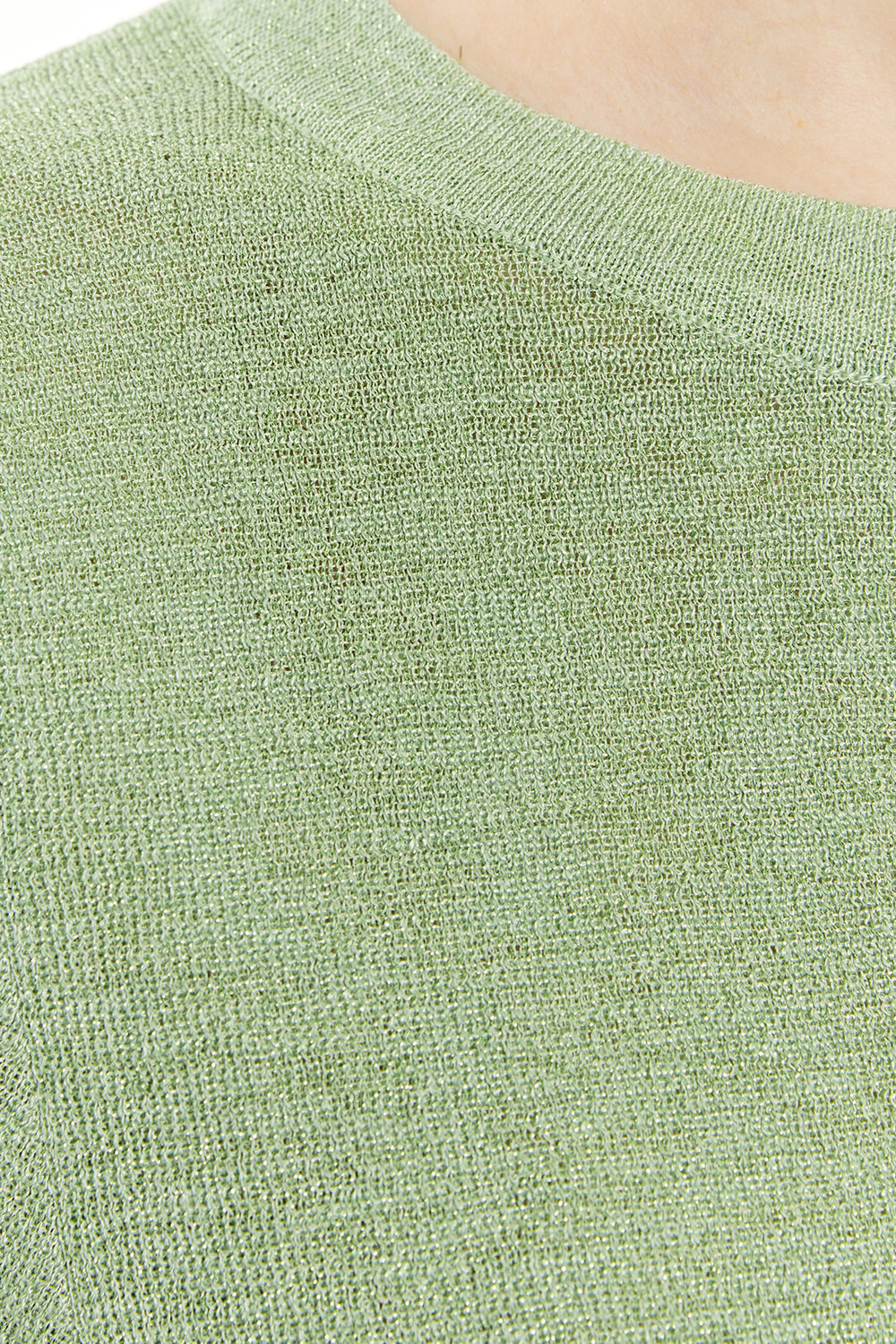 Jersey de mujer con lúrex, manga corta y escote redondo.