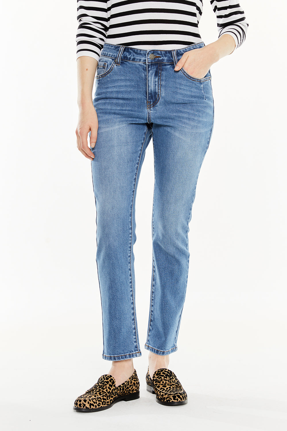 Pantalón denim de mujer de cinco bolsillos, entallado y en color azul.