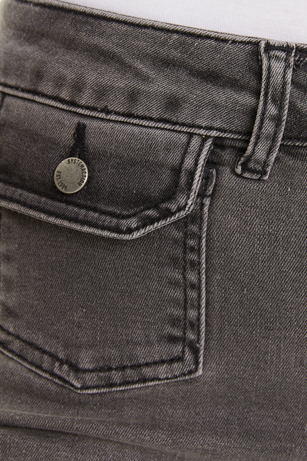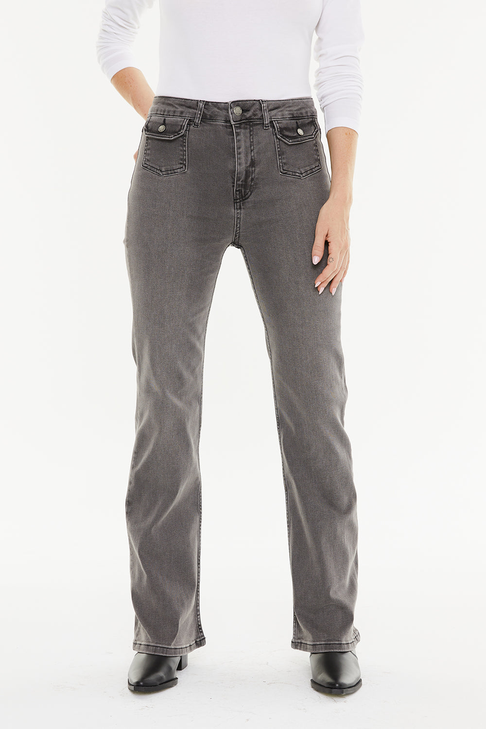 Pantalón acampanado con detalle de bolsillos plastrón en la parte delantera.