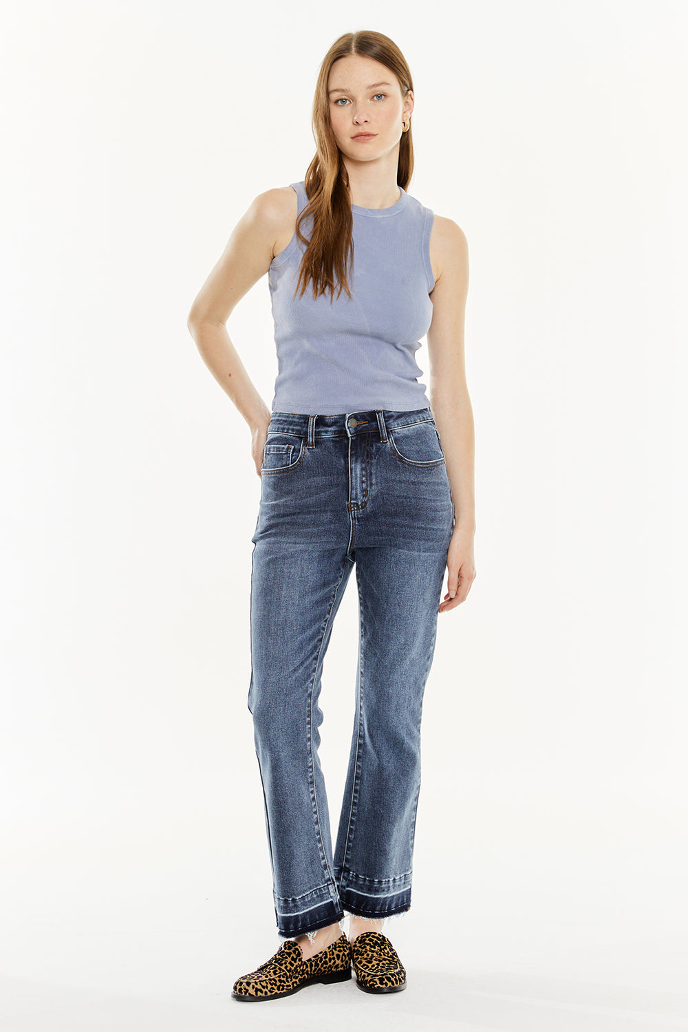Pantalón denim de mujer tipo flare, con cierre de botón.