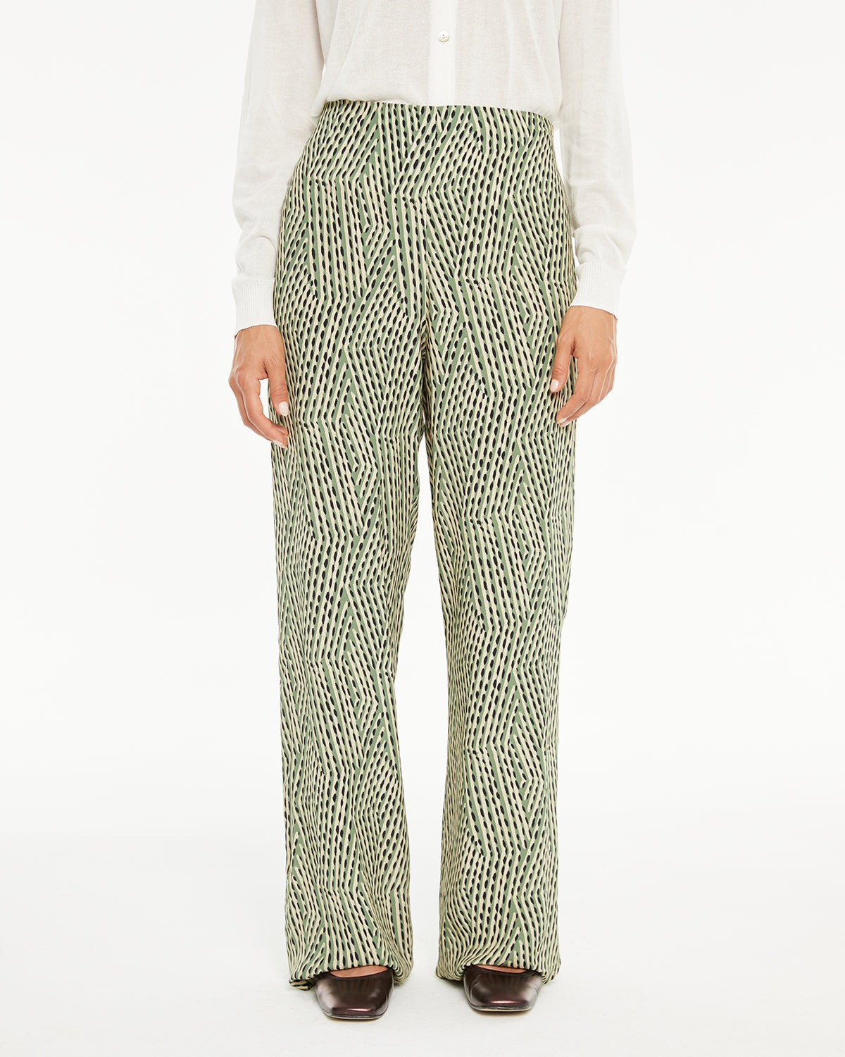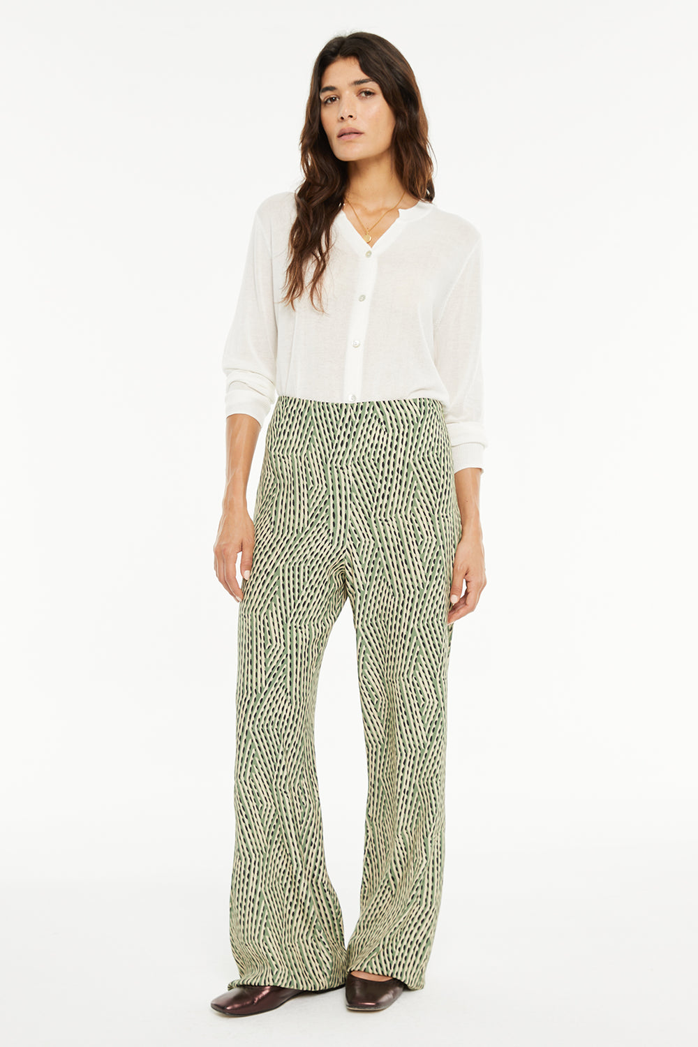 Pantalón de mujer estampado con cremallera lateral. Prenda sostenible.