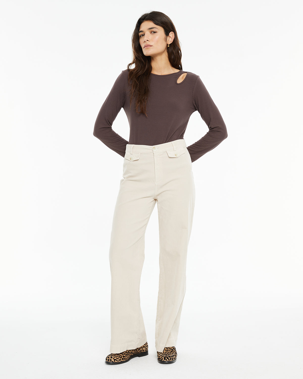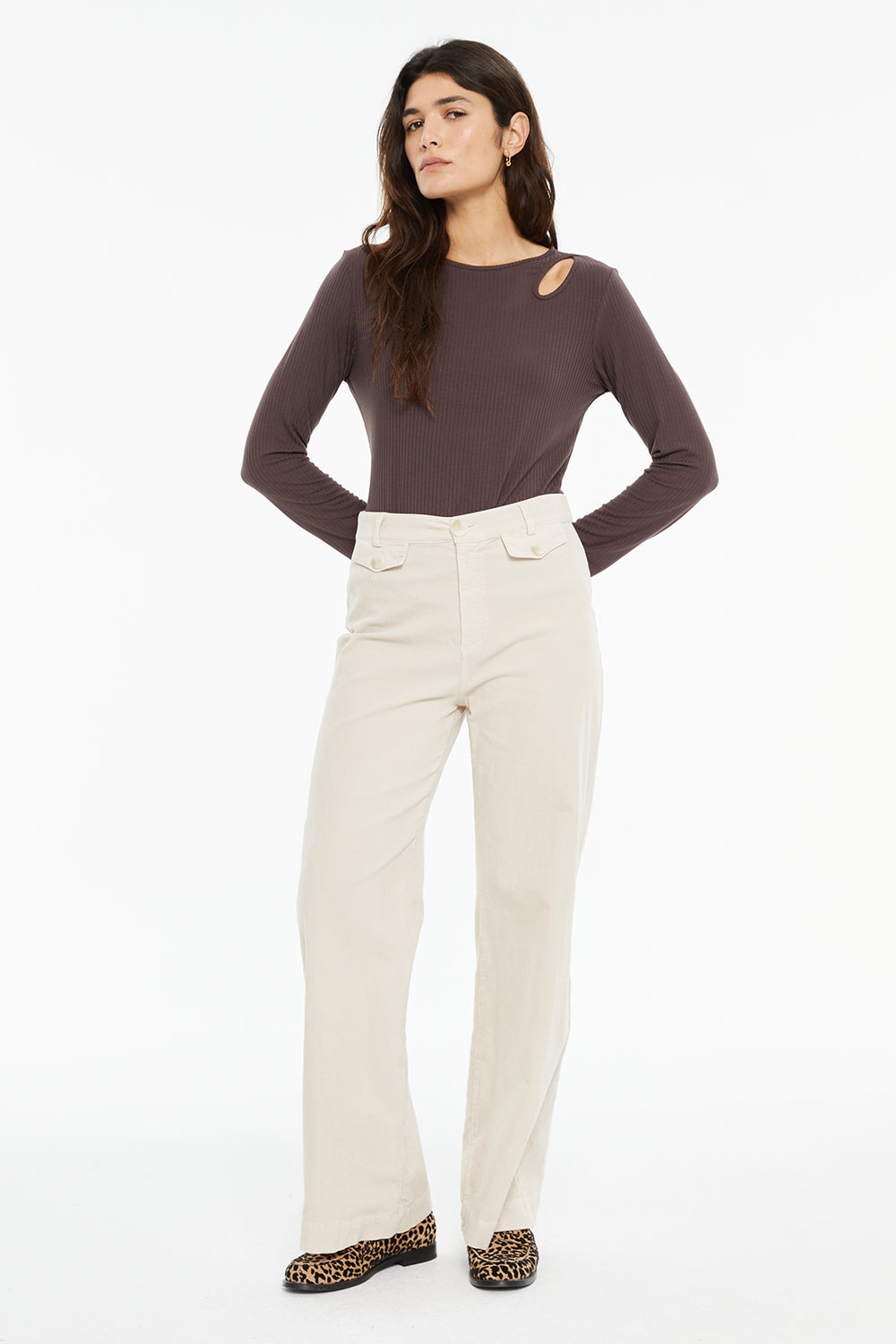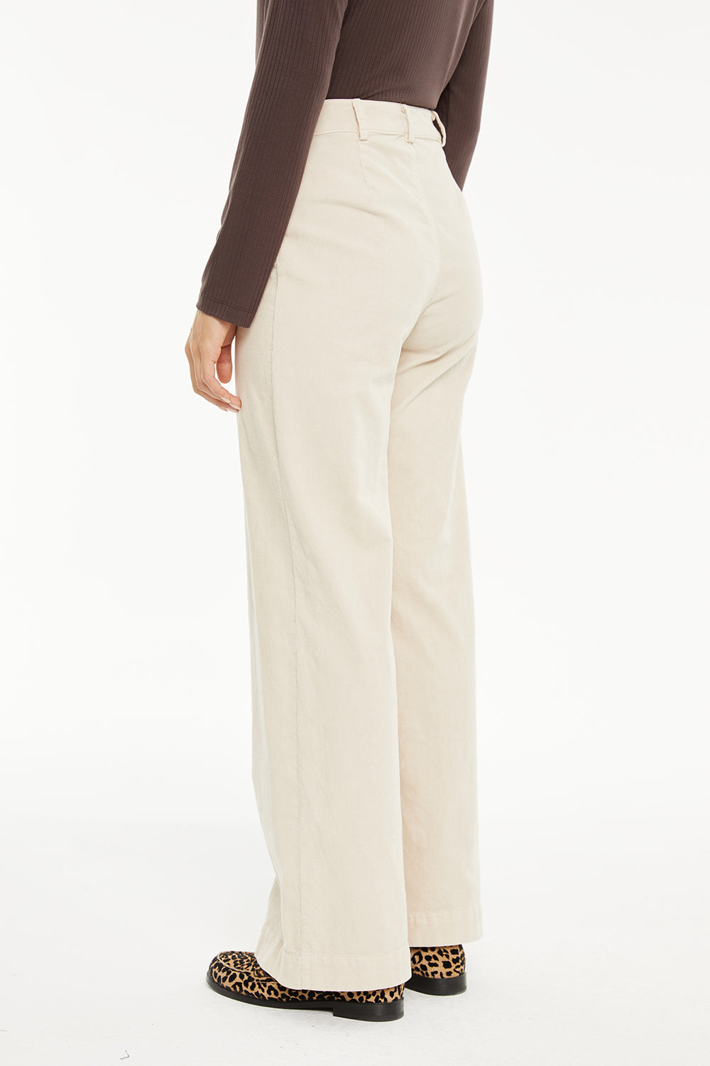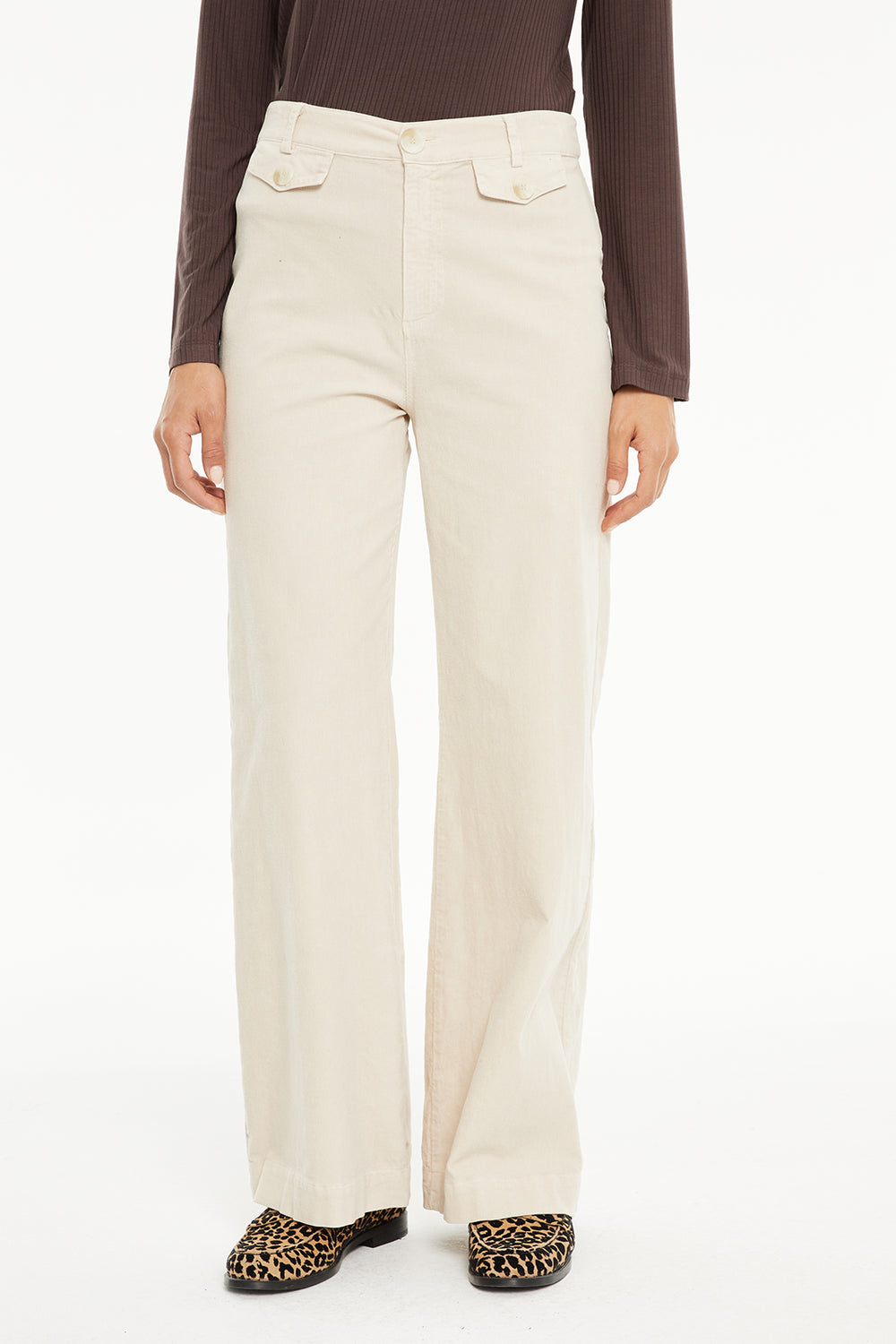 Pantalón de mujer con tejido de micropana, detalle de bolsillos con tapeta y botón en el delantero. Cierre con botón. Prenda sostenible.