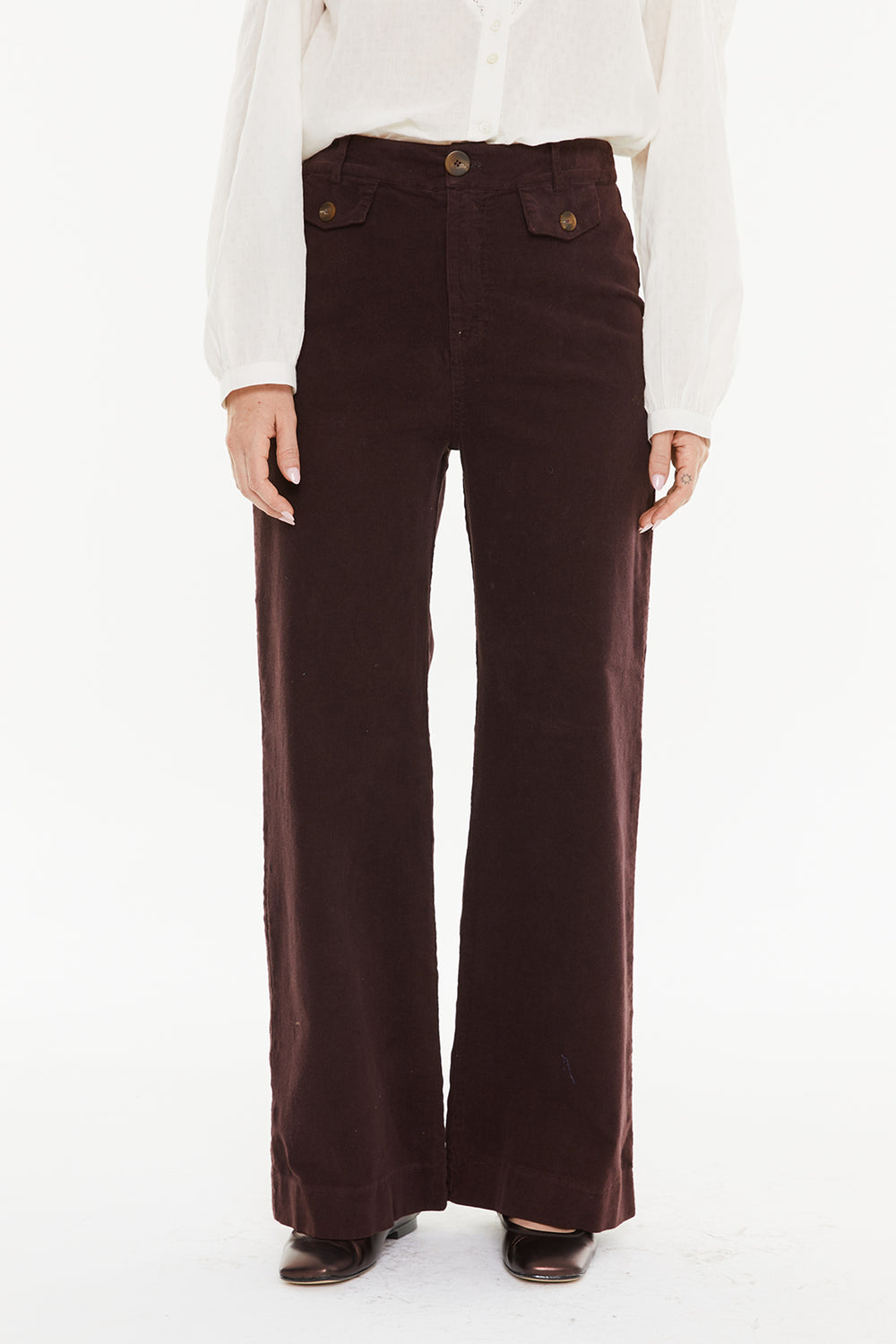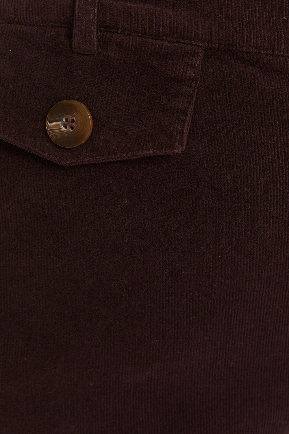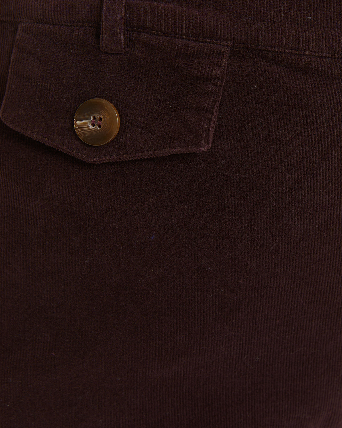 Pantalón de mujer con tejido de micropana, detalle de bolsillos con tapeta y botón en el delantero. Cierre con botón. Prenda sostenible.