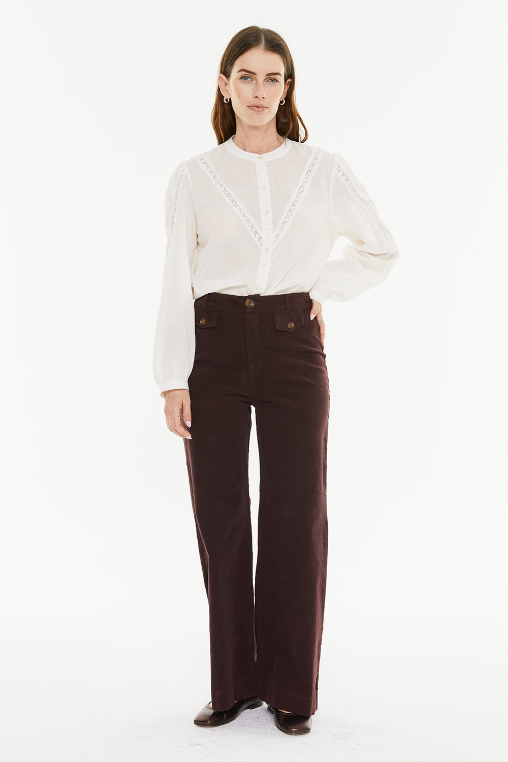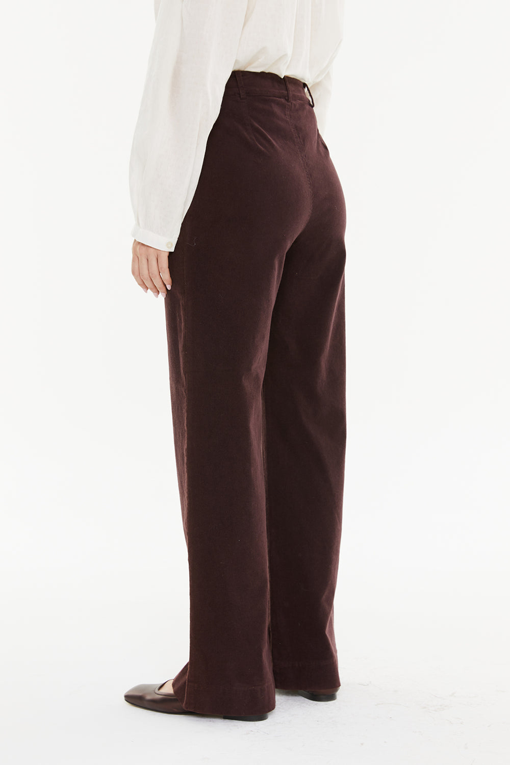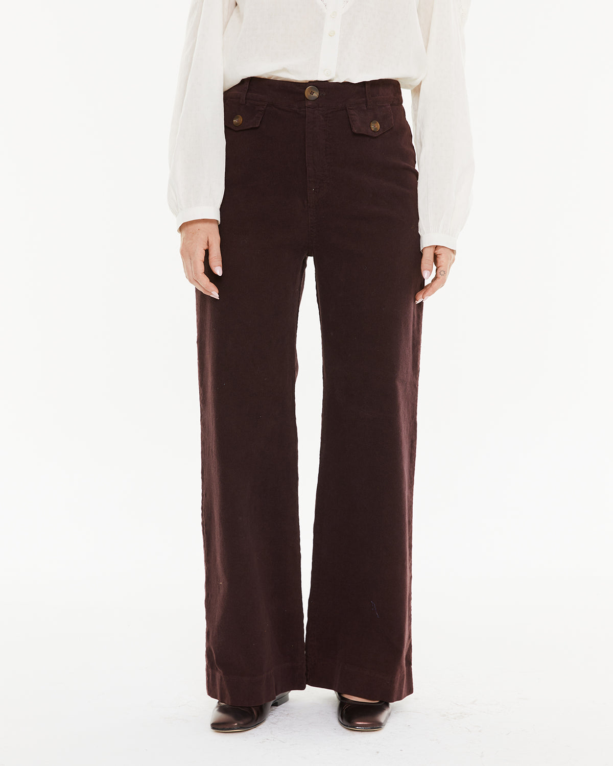 Pantalón de mujer con tejido de micropana, detalle de bolsillos con tapeta y botón en el delantero. Cierre con botón. Prenda sostenible.