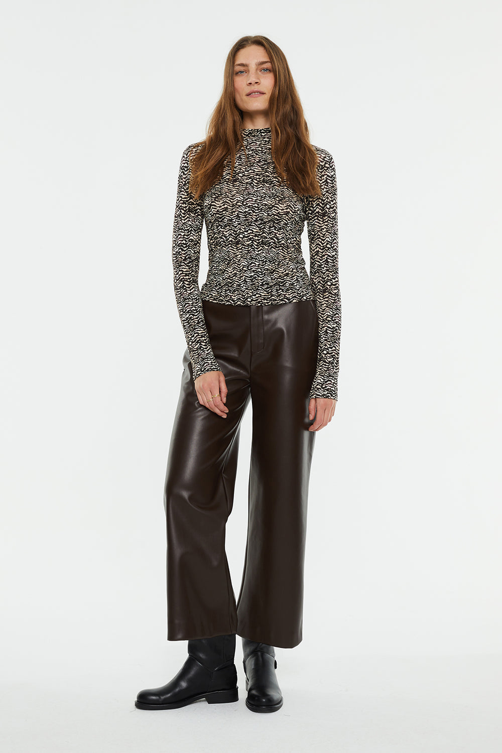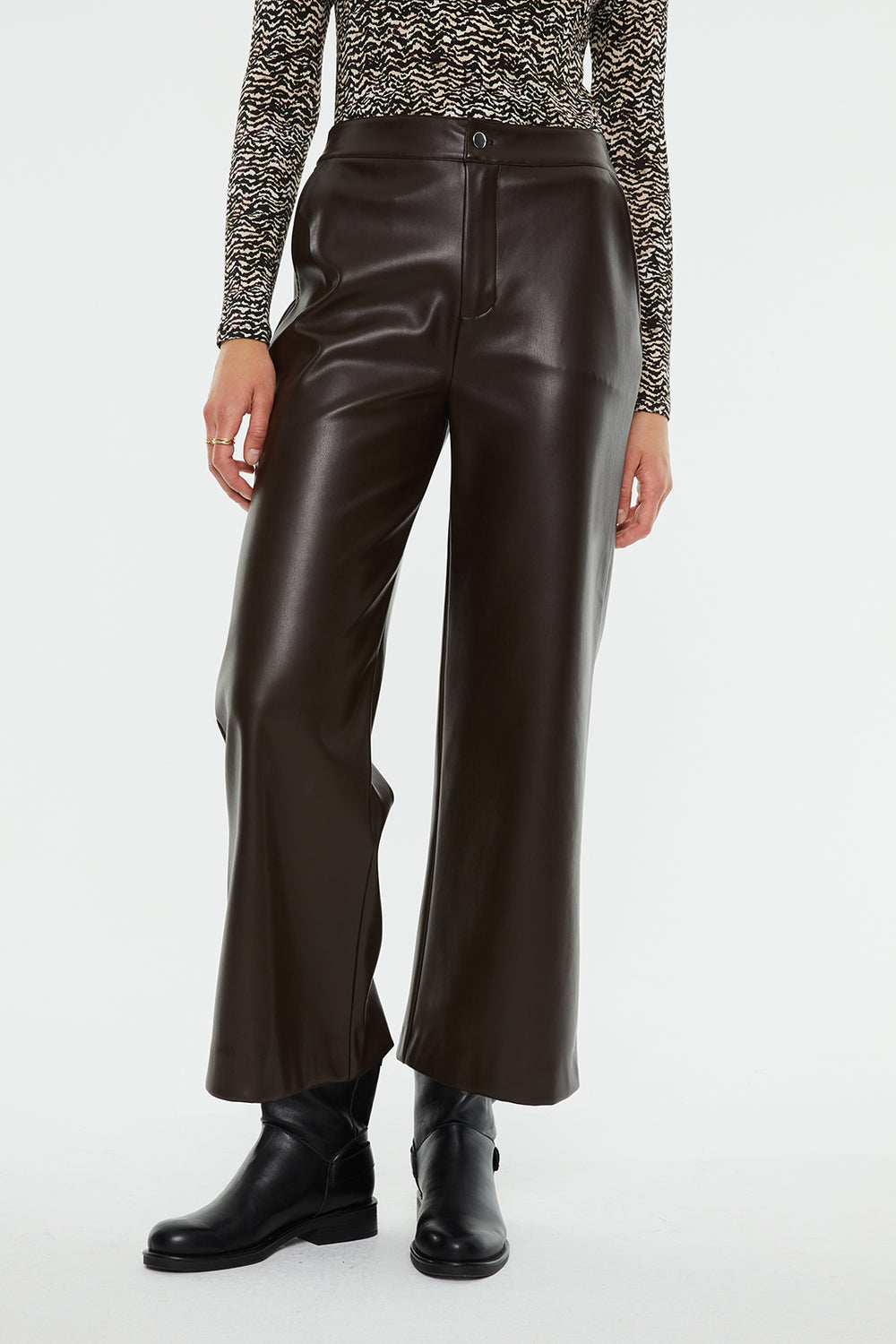 Pantalón de mujer recto efecto piel con bolsillos en el delantero y goma en la cinturilla.
