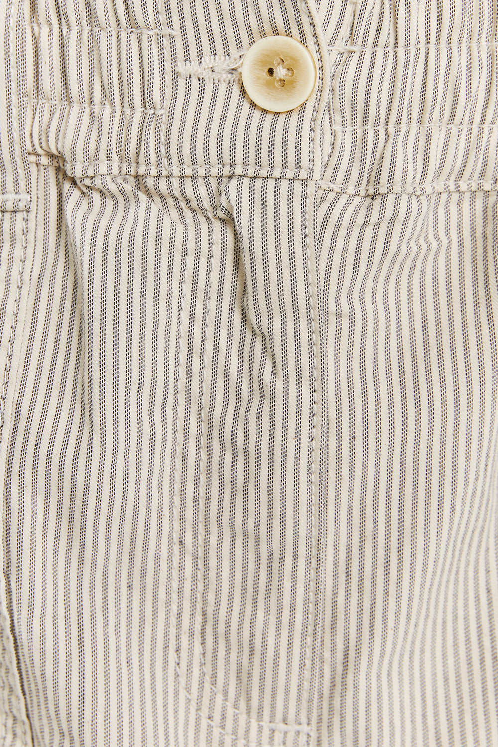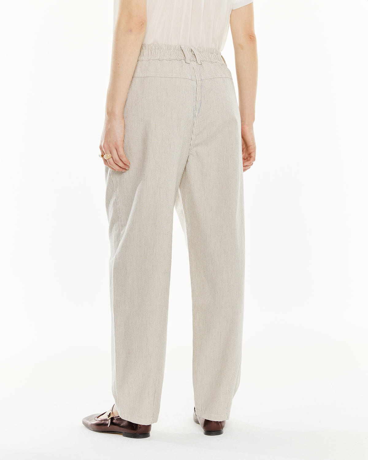 Pantalón de rayas de mujer con goma en la cintura y botón. Detalle de bolsillos grandes en el delantero.