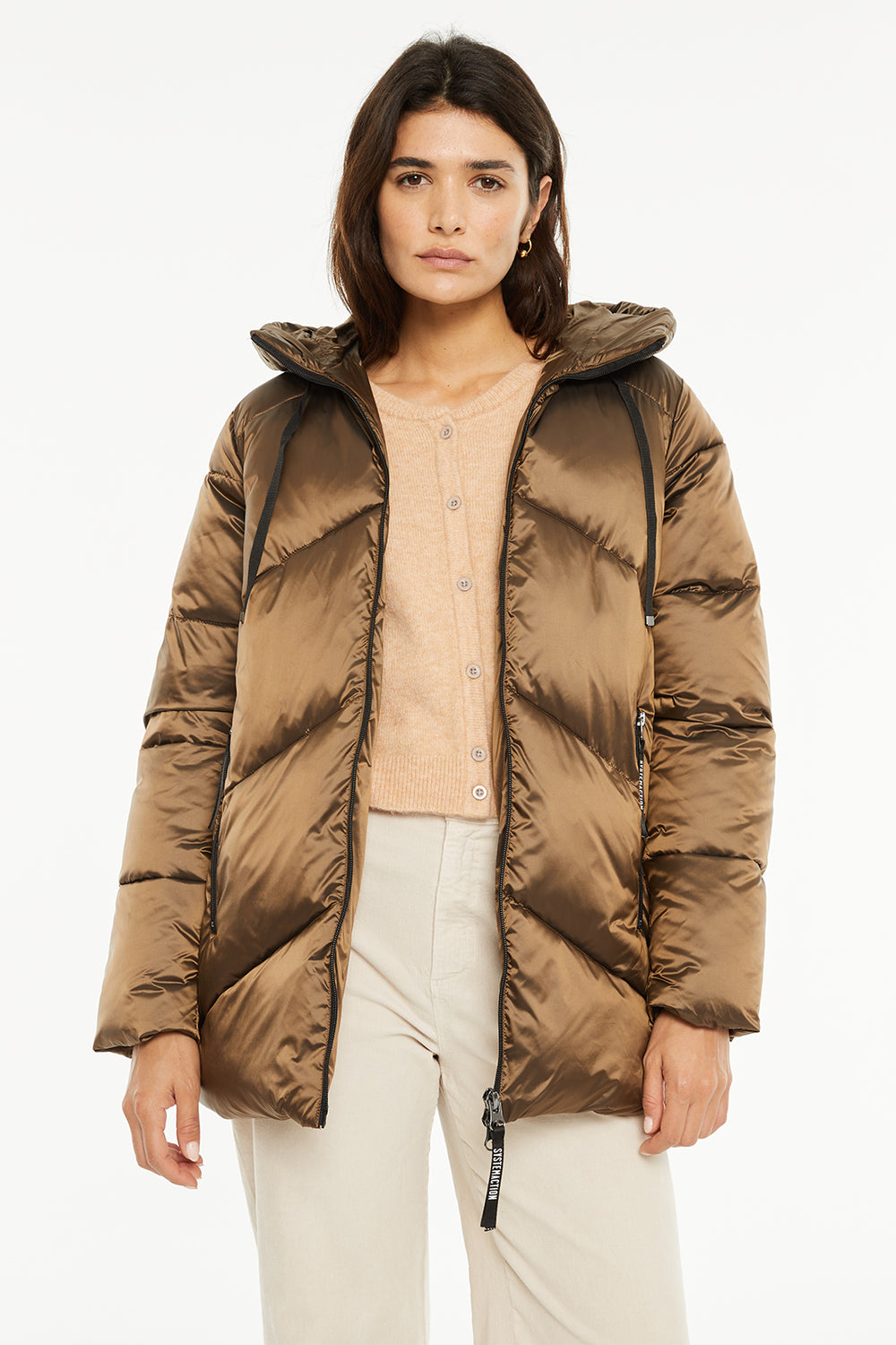 Plumón de mujer con capucha y cordón. Cierre con cremallera. Efecto metalizado.