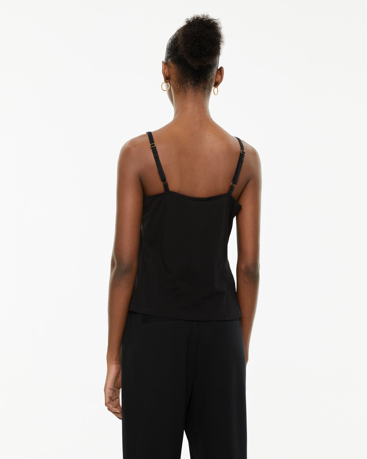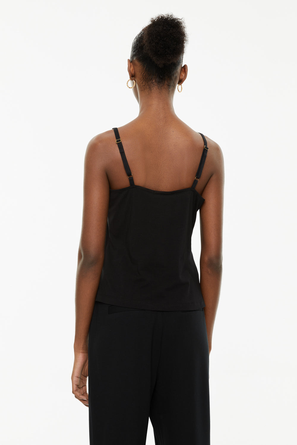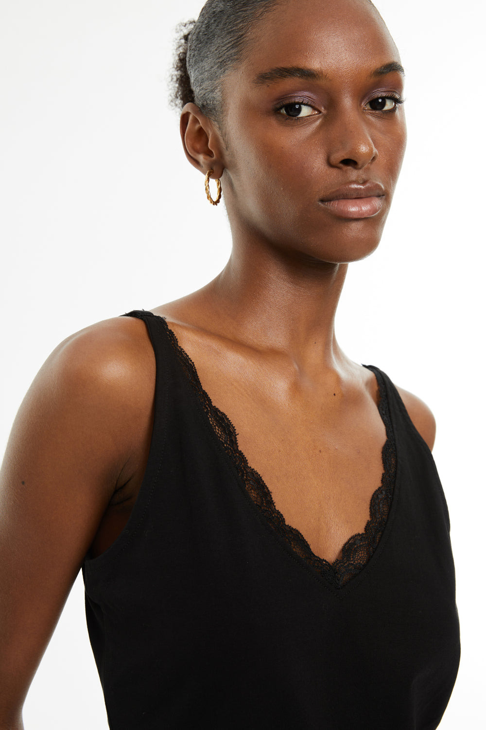 Top básico de mujer, ajustado, de tirantes, con escote pico y puntilla. Tejido algodón