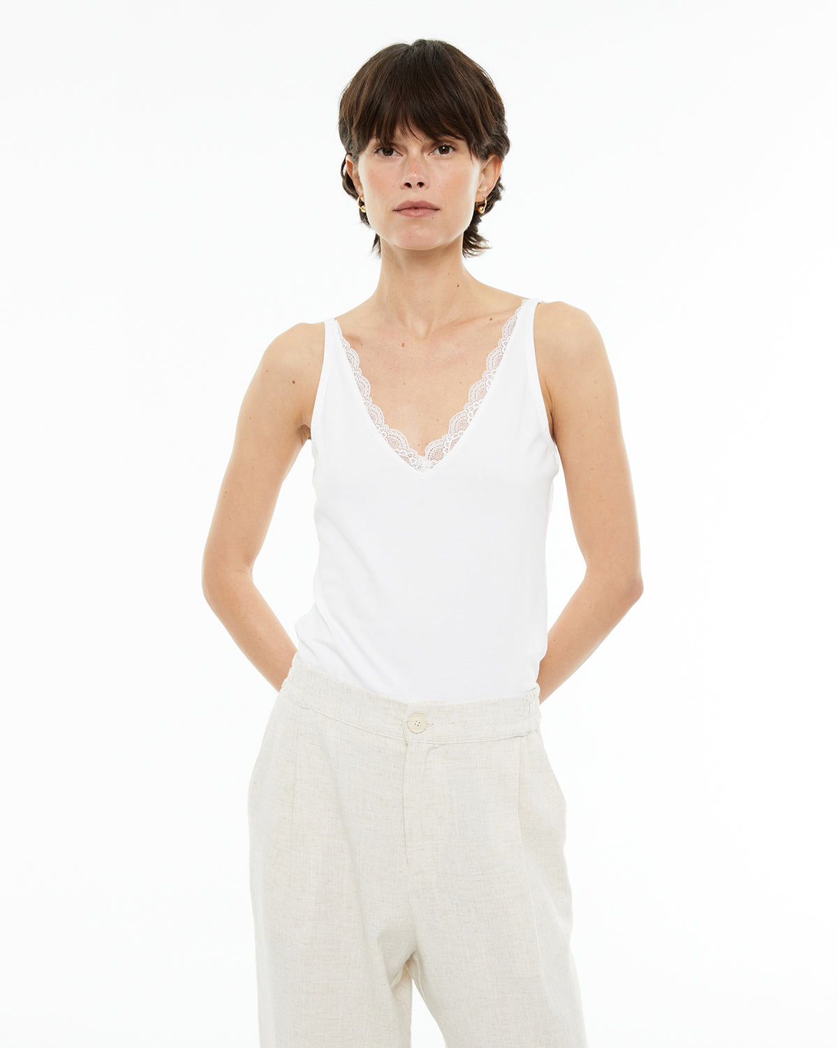 Top básico de mujer, ajustado, de tirantes, con escote pico y puntilla. Tejido algodón