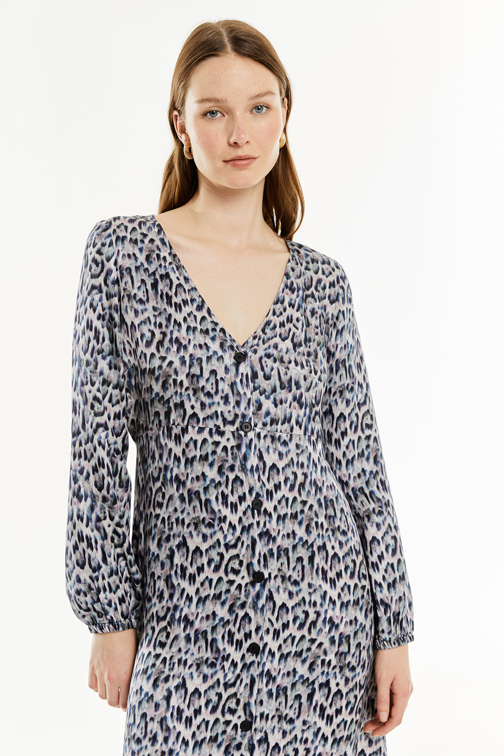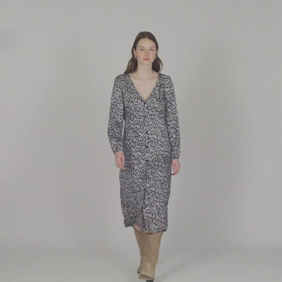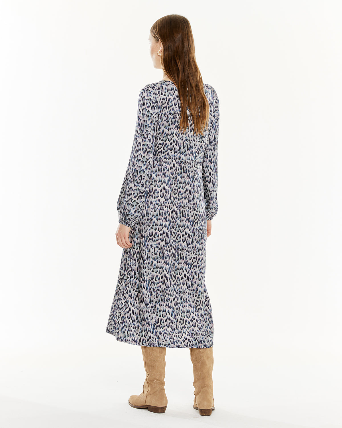 Vestido midi de mujer, con estampado animal print, escote pico y manga larga con goma en los puños. Prenda sostenible.